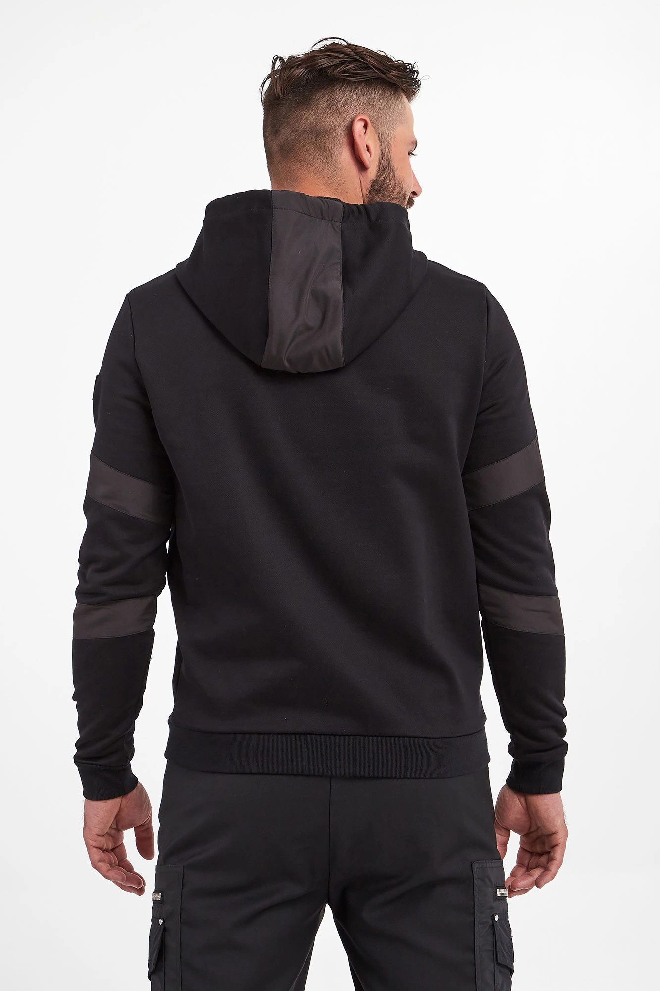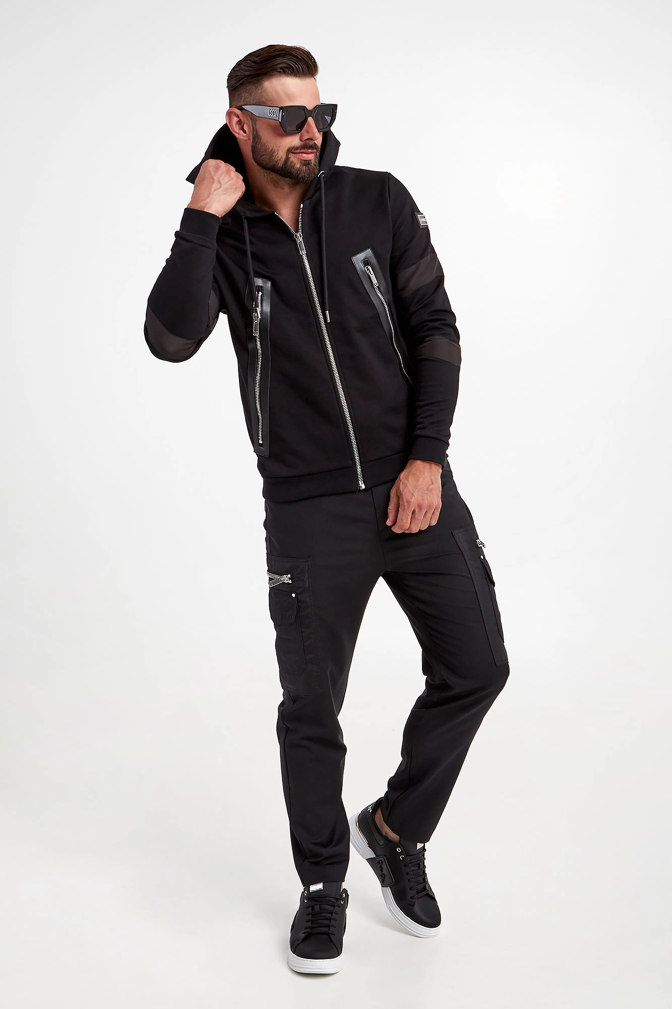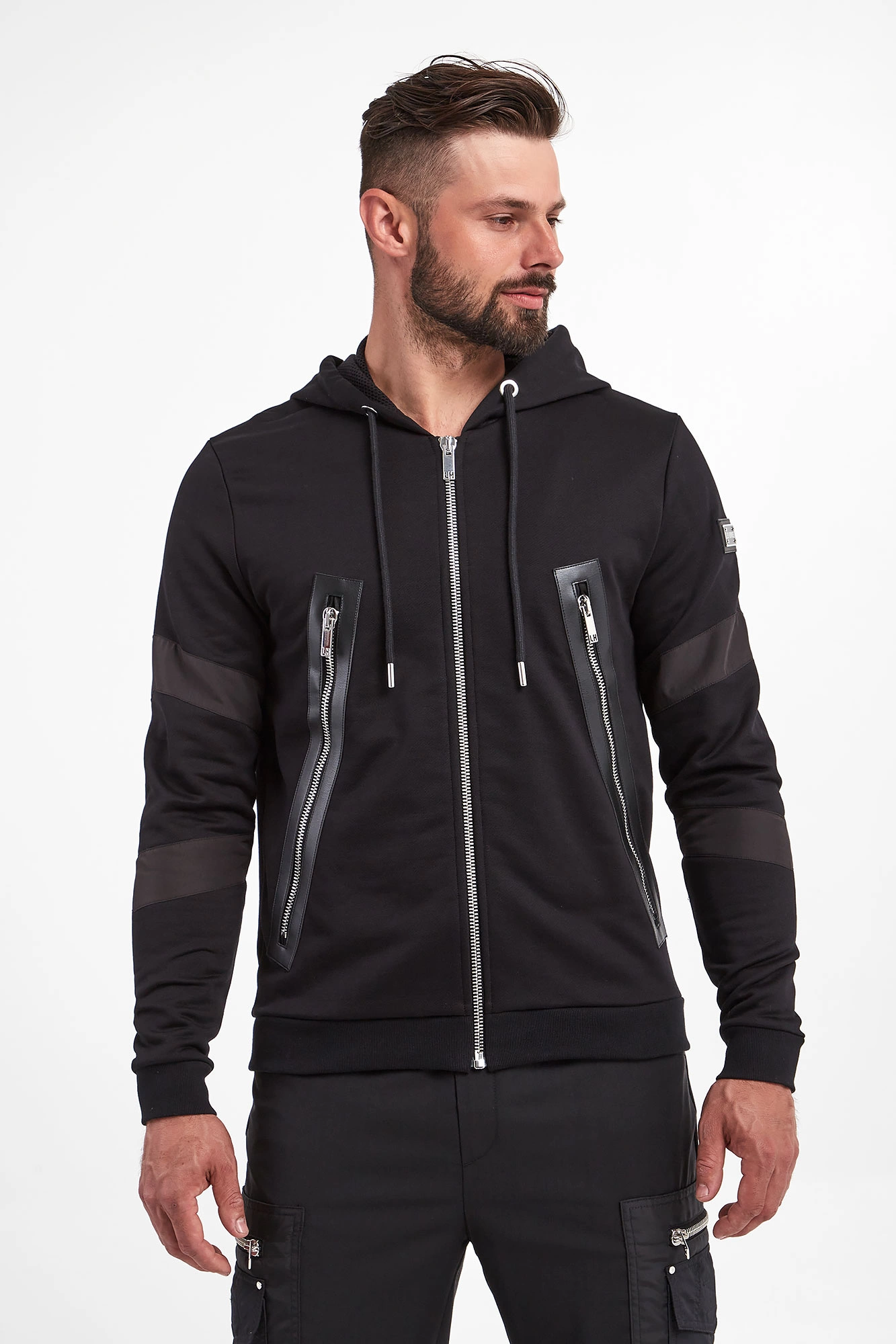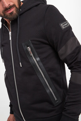 Bluza z kapturem marki Les Hommes w czarnym kolorze. Fason regular fit. Zapinana za pomocą srebrnego zamka z logowaną zawieszką. Na lewym rękawie metalowa aplikacja z nazwą marki. Dwie, duże boczne kieszenie obszyte dookoła czarną skórą ekologiczną, zapinane na srebrny zamek z logowaną zawieszką. Rękawy oraz dół wykończone ściągaczem. Kaptur regulowany za pomocą troczków z siatkowaną wyściółką. Wykonana z merceryzowanej bawełny.