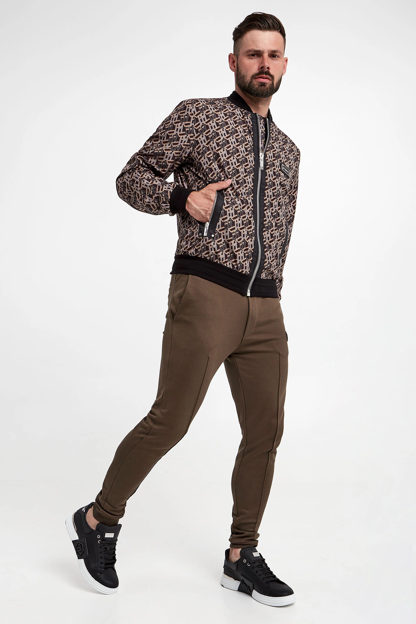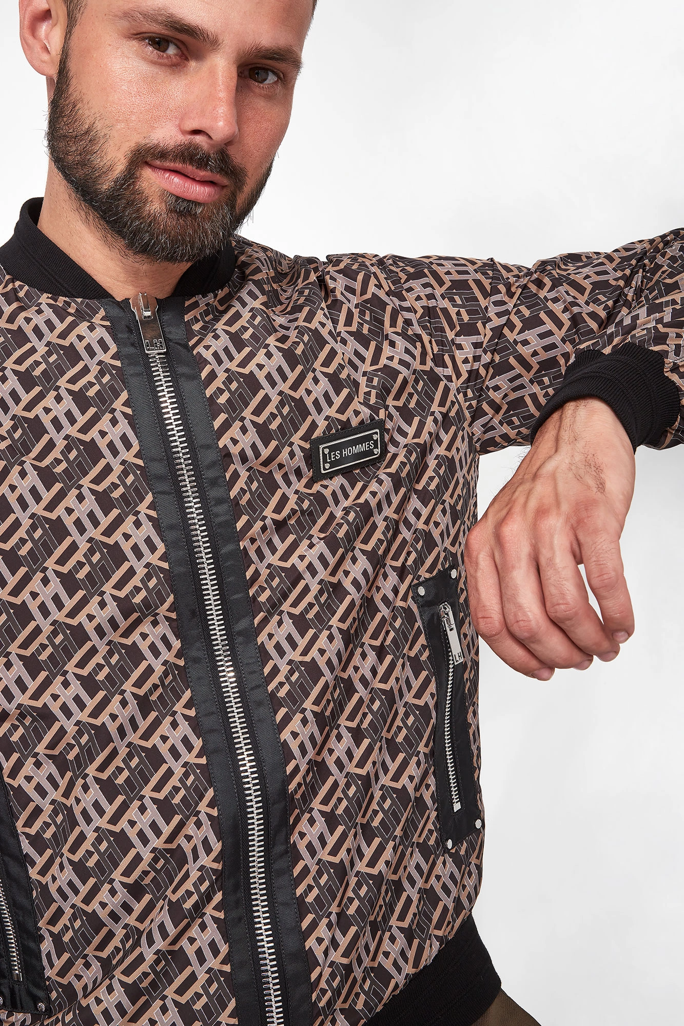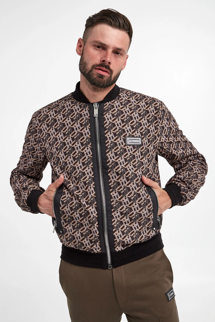 Bomberka marki Les Hommes. Prosty fason regular fit. Czarna, pokryta wzorem z monogramem marki w różnych odcieniach zieleni. Z boku aplikacja z logo. Zapinana na masywny, sygnowany, srebrny zamek. Dekolt wykończony elastyczną stójką. Z przodu dwie kieszenie zapinane na zamki z czarnymi wstawkami. Rękawy i dół wykończone elastycznymi ściągaczami. Wykonana z lekkiego materiału.