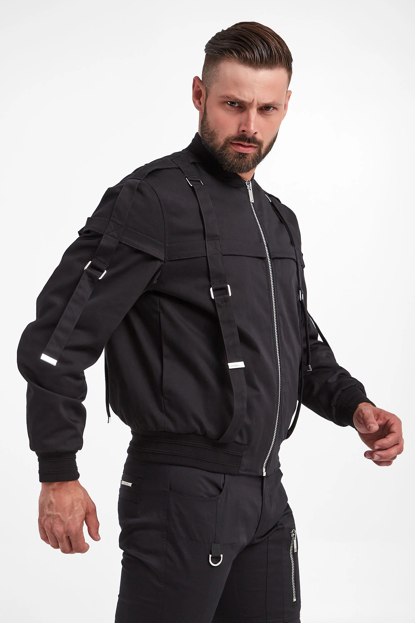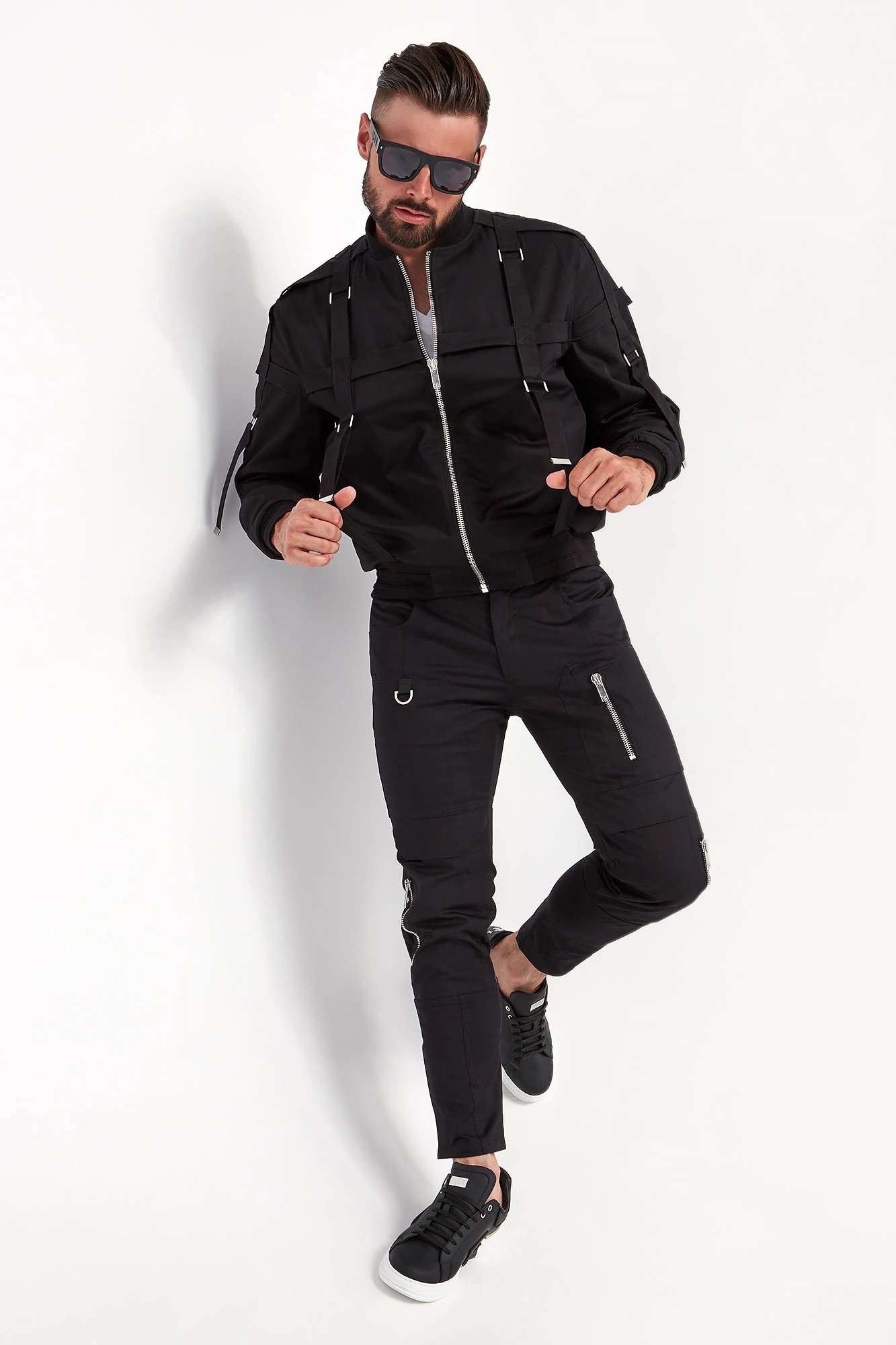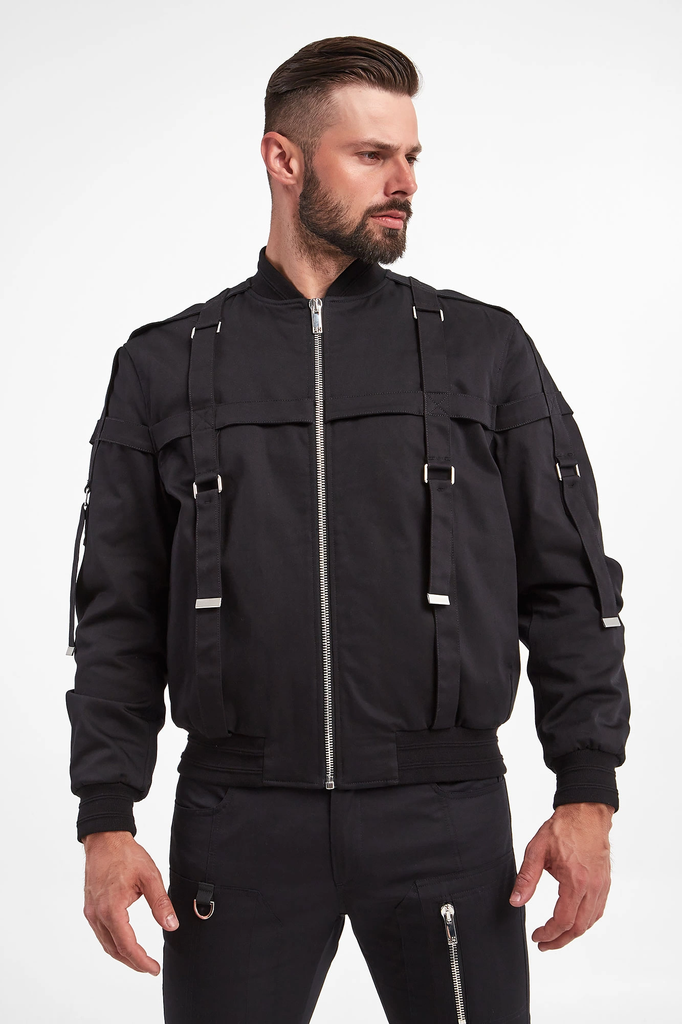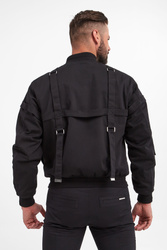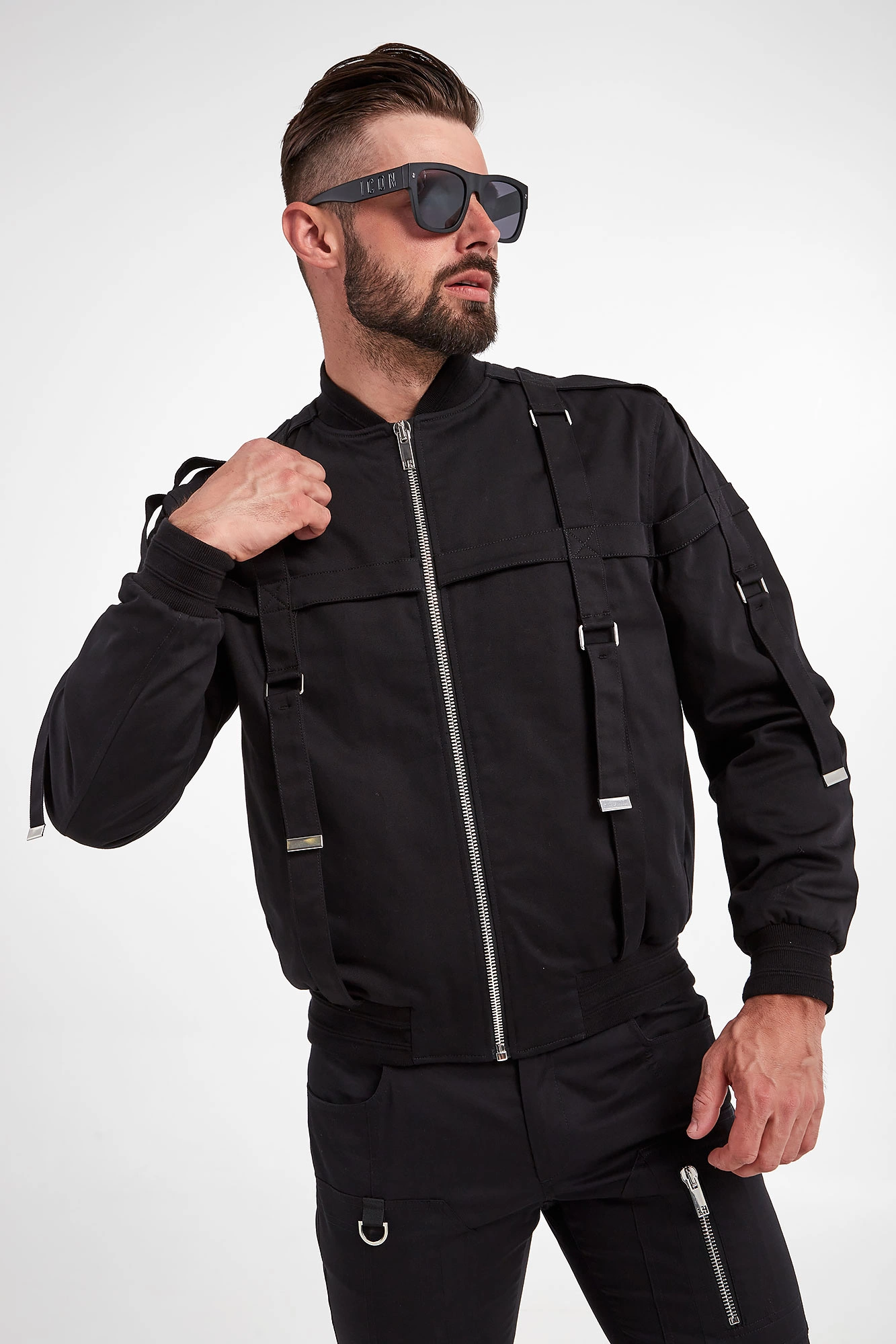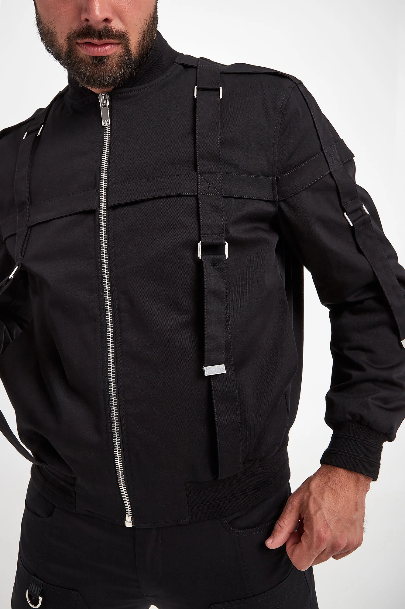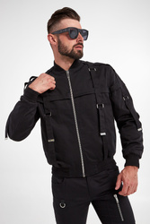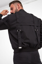 Bomberka marki Les Hommes w czarnym kolorze. Fason typu relaxed fit. Ze stójką. Na całości ozdobne paski i klamry. Model z dwoma kieszeniami. Zapinane za pomocą zamka błyskawicznego w srebrnym kolorze. Długie rękawy i dół wykończone elastycznym ściągaczem. Wewnątrz dodatkowa kieszeń. Wykonana z bawełnianej tkaniny.