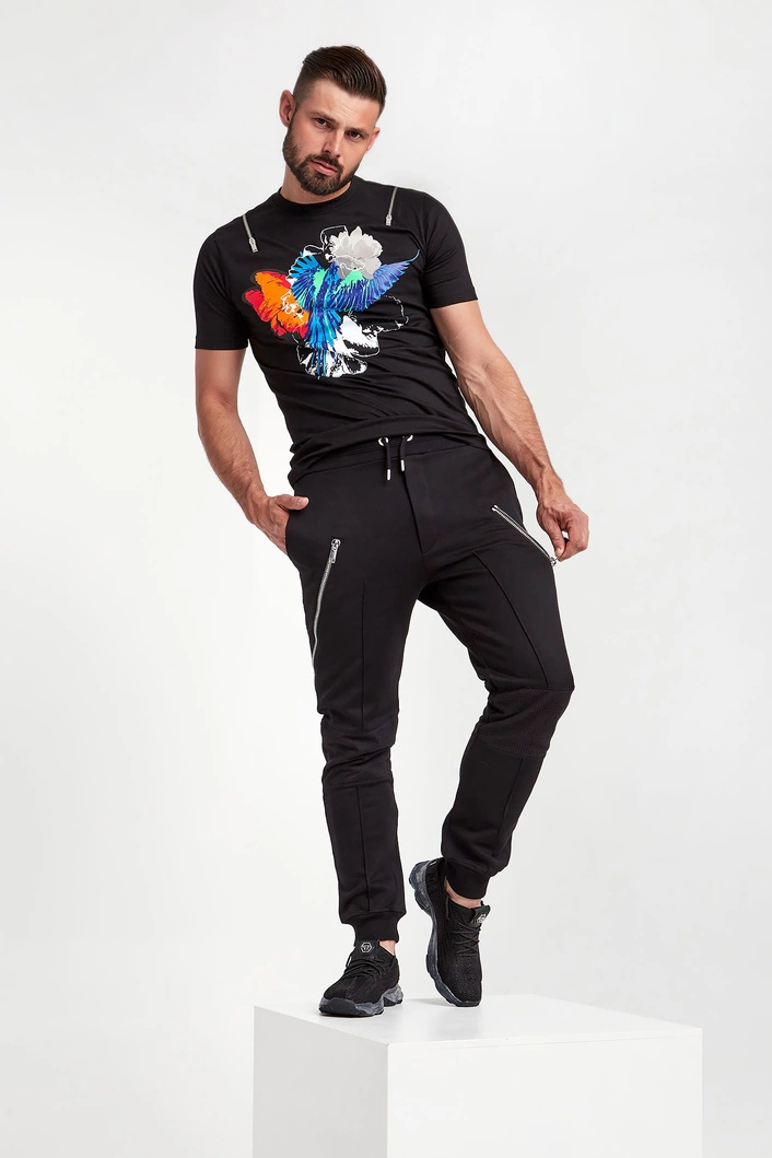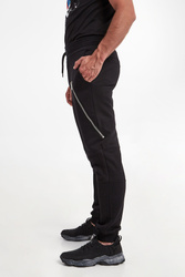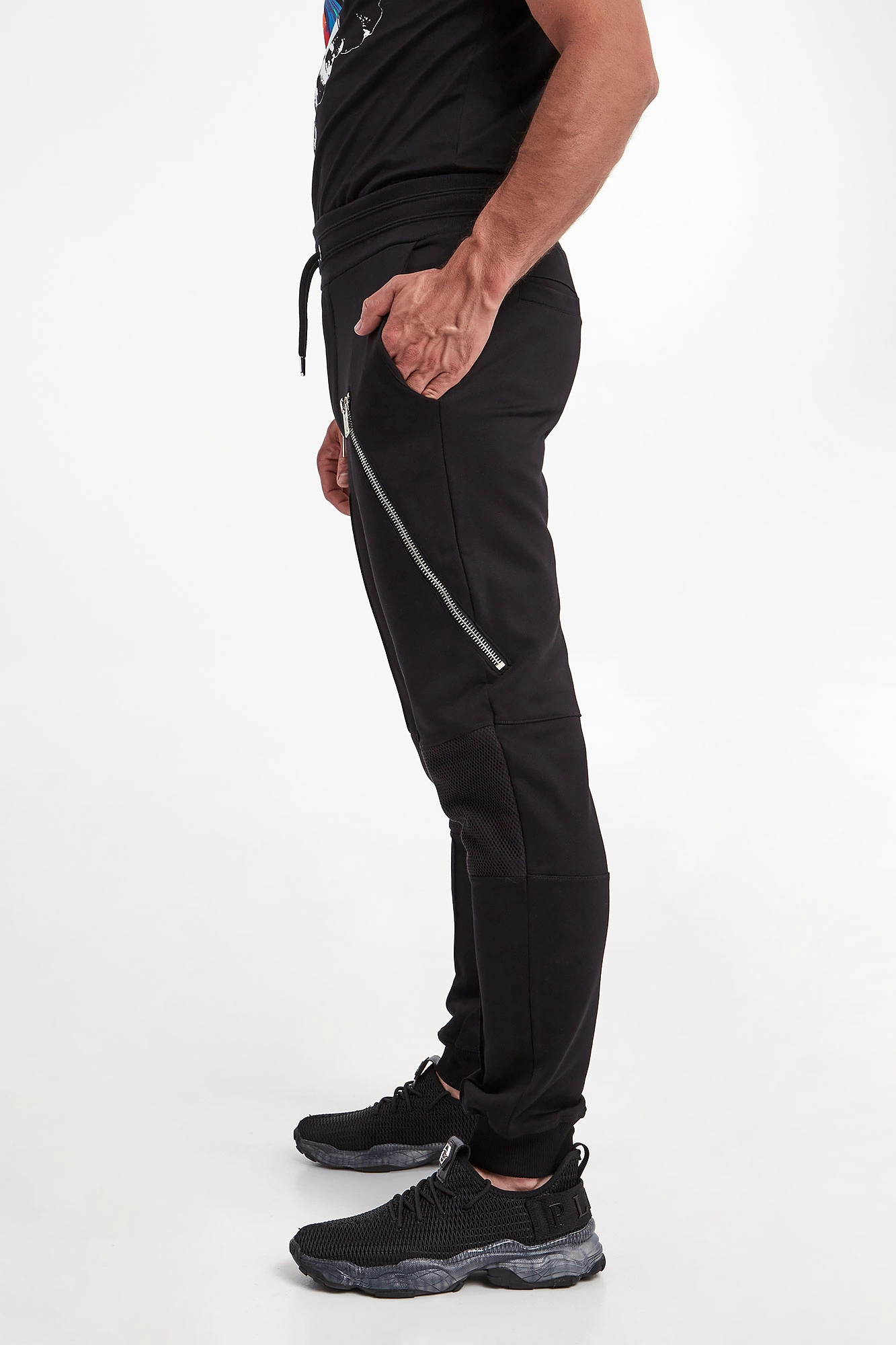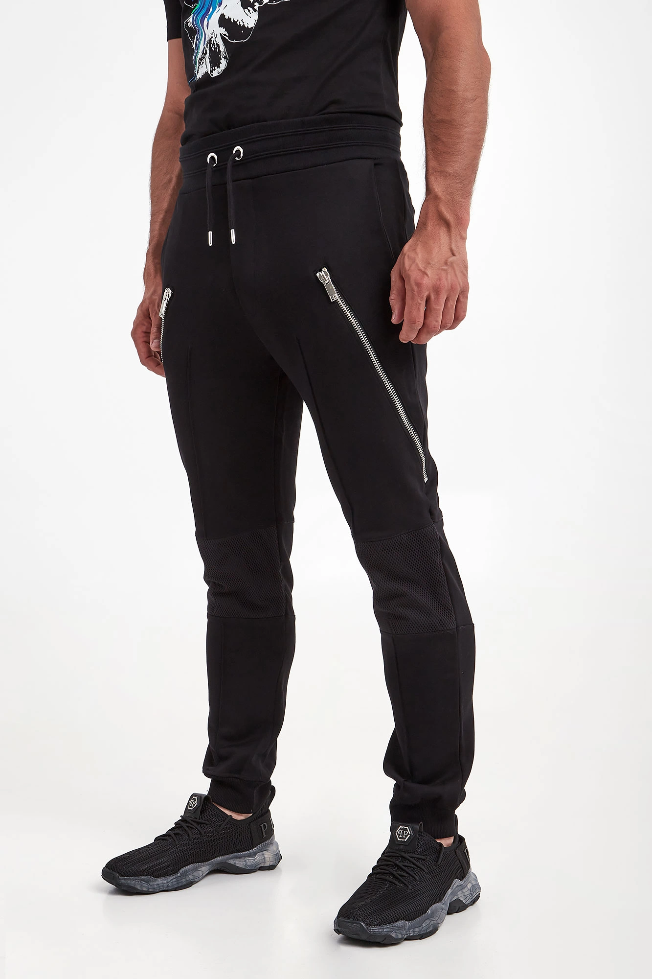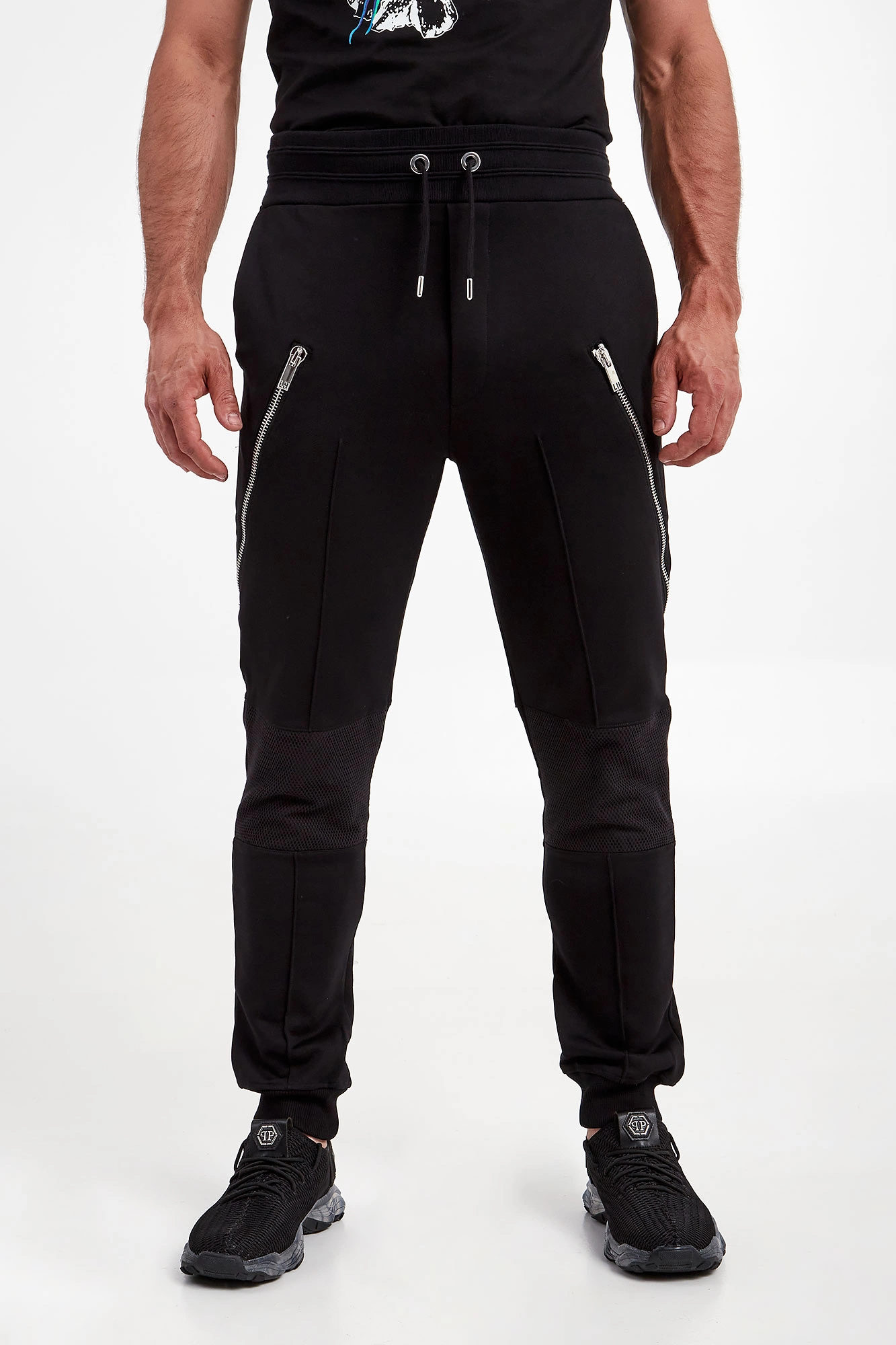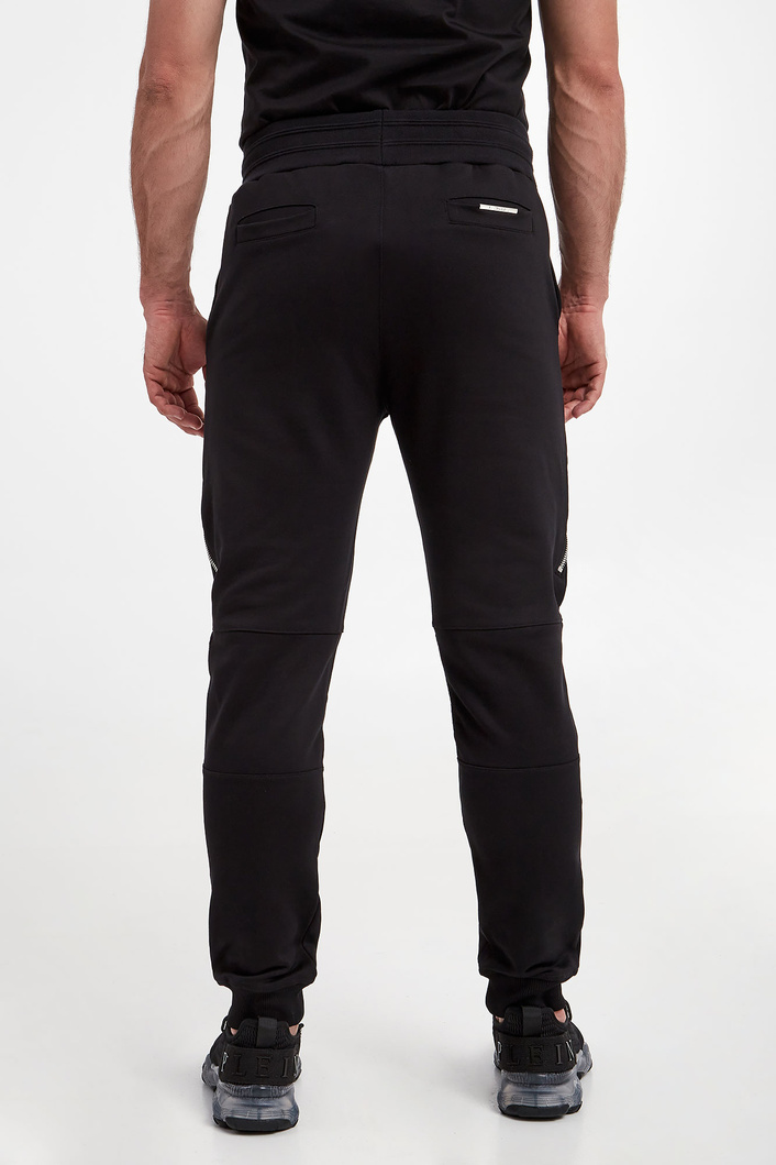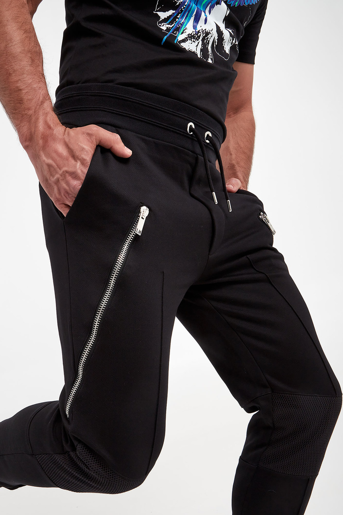 Czarne spodnie dresowe marki Les Hommes. Fason typu jogger. U góry elastyczny pas regulowany za pomocą troczków ze srebrnymi stoperami. Model z sześcioma kieszeniami, z czego dwie zapinane za pomocą zamków w srebrnym kolorze. Na lewej nogawce aplikacja z nazwą marki. Nogawki wykończone ściągaczem. Z przodu przeszyty kant i wstawka siatkowanej tkaniny. Wykonane z merceryzowanej bawełny.