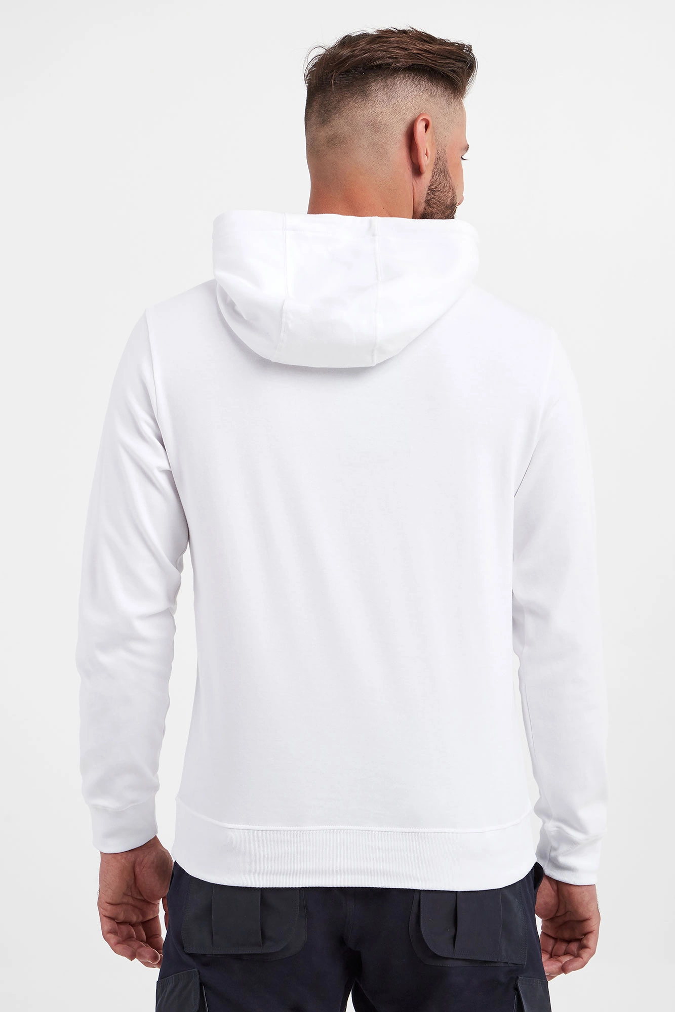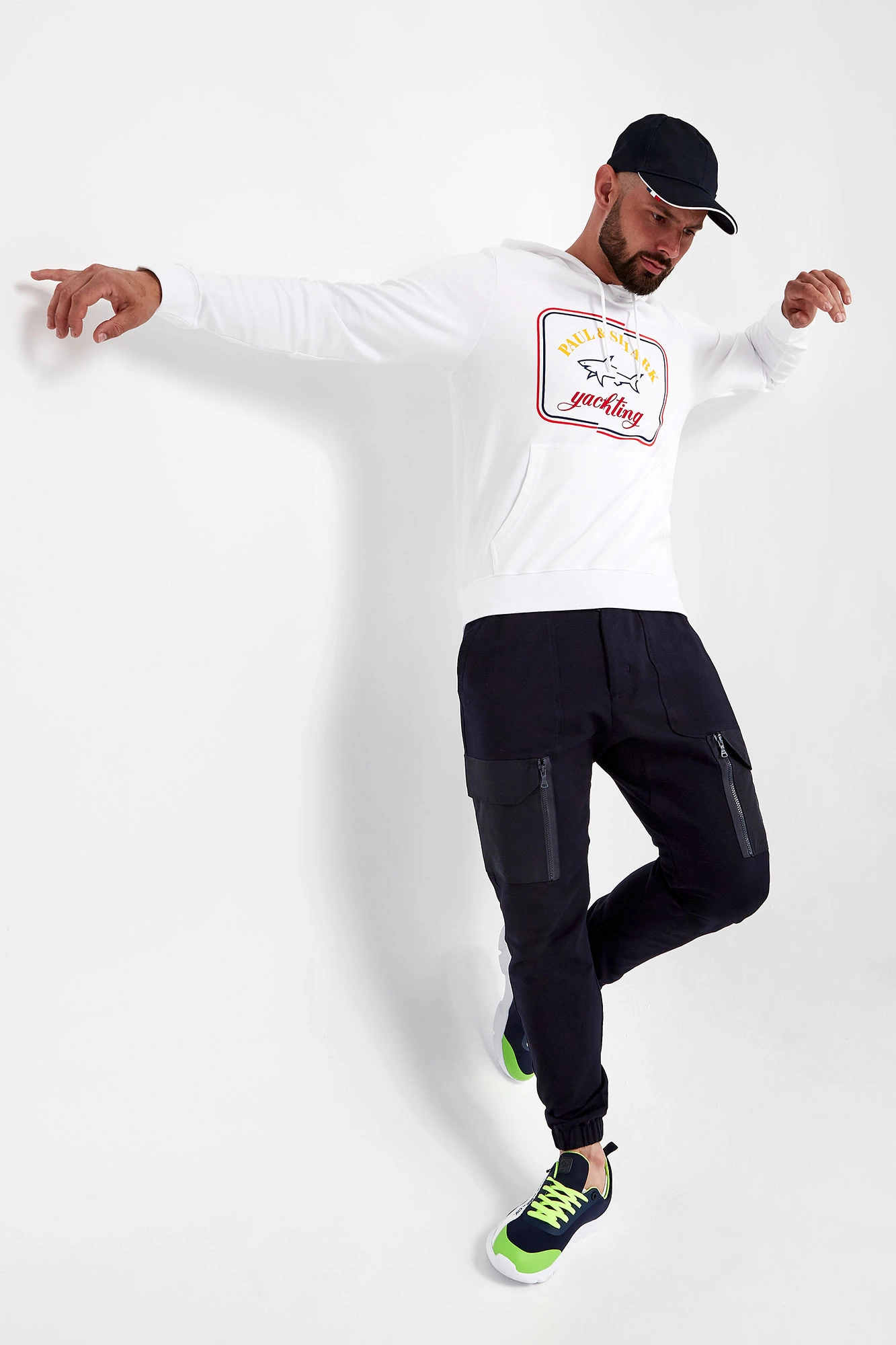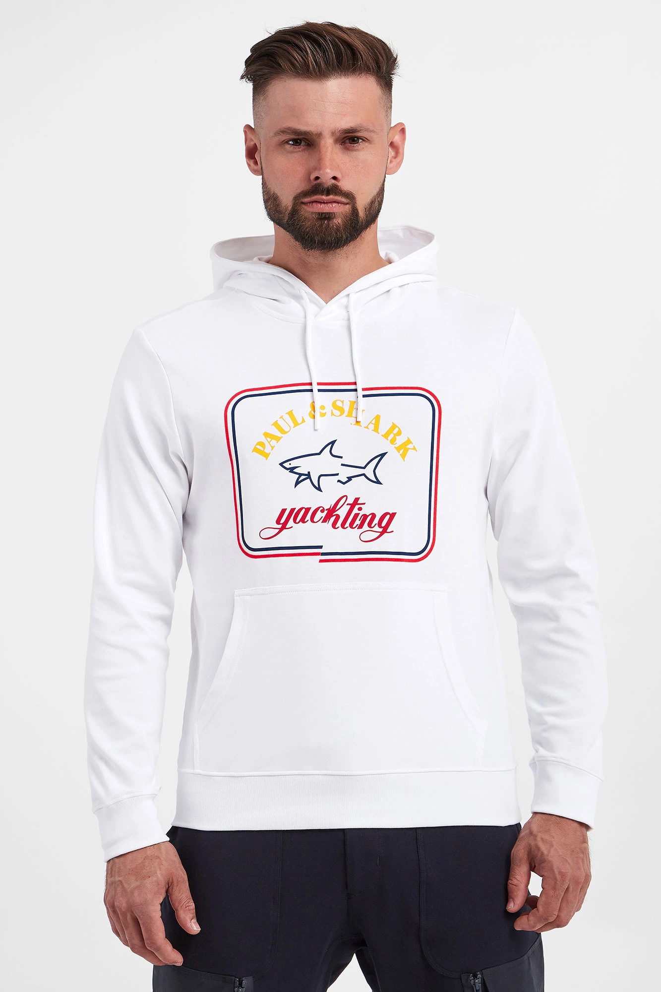 Bluza marki Paul&Shark w białym kolorze. Z kapturem regulowanym za pomocą troczków w białym kolorze. Fason typu slim. Z przodu kangurkowa kieszeń i kolorowy nadruk z logo i nazwą marki. Długie rękawy i dół wykończone elastycznym ściągaczem. Wykonana z elastycznej bawełny.
