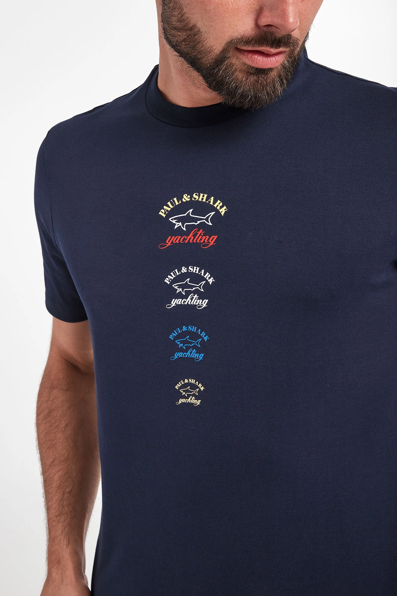 T-shirt marki Paul&Shark w granatowym kolorze. Fason typu regular fit. Dekolt typu o-neck wykończony elastycznym ściągaczem. Z przodu nadruk z nazwą i logo marki. Wykonany z czystej bawełny.