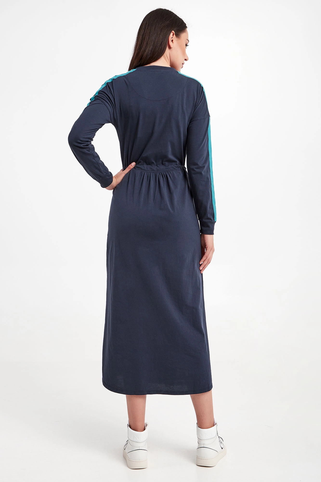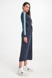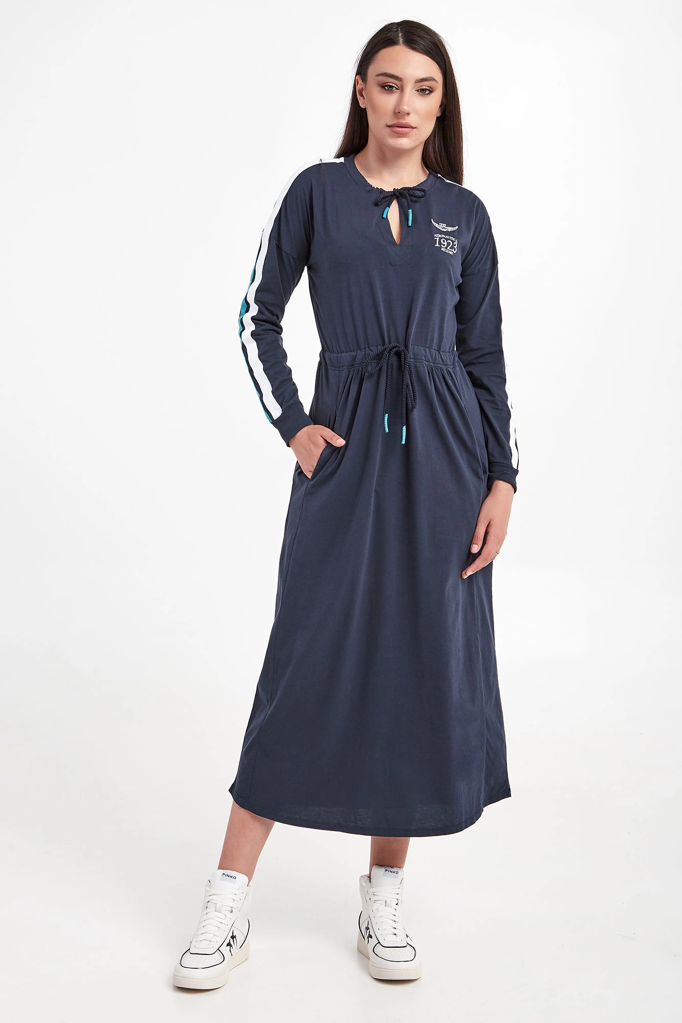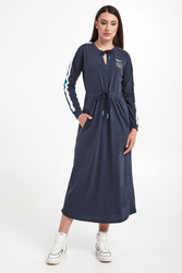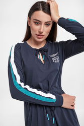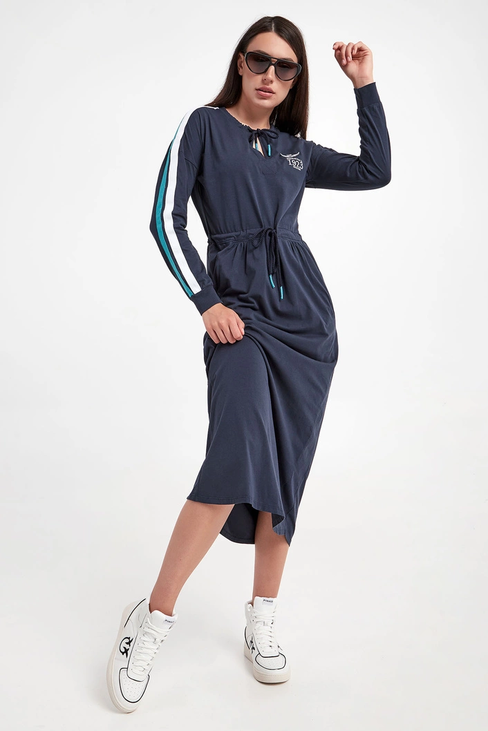 Sukienka marki Aeronautica Militare w granatowym kolorze. Fason relaxed fit, o długości midi. Z przodu biały haft z logo i nazwą marki. Dekolt i pas wykończone ściągaczem regulowanym za pomocą troczków. Obniżona linia ramion. Na rękawach dwukolorowy lampas. Długie rękawy zakończone elastycznym ściągaczem. Wykonana z czystej bawełny.
