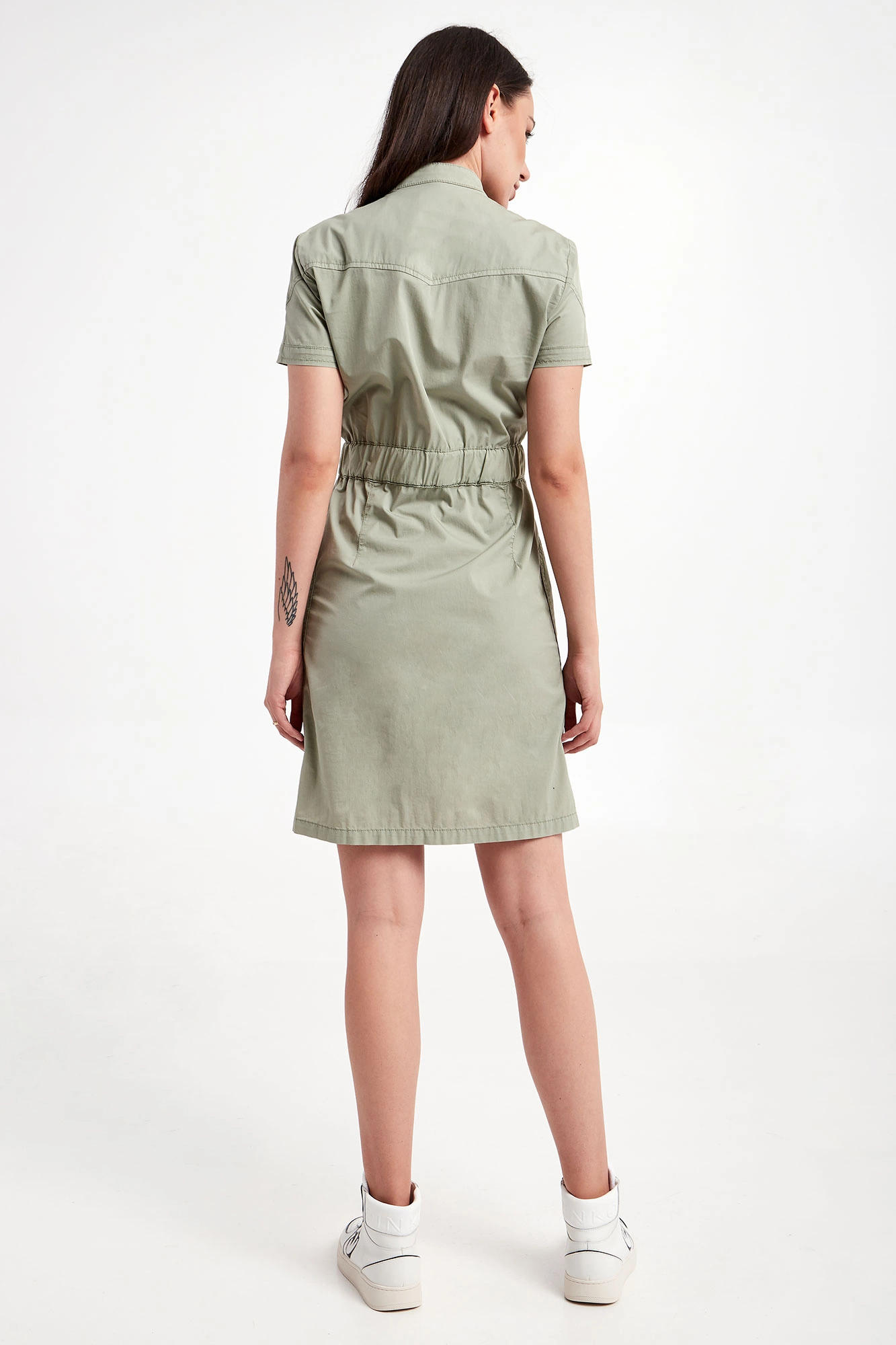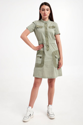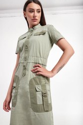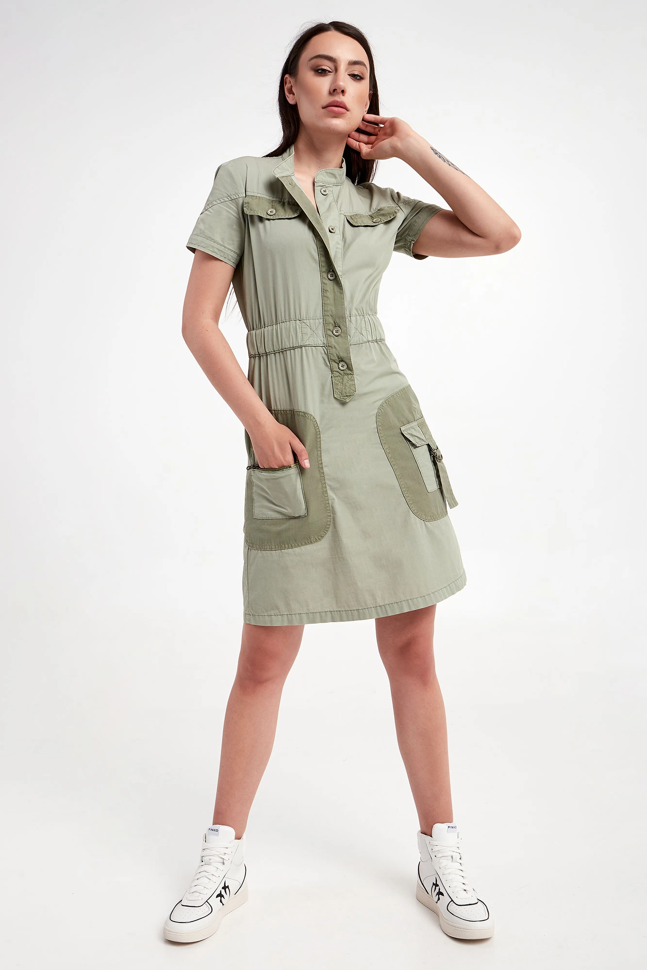 Sukienka marki Aeronautica Militare w zielonym kolorze. Fason typu regular fit, o długości mini. Zapinana za pomocą guzików. Ze stójka. Model z dwoma kieszeniami i dwoma patkami imitującymi kieszeń. Z przodu naszywka i haft z logo i nazwą marki. Wykonana z elastycznej bawełny.