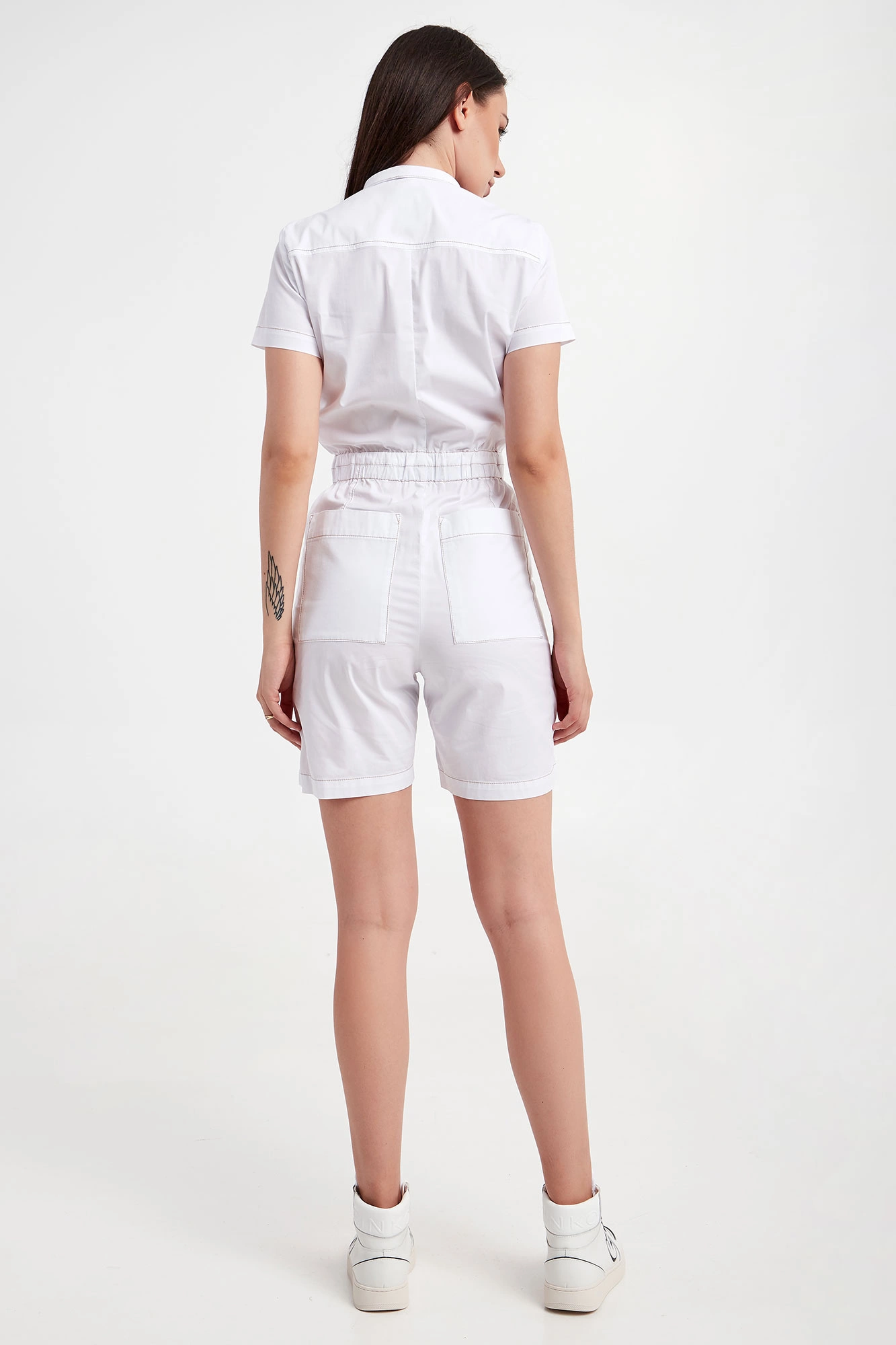 Kombinezon marki Aeronautica Militare w białym kolorze. Fason typu regular fit. Dekolt wykończony klasycznym stójką. Zapinany za pomocą zamka. Model z sześcioma kieszeniami. Na przednich kieszeniach i z boku hafty z logo marki oraz monogramem. W pasie ściągacz. Krótkie rękawy i nogawki zakończone lamówką. Wykonany z bawełnianej tkaniny z dodatkiem elastycznych włókien.