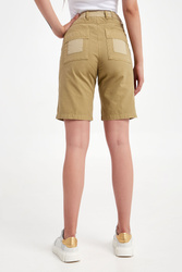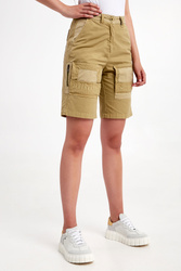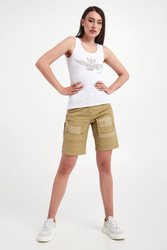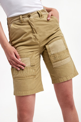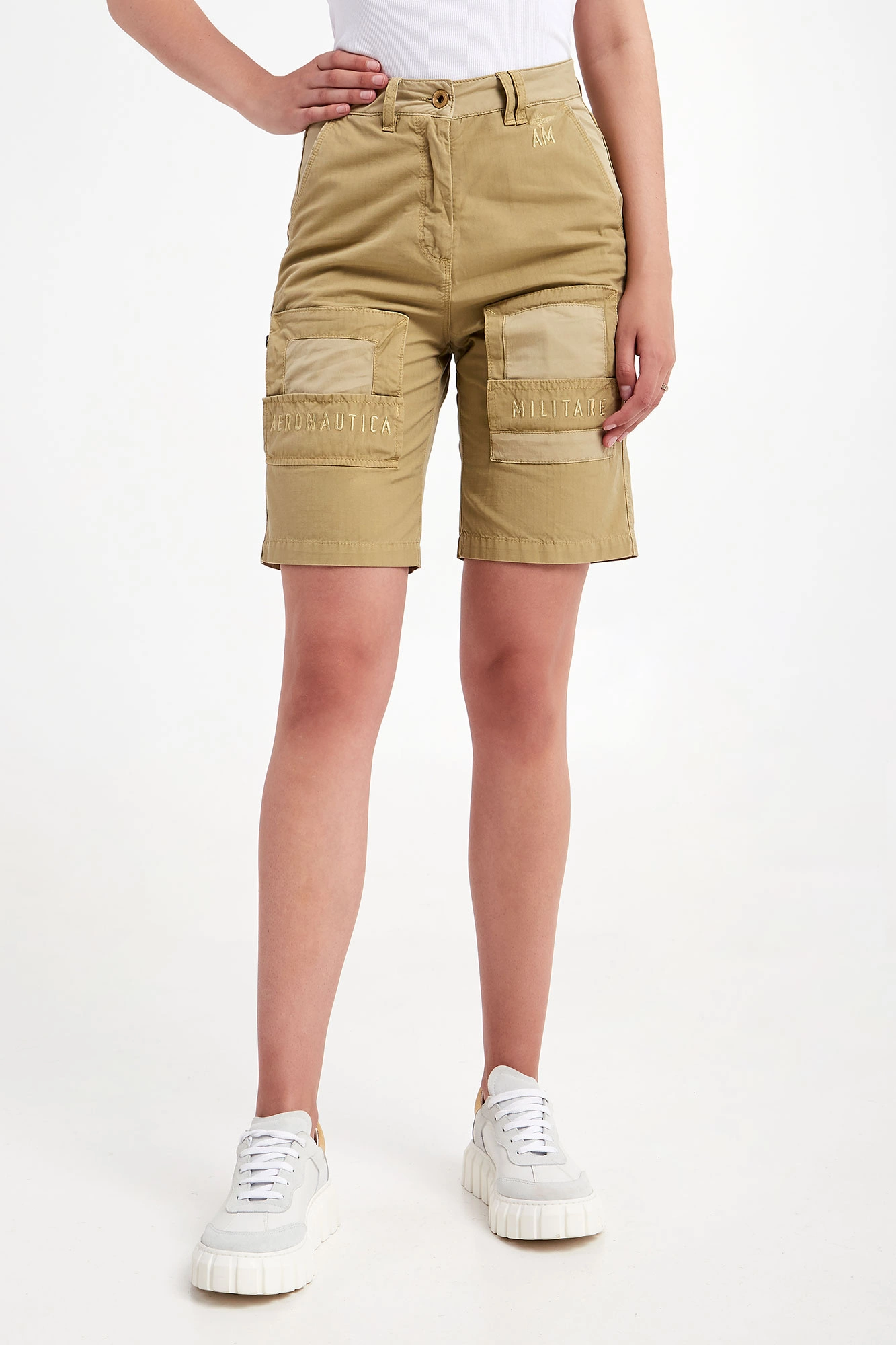 Spodenki marki Aeronautica Militare w beżowym kolorze. Fason typu regular fit. W pasie szlufki. Zapinane na sygnowany guzik i zamek. Po bokach i z tyłu kieszenie. Z tyłu z patkami zapinanymi na zatrzask. Na nogawkach naszyte dekoracyjne, odwrócone kieszenie z patkami. Na patkach haft w postaci nazwy marki. Nogawki wykończone lamówką.