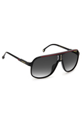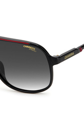 Okulary marki Carrera w czarnym kolorze. Wyprofilowane zauszniki ozdobione złotym nadrukiem z logo i monogramem. Nad ciemnoszarymi, sygnowanymi szkłami czerwona wstawka. Przy noskach nadruk z monogramem.
