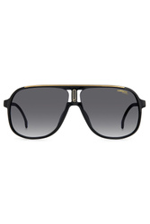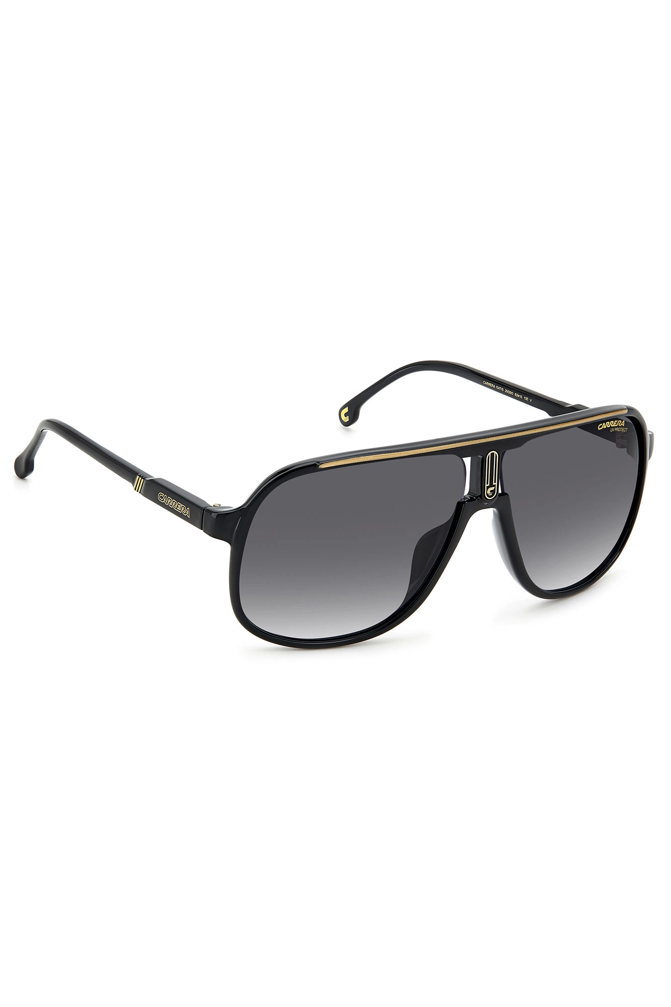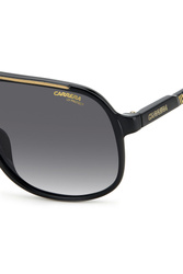 Okulary marki Carrera w czarnym kolorze. Wyprofilowane zauszniki ozdobione złotym nadrukiem z logo i monogramem. Nad ciemnoszarymi, sygnowanymi szkłami złota, połyskująca wstawka. Przy noskach nadruk z monogramem.