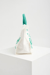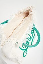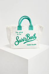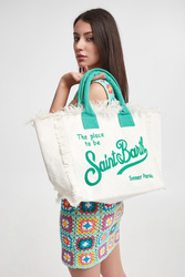 Torebka marki MC2 Saint Barth w białym kolorze. Z przodu duży haft w postaci nazwy marki w zielonym kolorze. Zapinana na zamek. Wewnątrz dwie kieszonki. Jedna zapinana na zamek i jedna bez zapięcia. Po bokach i na górze dekoracyjne strzępienia. Rączki w zielonym kolorze. W całości wykonana z tkaniny bawełnianej. Pojemna i bardzo stylowa. Zdecydowanie dopełni każdą, nie tylko plażową, stylizację.