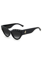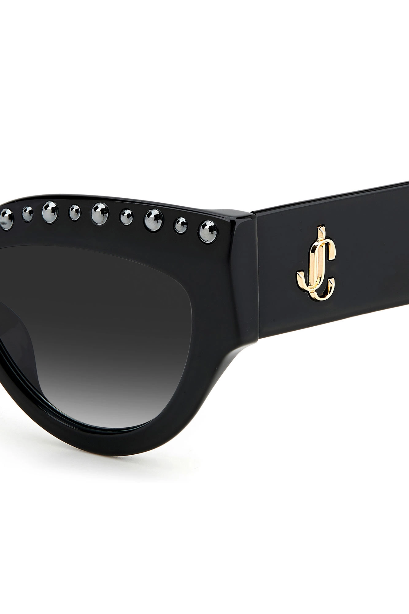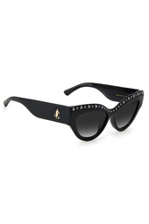 Okulary marki Jimmy Choo w czarnym kolorze. Z przodu ozdobne perły w srebrnym kolorze. Po boku aplikacja w srebrnym kolorze z monogramem marki. Zauszniki wyprofilowane, zwieńczone nadrukiem nazwy marki. Sygnowane szkła w ciemnoszarym kolorze.