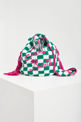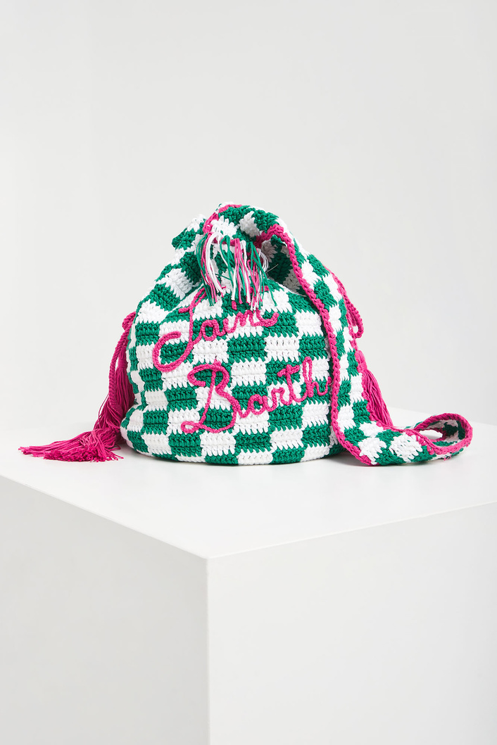 Torebka szydełkowa marki MC2 Saint Barth. Typu worek. Na całości biało-zielona szachownica. Brzegi wykończone kontrastowym, różowym kolorem. Z przodu napis z włóczki w postaci nazwy marki. Jednokomorowa, w środku dwie kieszonki. Szeroki pasek zakończony drobnymi frędzelkami. Zamykana za pomocą troczków z pomponami.