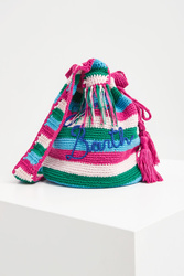 Wielokolorowa, szydełkowa torebka marki MC2 Saint Barth. Typu worek. Na całości wzór w paski. Z przodu napis z włóczki w postaci nazwy marki. Jednokomorowa, w środku dwie kieszonki. Szeroki pasek zakończony drobnymi frędzelkami. Zamykana za pomocą troczków z pomponami.