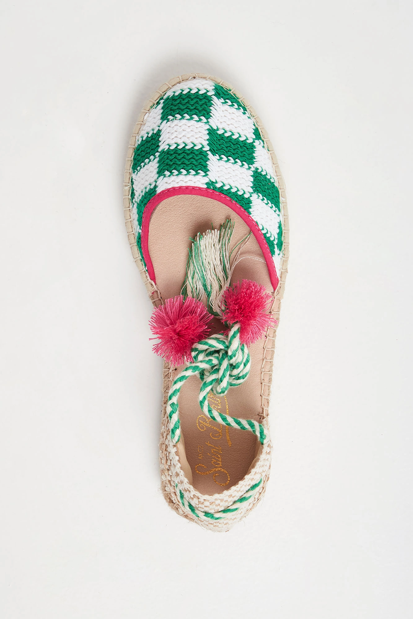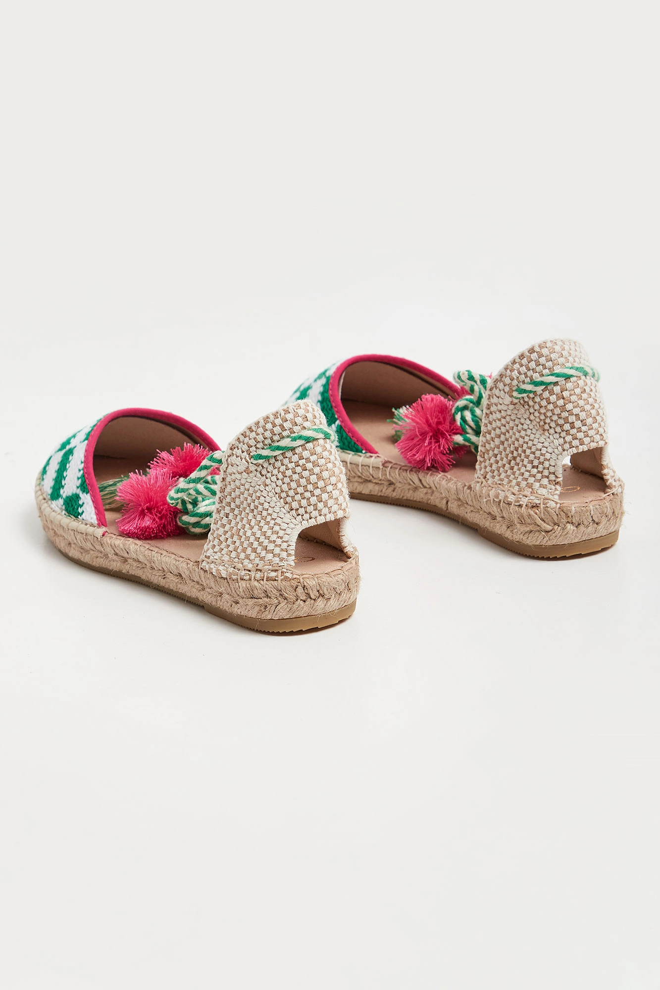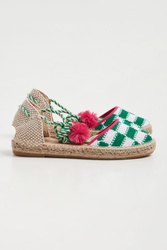 Espadryle marki MC2 Saint Barth. Dziergany przód w biało-zieloną szachownice, wykończony różową lamówką. Tył pleciony, beżowy z wycięciem. Wiązane wokół kostki za pomocą troczków z pomponami.