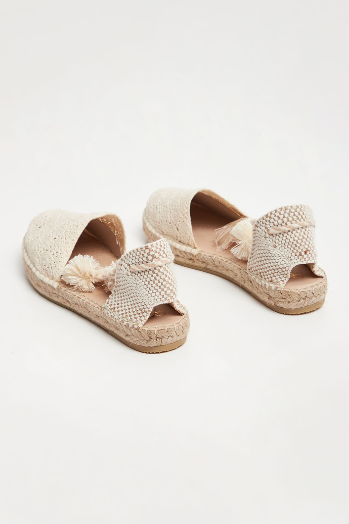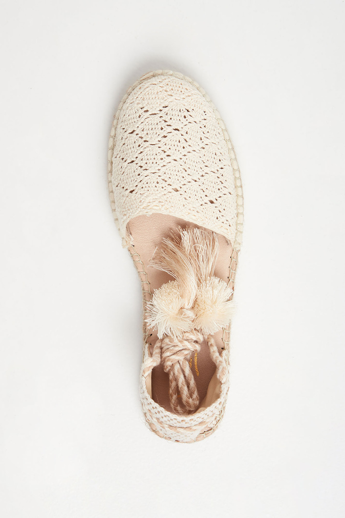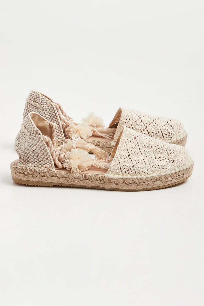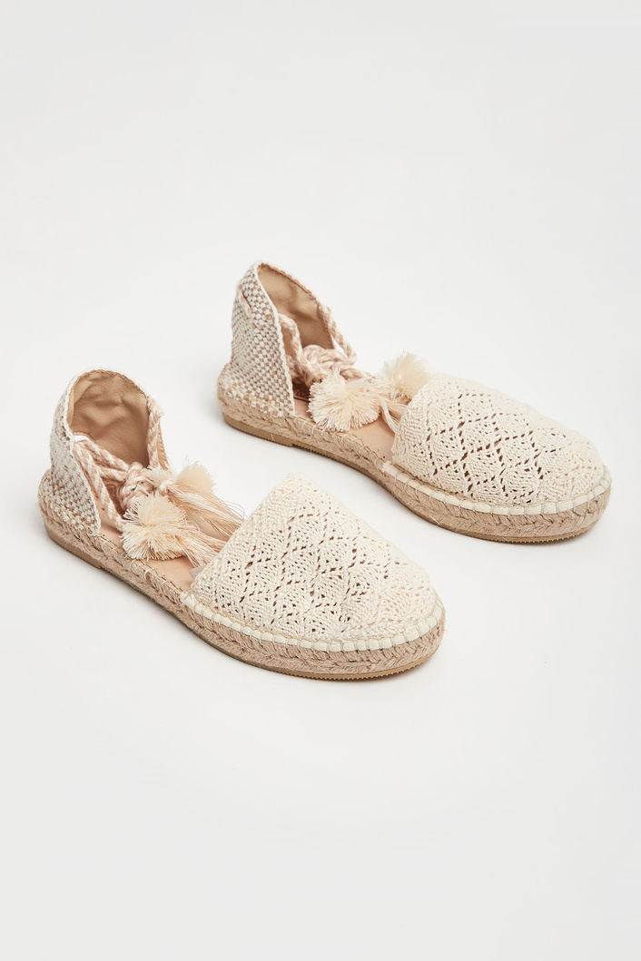 Espadryle marki MC2 Saint Barth w kolorze beżowym. Dziergany, ażurowy przód. Tył pleciony, z wycięciem. Wiązane wokół kostki za pomocą troczków z pomponami.