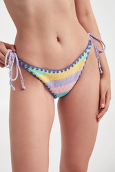 Dół od bikini marki MC2 Saint Barth. Wielokolorowy, typu fili. Na całości wzór w paski. Z tyłu napis w postaci nazwy marki. Po bokach wiązany za pomocą fioletowych troczków. Wykonany w większości z tkaniny bawełnianej.