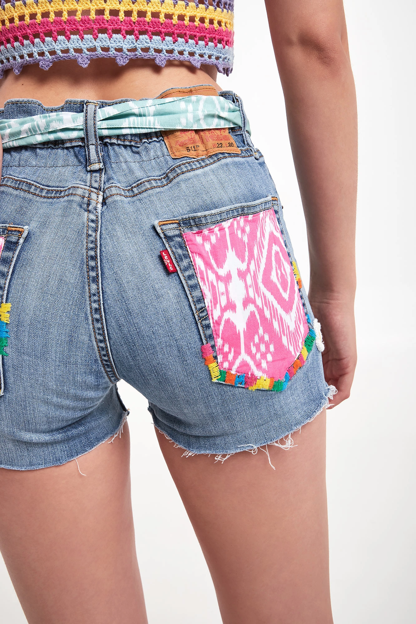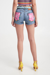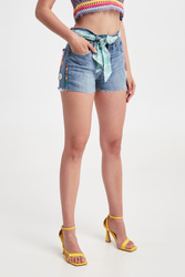 Szorty jeansowe marki MC2 Saint Barth w kolorze niebieskim. Fason relaxed fit. W zestawie pasek w postaci chusty. Model z czterema kieszeniami. Wstawki na kieszeniach. Na szwie i przy kieszeniach kolorowe, nieregularne hafty. Na nogawkach naszywki w postaci kwiatków. Nogawki wykończone strzępieniem. Spodenki wykonane z bawełnianej tkaniny, pochodzącej z upcyklingu. Mogą pojawić się nieregularne przetarcia i przebarwienia.