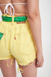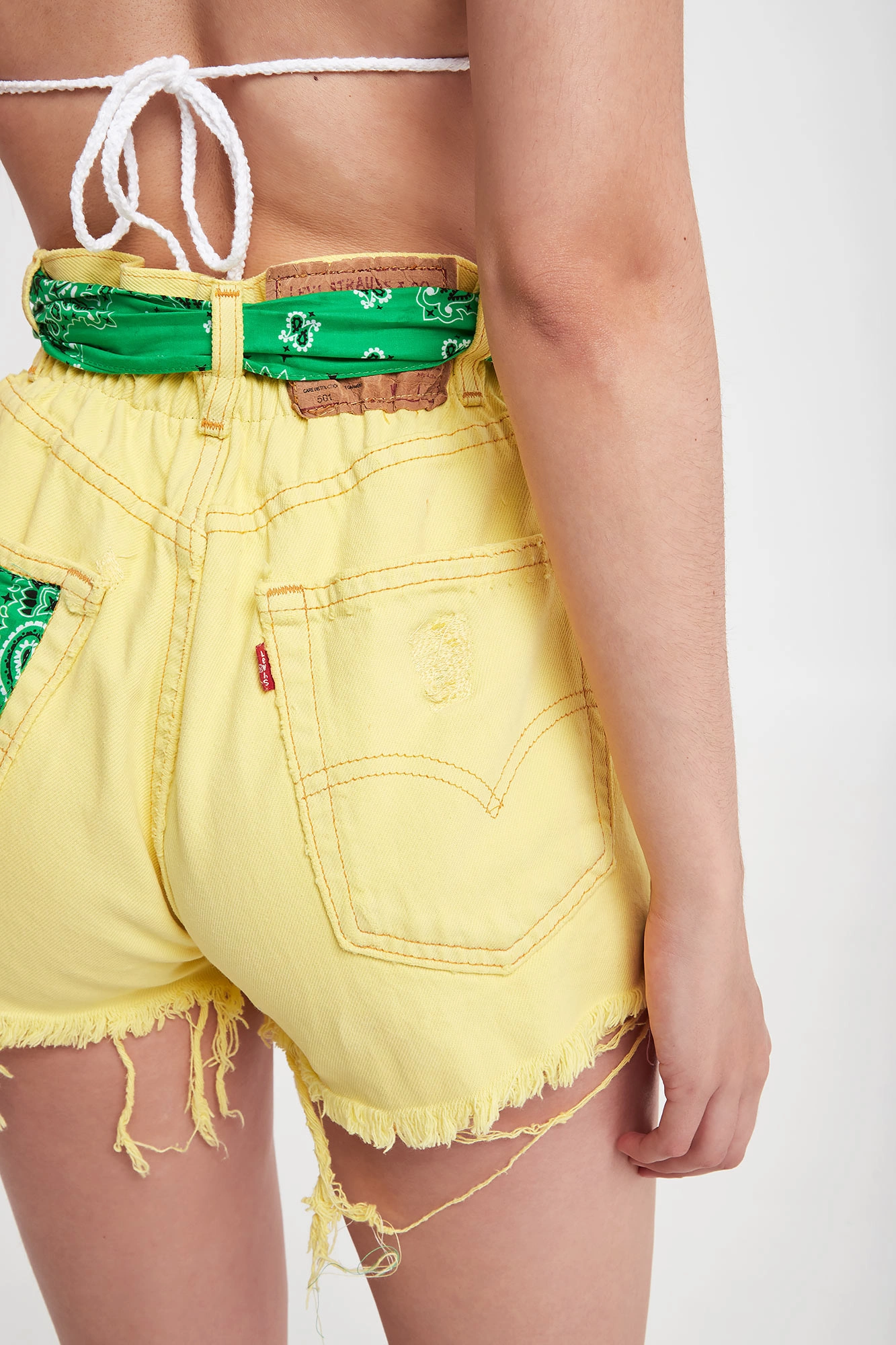 Szorty jeansowe marki MC2 Saint Barth w kolorze żółtym. Fason relaxed fit. W zestawie pasek w postaci zielonej bandany. Model z czterema kieszeniami. Wstawki na kieszeniach w tym samym kolorze, co dołączony pasek. Nogawki wykończone strzępieniem. Spodenki wykonane z bawełnianej tkaniny, pochodzącej z upcyklingu. Mogą pojawić się nieregularne przetarcia i przebarwienia.