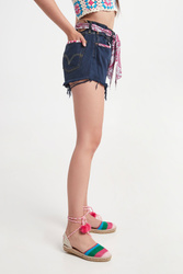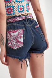 Szorty jeansowe marki MC2 Saint Barth w kolorze granatowym. Fason relaxed fit. W zestawie pasek w postaci biało-różowej chustki. Model z czterema kieszeniami. Wstawki na kieszeniach w tym samym kolorze, co dołączony pasek. Nogawki wykończone strzępieniem. Spodenki wykonane z bawełnianej tkaniny, pochodzącej z upcyklingu. Mogą pojawić się nieregularne przetarcia i przebarwienia.