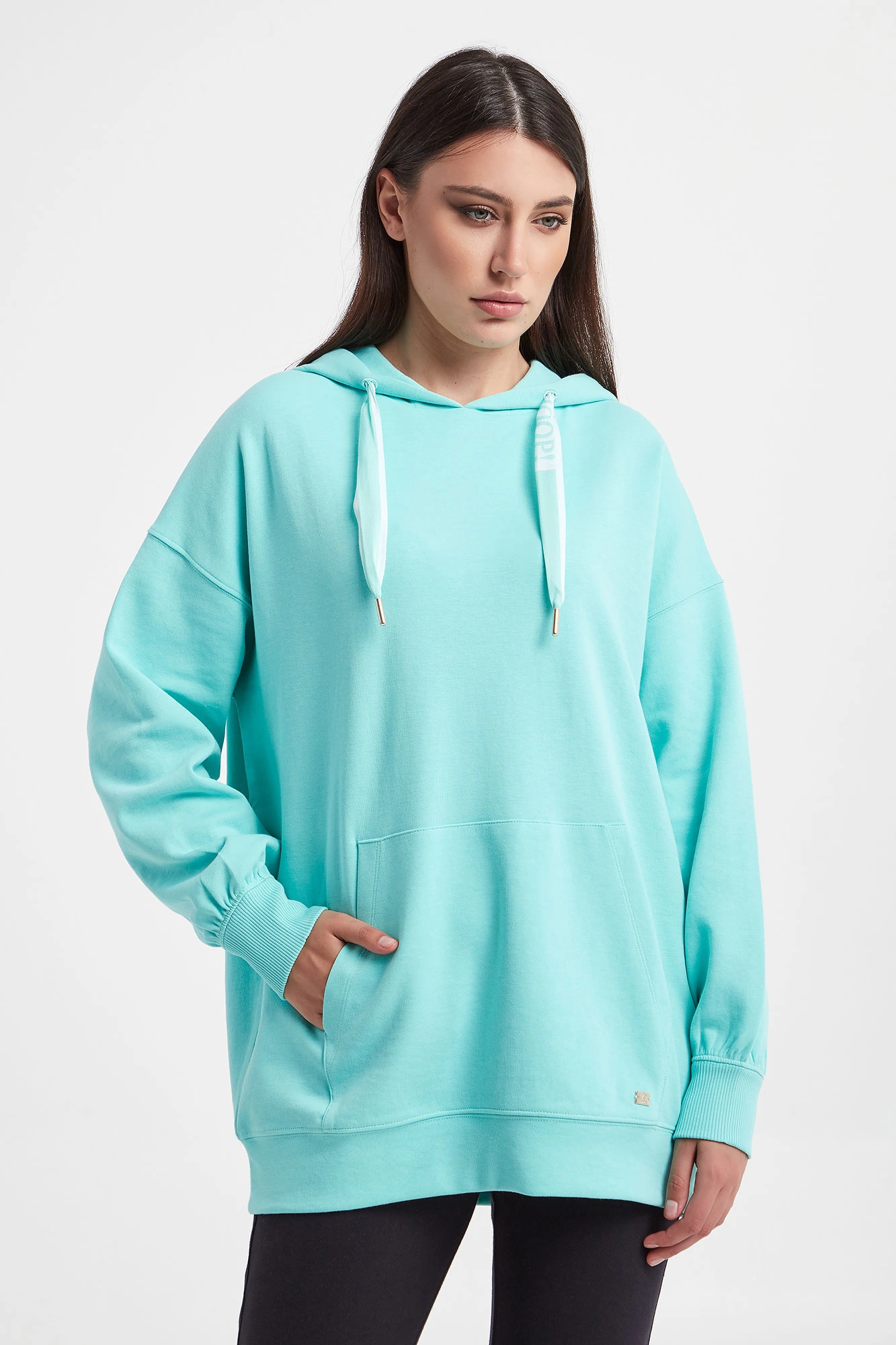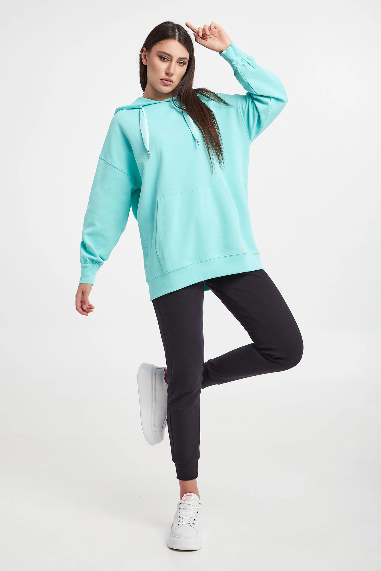 Bluza z kapturem marki Joop! w mietowo-zielonym kolorze. O nieco dłuższym fasonie typu relaxed fit. Obniżona linia ramion. Kaptur regulowany za pomocą logowanych tasiem zakończonych srebrną zawieszką. Z przodu kieszeń kangurka. Dół wykończony gładkim ściągaczem. Rękawy wykończone ściągaczem prążkowanym. Po lewej stronie, przy kieszeni metalowa, srebrna aplikacja z logo i nazwą marki.