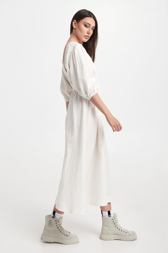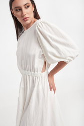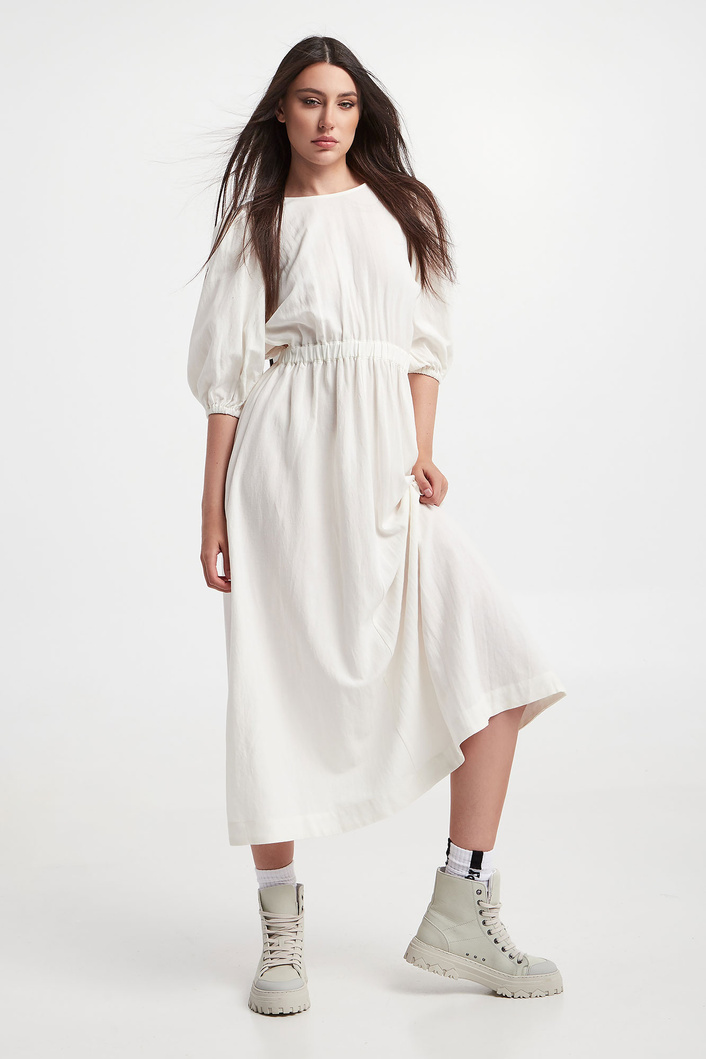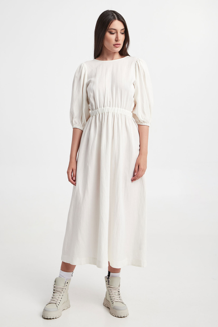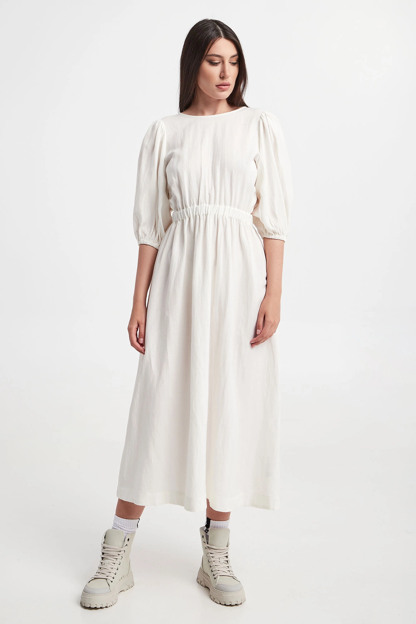 Sukienka marki Notes du Nord w kolorze białym. Fason typu regular fit o długości midi. Po bokach ozdobne wycięcia. Plecy wycięte w kształt litery V. W pasie elastyczny ściągacz. Bufiaste rękawki o długości 3/4. Plecy i rękawy zakończone ściągaczem. Dół wykończony lamówką. Sukienka wykonana z połączenia wiskozy, lnu i bawełny.