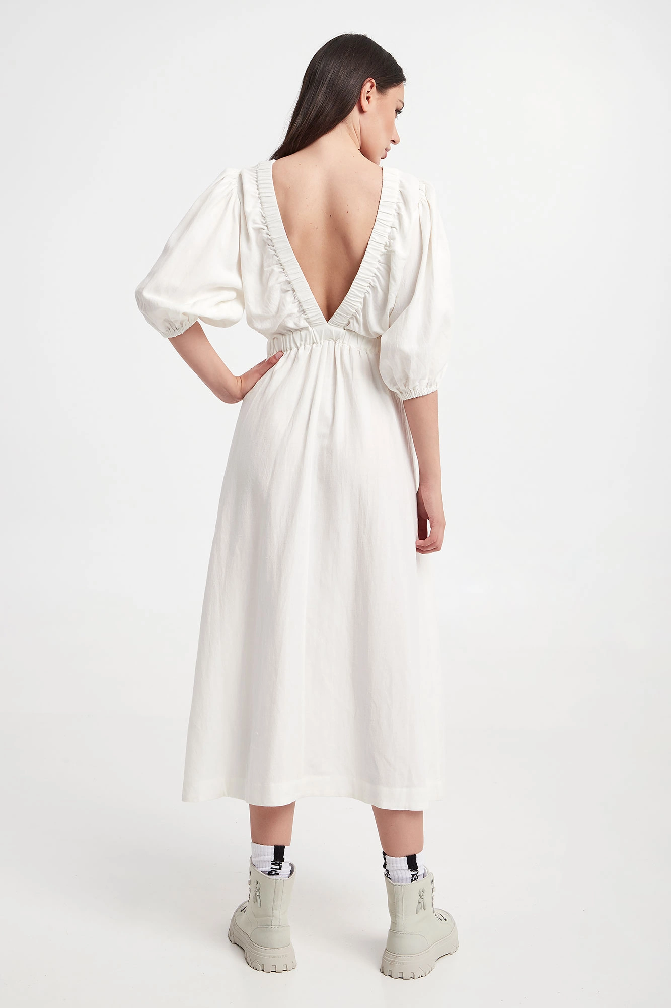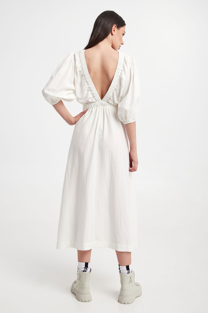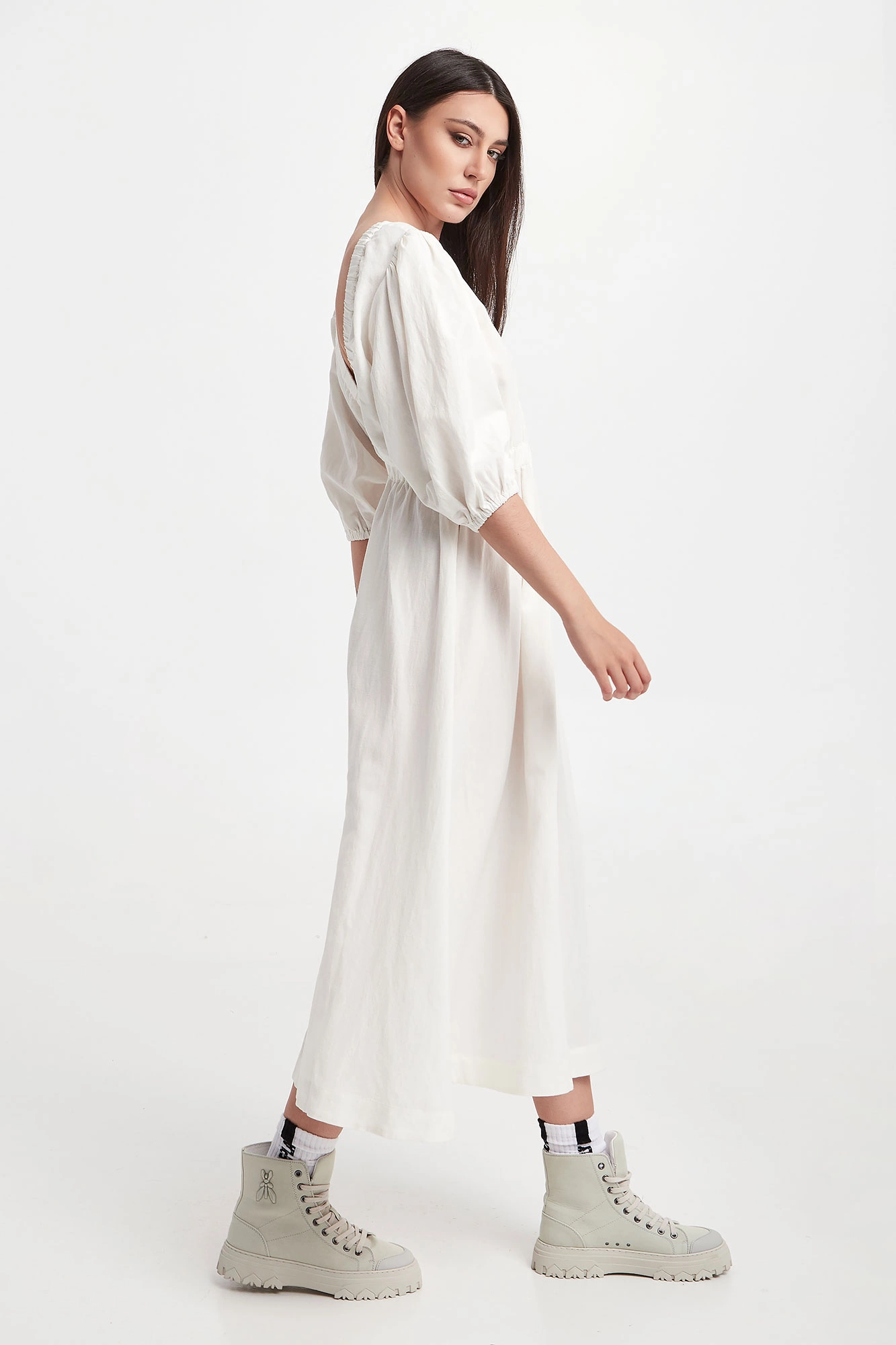 Sukienka marki Notes du Nord w kolorze białym. Fason typu regular fit o długości midi. Po bokach ozdobne wycięcia. Plecy wycięte w kształt litery V. W pasie elastyczny ściągacz. Bufiaste rękawki o długości 3/4. Plecy i rękawy zakończone ściągaczem. Dół wykończony lamówką. Sukienka wykonana z połączenia wiskozy, lnu i bawełny.