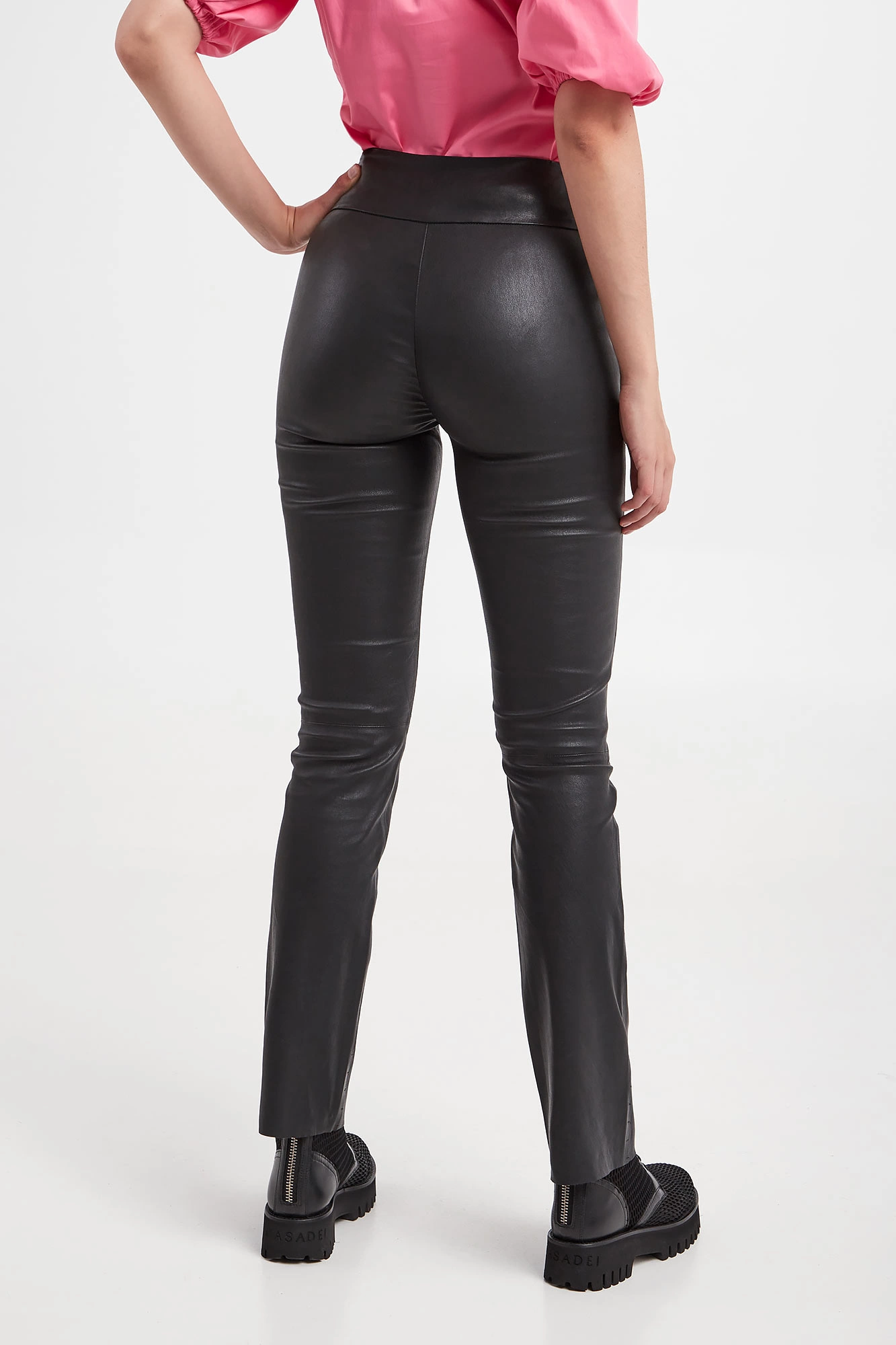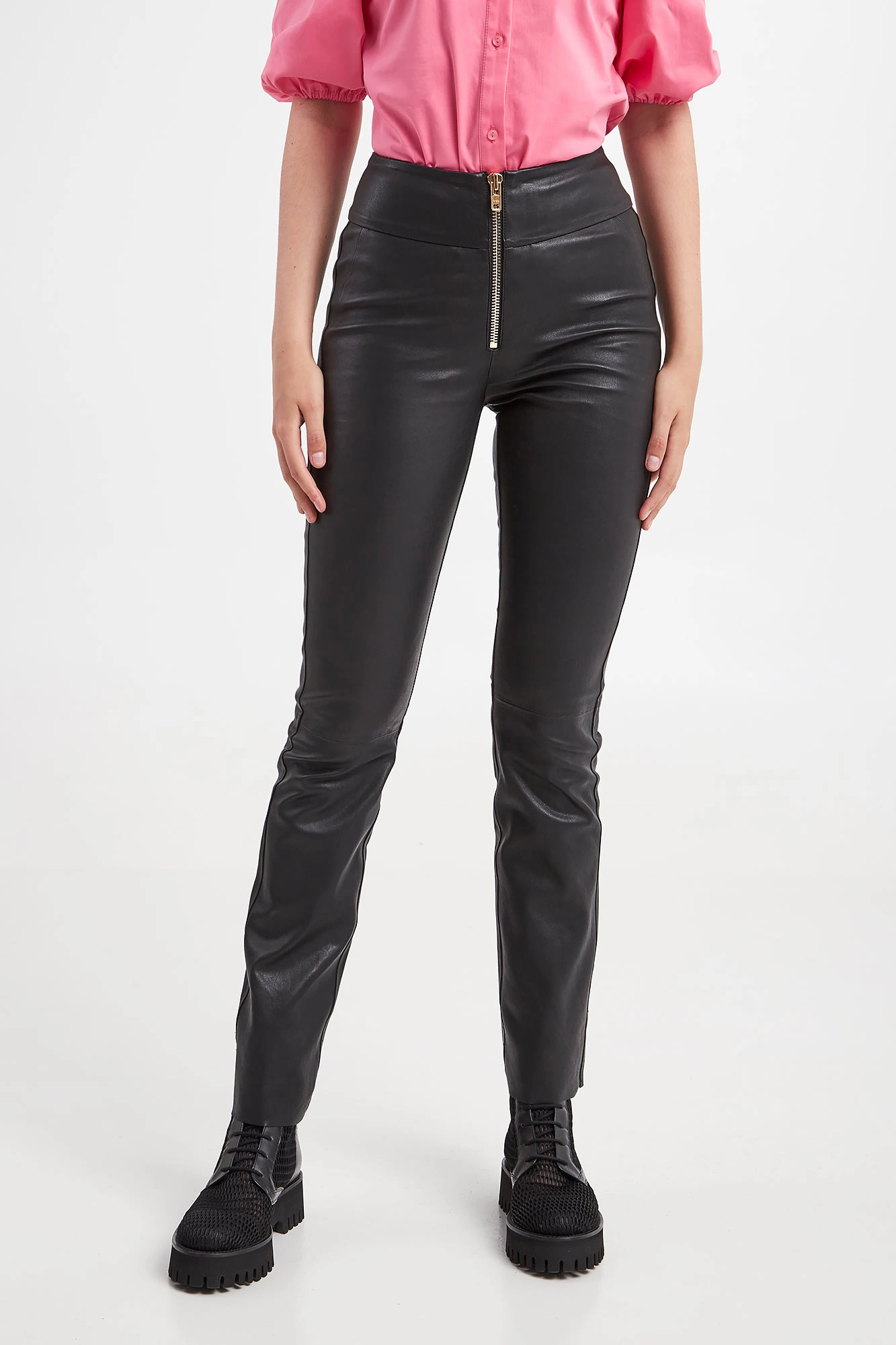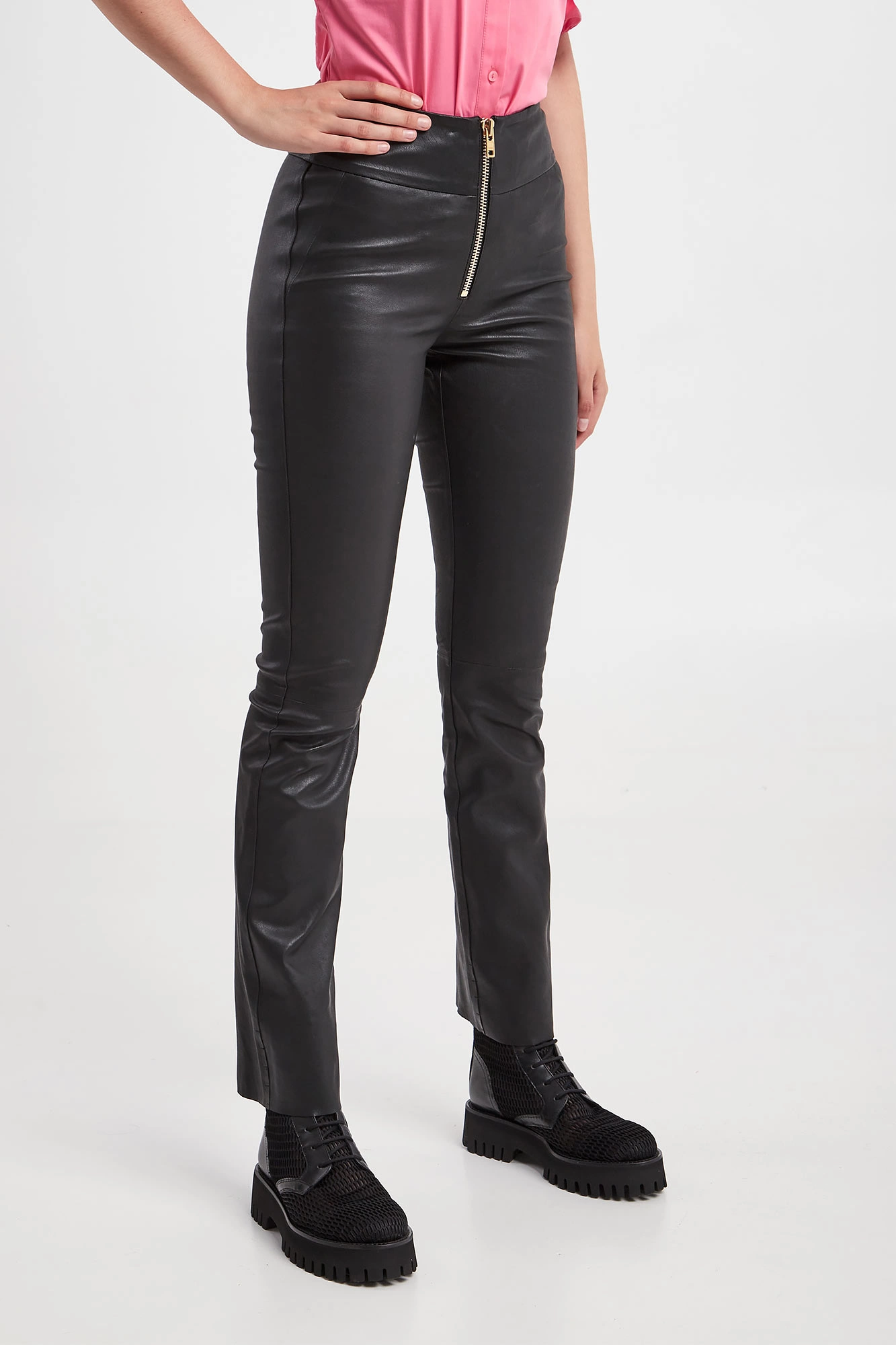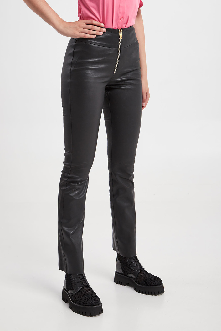 Spodnie marki Notes du Nord w czarnym kolorze. Fason typu regular fit. Zapinane z przodu za pomocą zamka w złotym kolorze. Wykonane z naturalnej, jagnięcej skóry. Mogą pojawić się nieregularne przebarwienia.