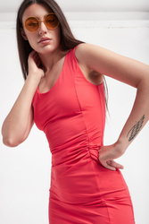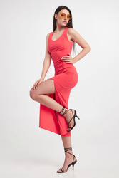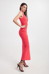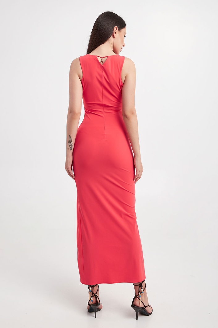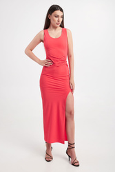 Sukienka marki Parizia Pepe w kolorze koralowym. Fason typu slim fit o długości maxi. Na dole rozcięcie. W talii ozdobne drapowanie. Model z szerokimi ramiączkami. Okrągły dekolt typu o-neck. Z tyłu na linii karku zawieszka metalowa w złotym kolorze, w postaci owada - logo marki. Wykonana z elastycznego materiału.