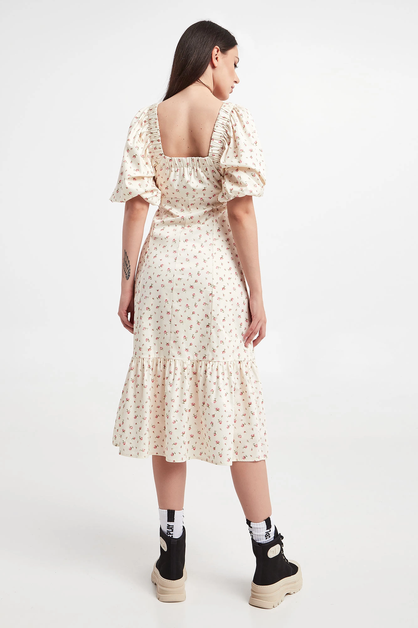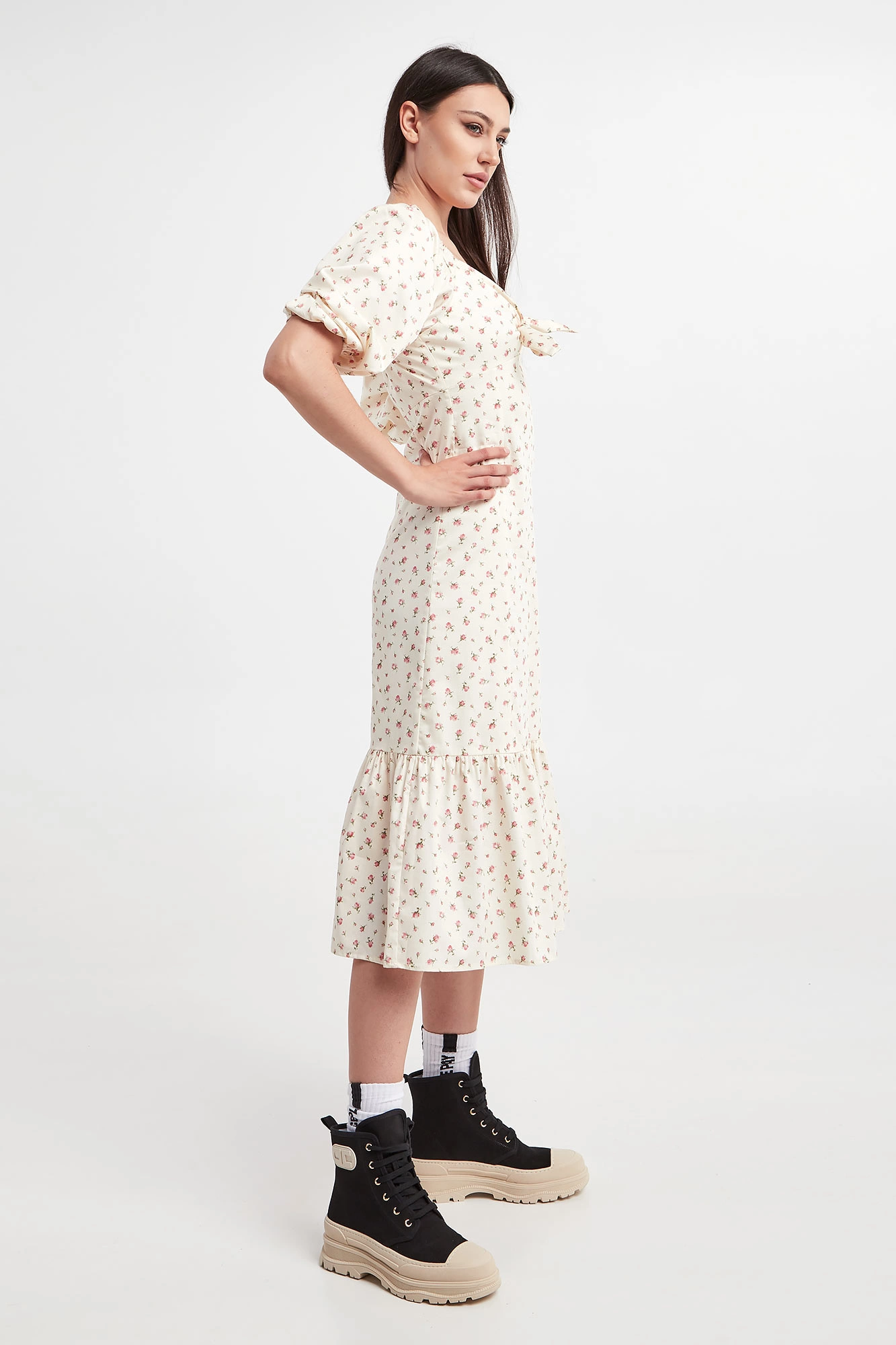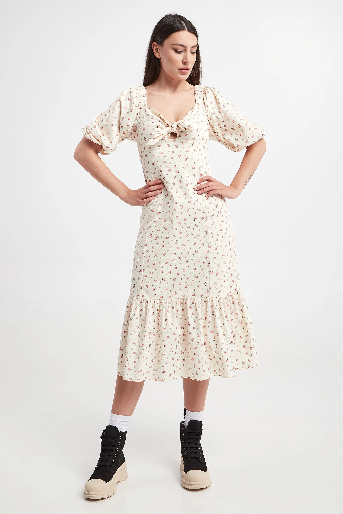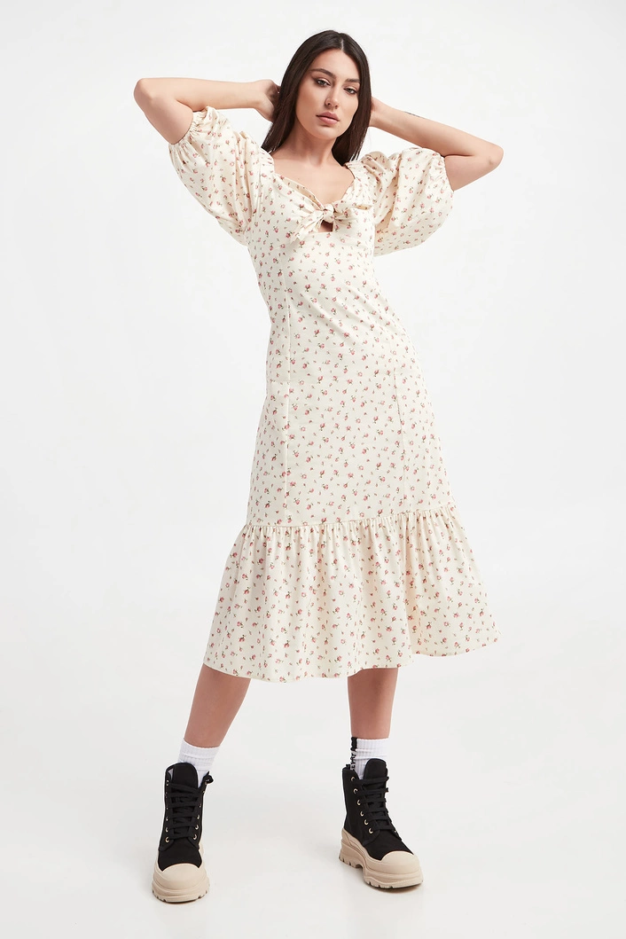 Sukienka marki Notes du Nord w kremowym kolorze. Na całości różowo-zielony, kwiatowy wzór. Fason regular fit, długość midi. Dekolt zakończony ozdobnym wiązaniem. Pod biustem odcięcie. Delikatnie bufiaste rękawy o długości 3/4 zakończone ściągaczami z możliwością opuszczenia. Na plecach ściągacz. U dołu szeroka falbana. Zapinana za pomocą bocznego zamka. Wykonana z bawełnianej, popelinowej tkaniny.
