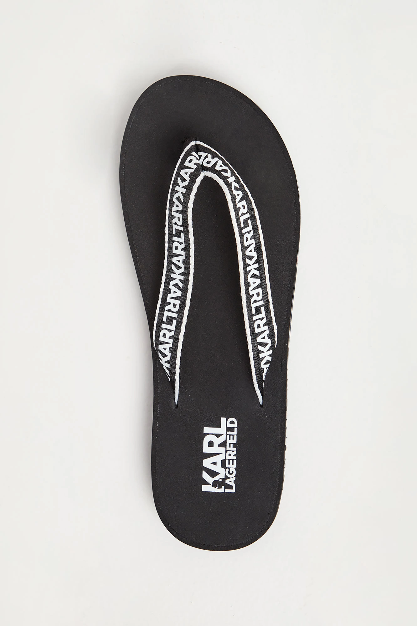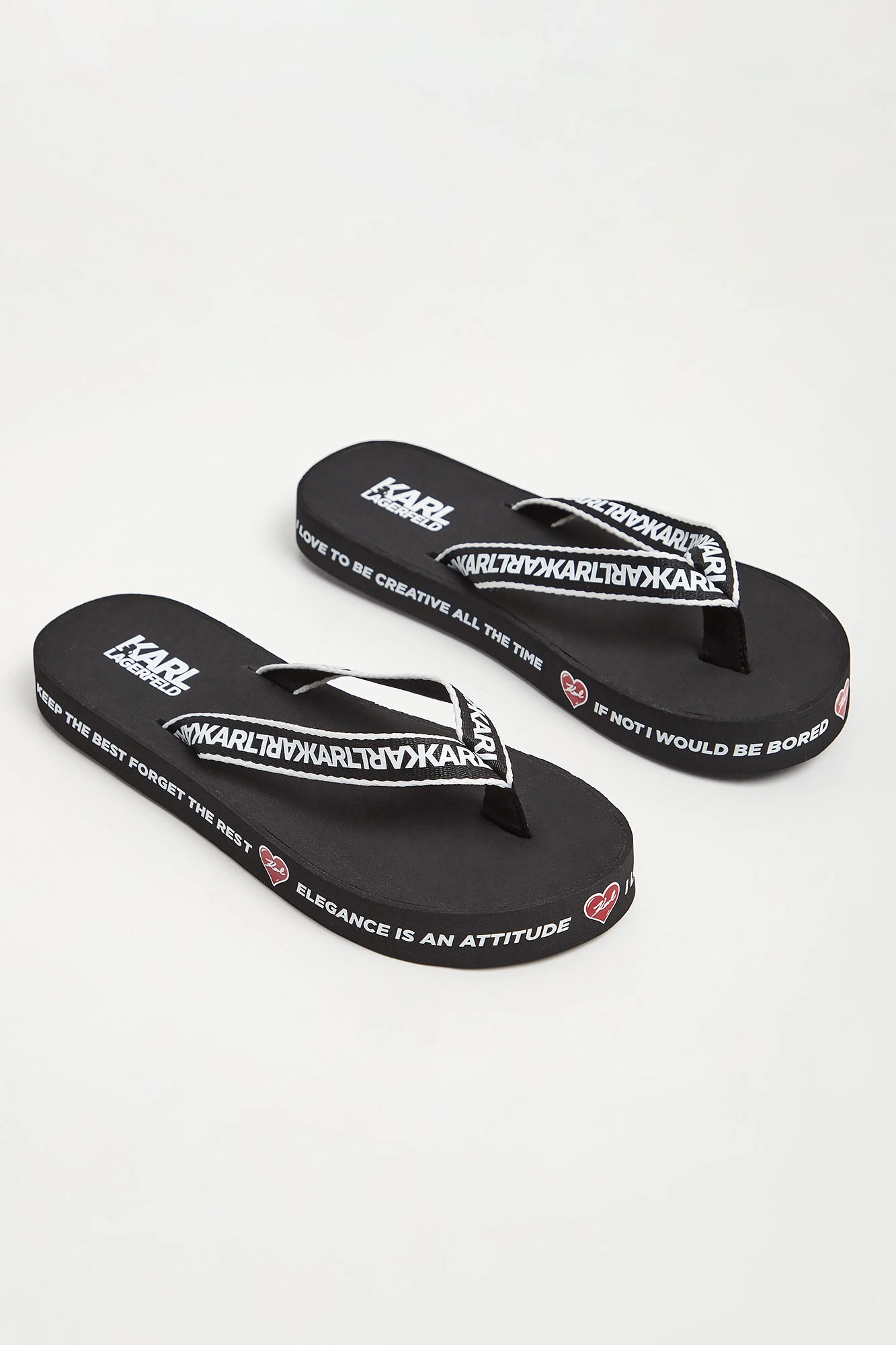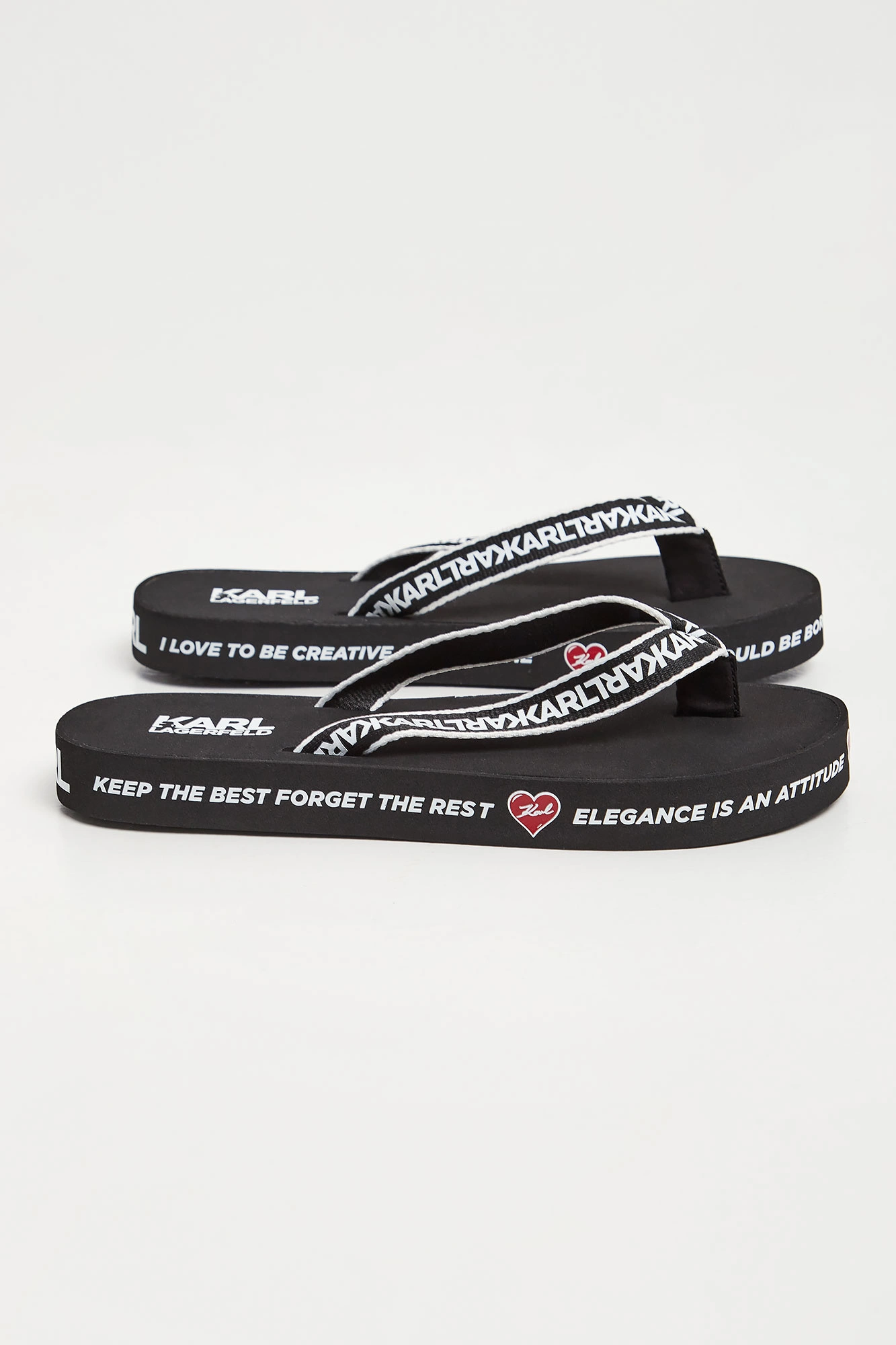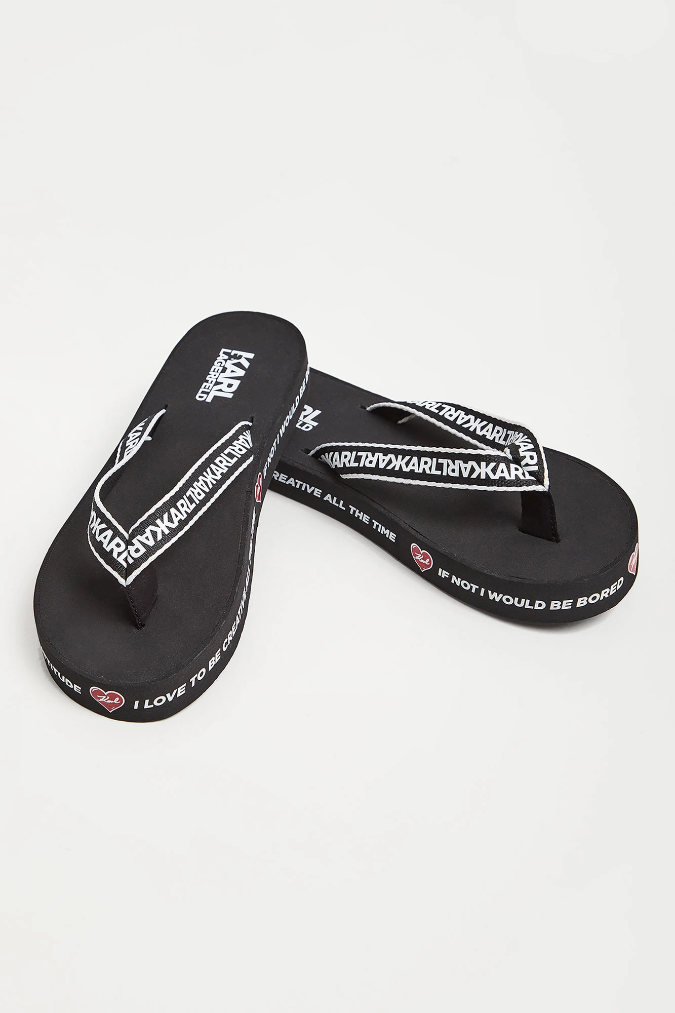 Japonki marki Karl Lagerfeld w czarnym kolorze. Na paskach i po bokach białe, kontrastujące napisy z nazwą marki oraz czerwony motyw serca z logo. Podeszwa tłoczona i sygnowana. Lekkie, komfortowe i stylowe.