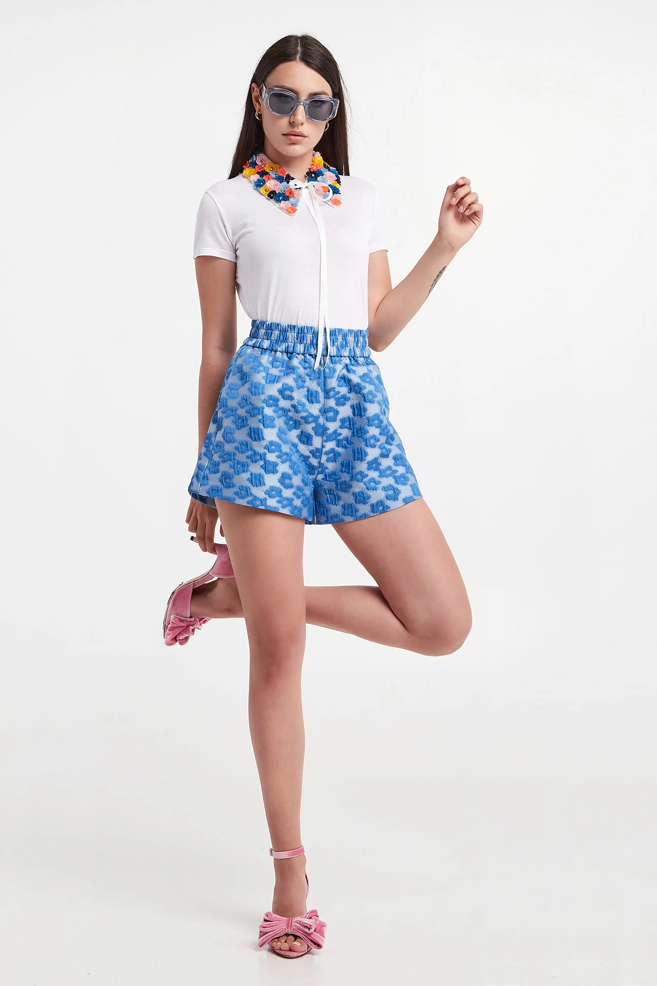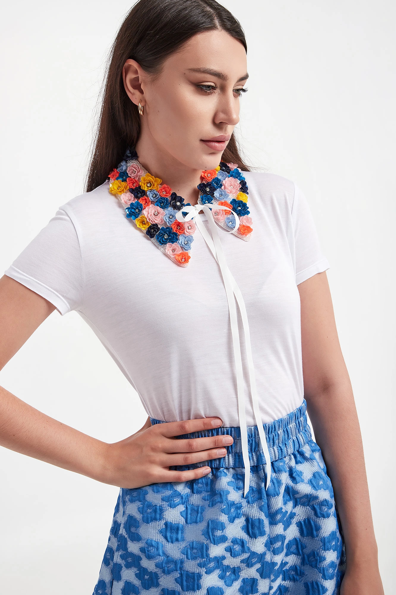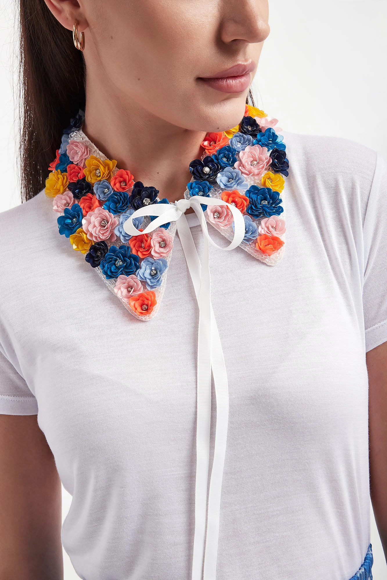 Kołnierzyk marki Custommade w białym kolorze. Typu bebe. Wykończony koralikami, cyrkoniami i kwiatami z tworzywa. Ręcznie ozdabiane. wiązany z przodu za pomocą wstążek. Kołnierzyk wykonany z czystej bawełny.