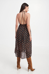 Sukienka marki Custommade w czarnym kolorze. Na całości nadruk z motywem roślinnym i kropki. Fason typu relaxed fit o długości midi. Wiązana u góry za pomocą materiałowych troczków. Z tyłu w talii elastyczny ściągacz. Odcinana pod piersiami. Wiskozowa podszewka.