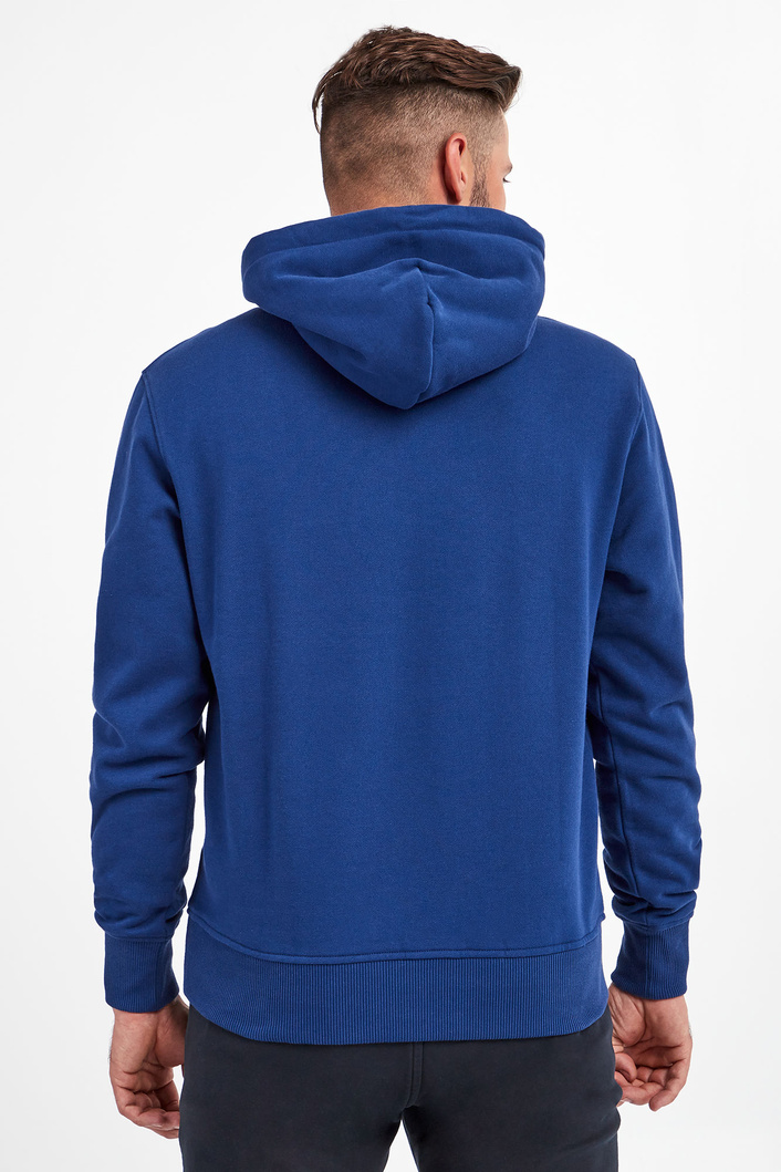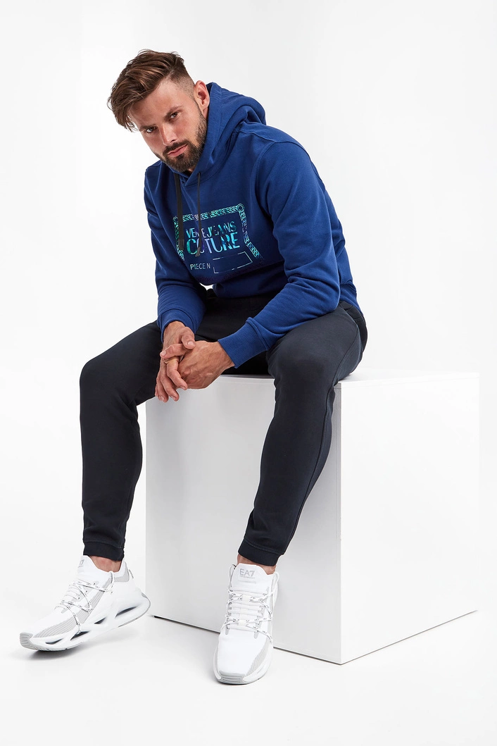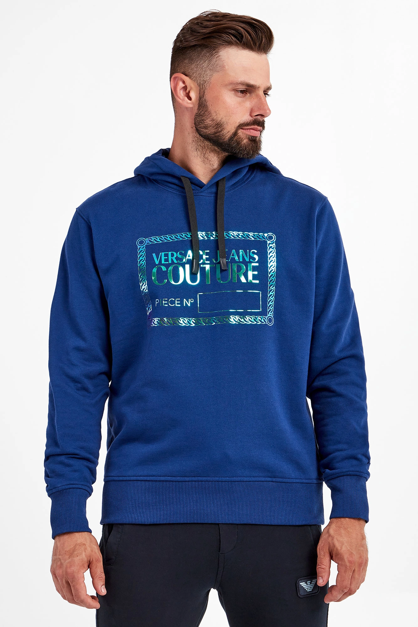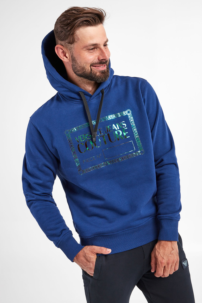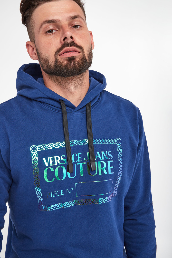 Bluza z kapturem Versace Jeans Couture w kolorze granatowym. Fason regular fit. Z przodu opalizujący nadruk z nazwą marki. Kaptur regulowany za pomocą czarnych troczków. Rękawy i dół zakończone szerokim, elastycznym ściągaczem. Wykonana ze stuprocentowej bawełny.