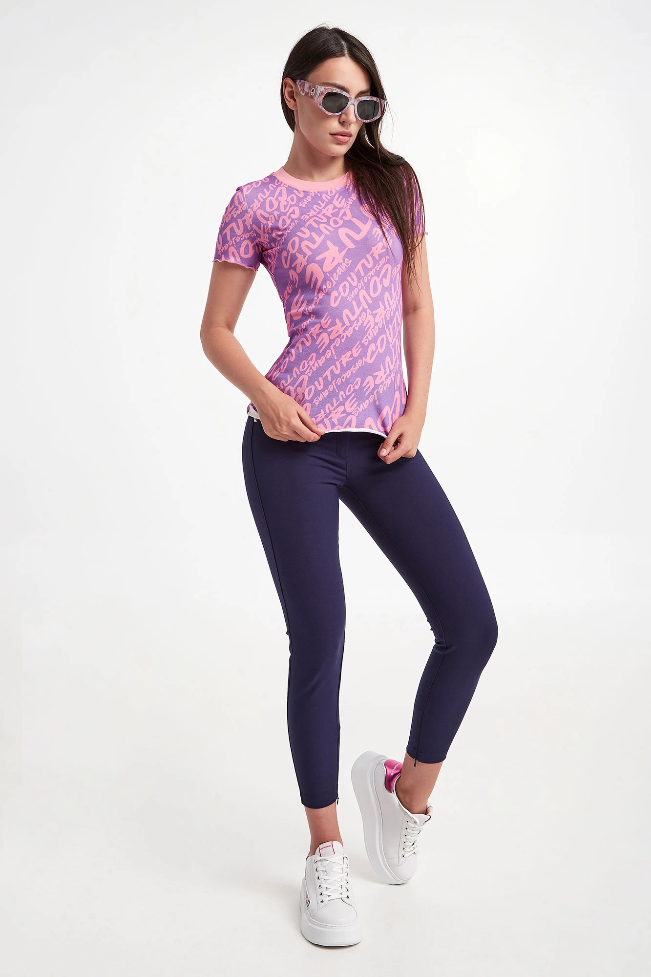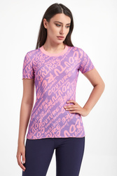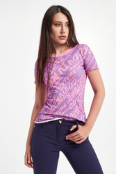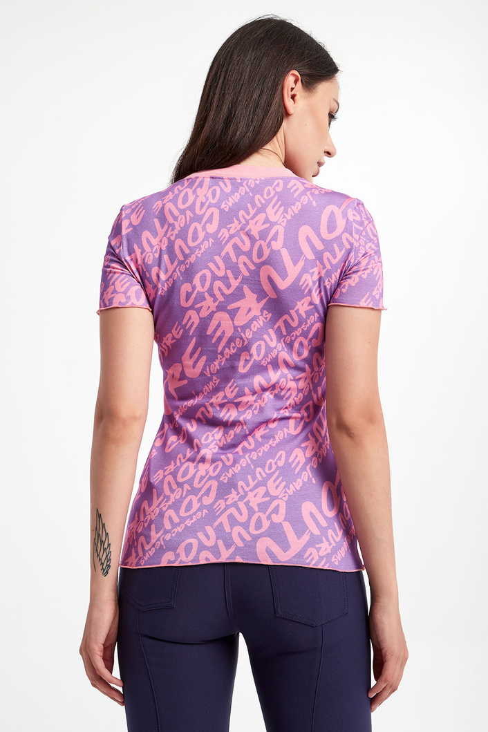 T-shirt marki Versace Jeans Couture w kolorze fioletowym. Fason typu slim. Na całości różowy nadruk w postaci nazwy marki. Dekolt typu o-neck zakończony ściągaczem. Krótkie rękawki i dół wykończone nieregularnie. T-shirt wykonany w większości z bawełny.