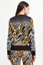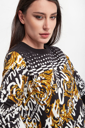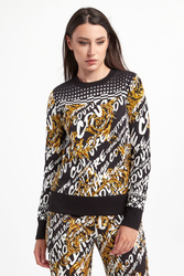 Bluza marki Versace Jeans Couture w czarnym kolorze. Na całości złoty, charakterystyczny dla marki barokowy wzór i nadruk w postaci nazwy marki w białym kolorze. Fason typu regular fit. Dekolt typu o-neck, dół i rękawy wykończone elastycznym ściągaczem w czarnym kolorze. Wykonana z czystej bawełny.