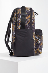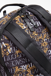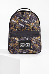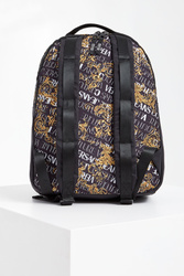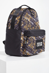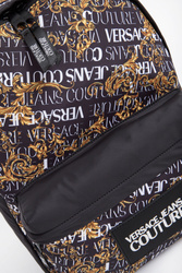 Plecak marki Versace Jeans Couture w czarnym kolorze. Na całości charakterystyczny wzór barokowy w złotym kolorze, z napisami w postaci nazwy marki w białym kolorze. Posiada trzy kieszenie zapinane na zamek z sygnowanymi zawieszkami. Z przodu gumowana naszywka w postaci nazwy marki w białym kolorze. Do noszenia na regulowanych szelkach albo w dłoni.