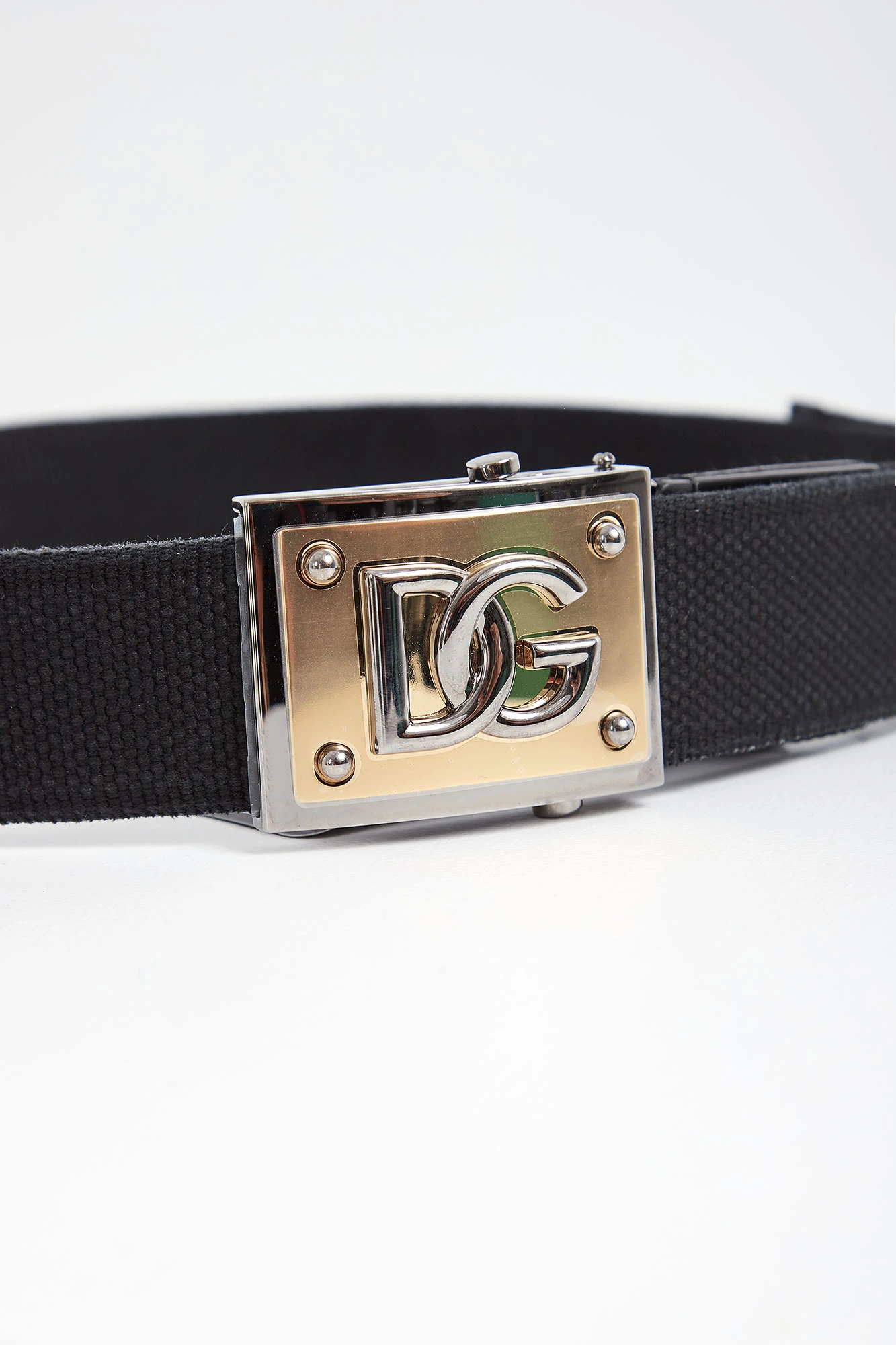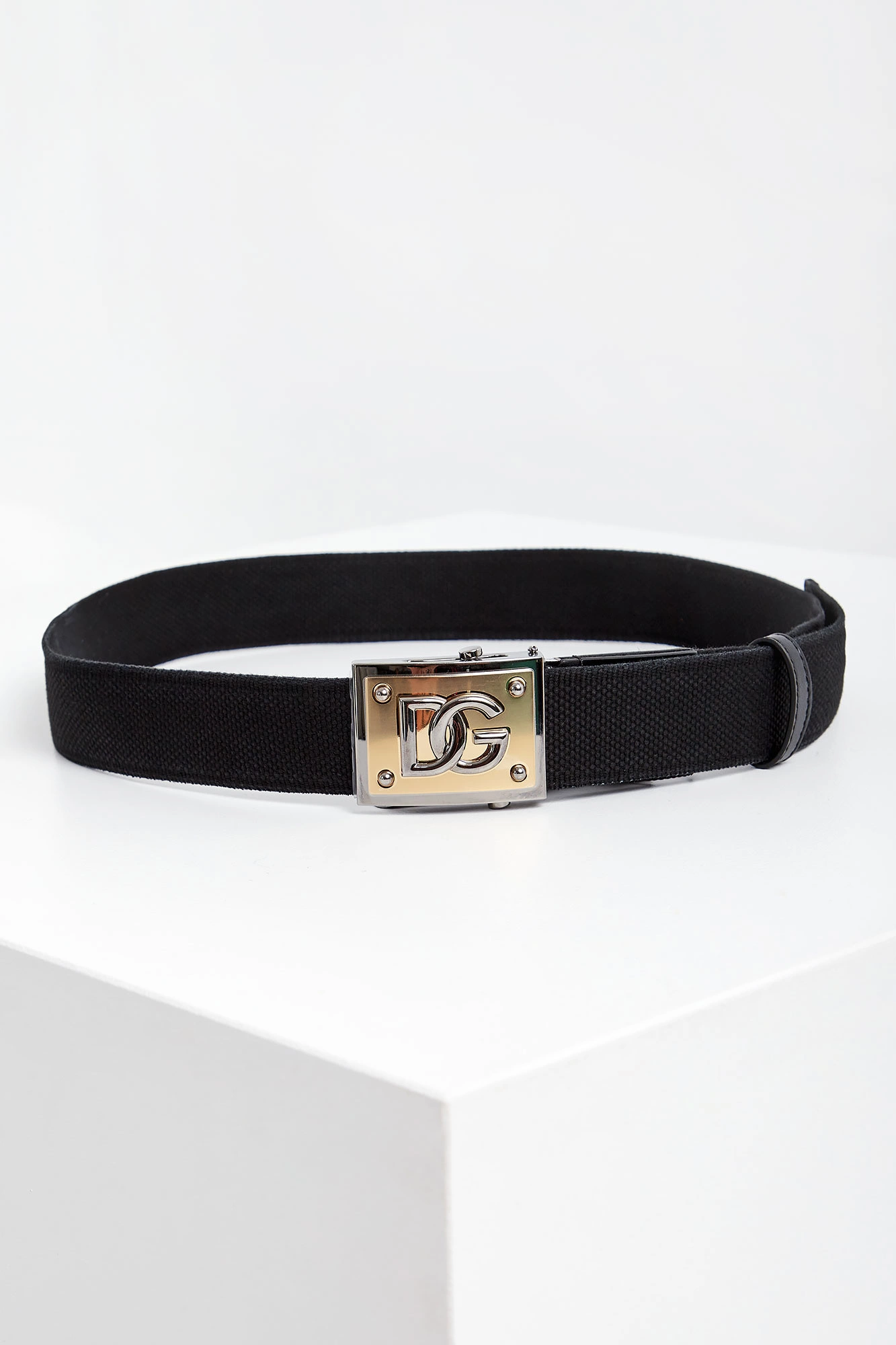 Pasek marki Dolce & Gabbana w czarnym kolorze. Zapinana za pomocą złoto-srebrnej klamry z monogramem marki. Skórzane wstawki i szlufka.