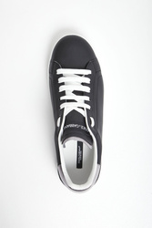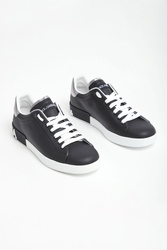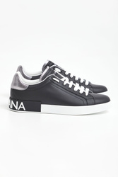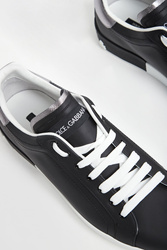 Sneakersy marki Dolce & Gabbana w kolorze czarnym. Klasyczny model wykonany ze skóry. Model Portofino. Na języku naszywka z nazwą marki. Na zapiętce aplikacja z tłoczonej, srebrnej skóry. Wiązane za pomocą sznurówek w białym kolorze. Sygnowana, biała wyściółka. Klasyczna podeszwa, tył czarny z tłoczonym monogramem marki.