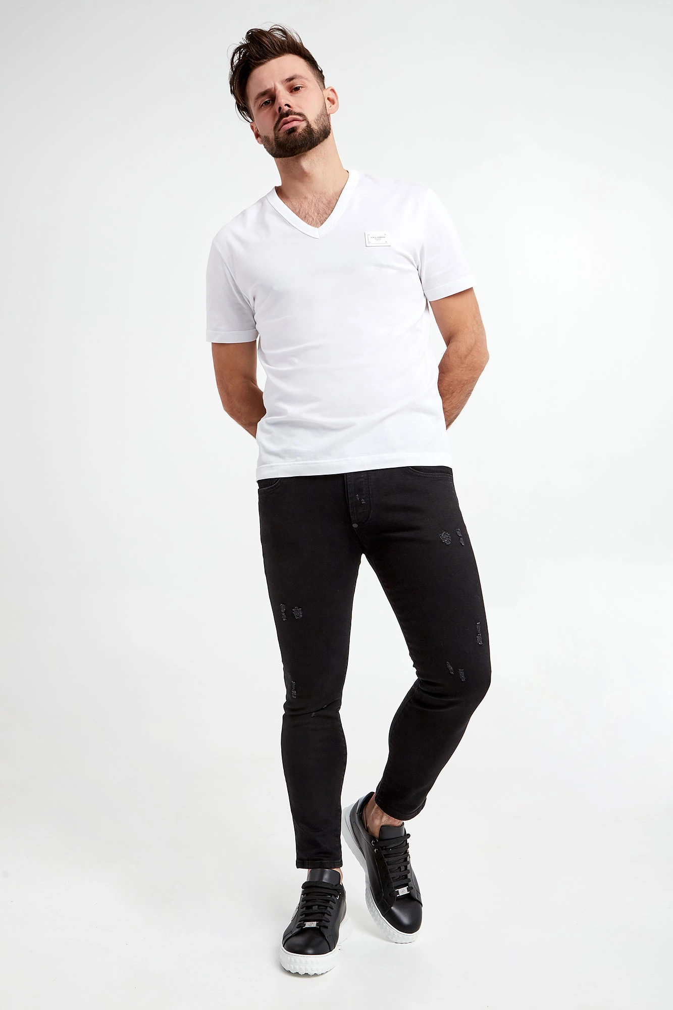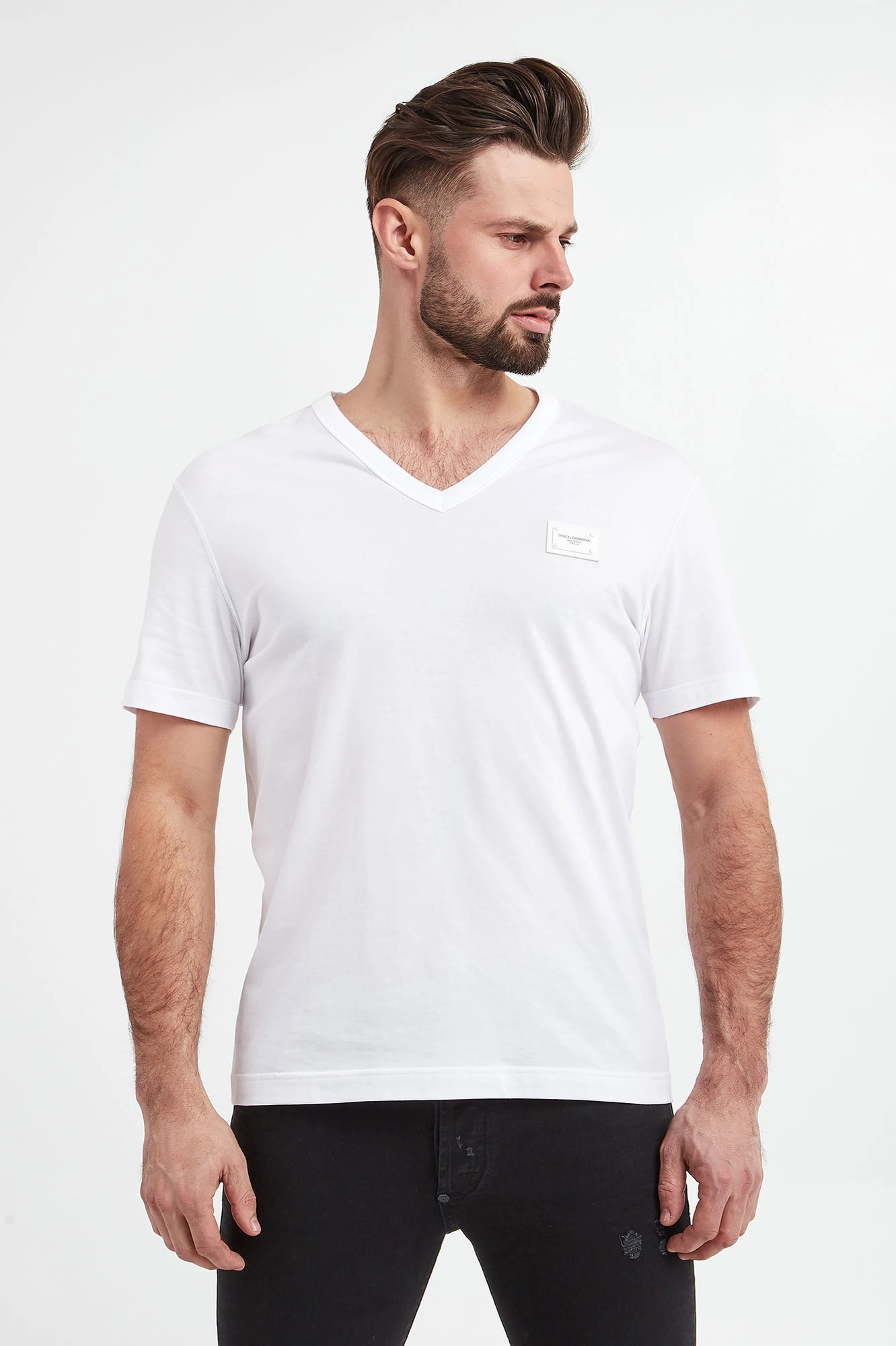T-shirt marki Dolce & Gabbana w białym kolorze. Wykonany z czystej bawełny. Dekolt typu o-neck zakończony ściągaczem. Z przodu biała aplikacja z nazwą marki ozdobiona skórzanymi wstawkami. Krótkie rękawy i dół wykończone lamówką. Fason typu regular.