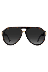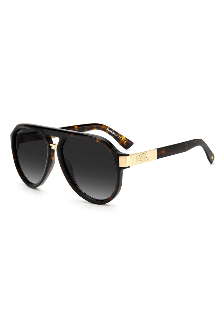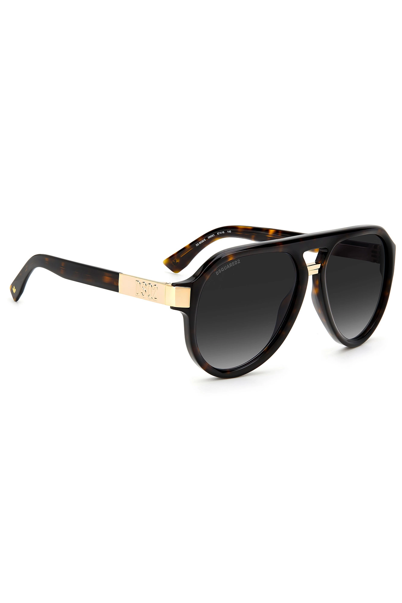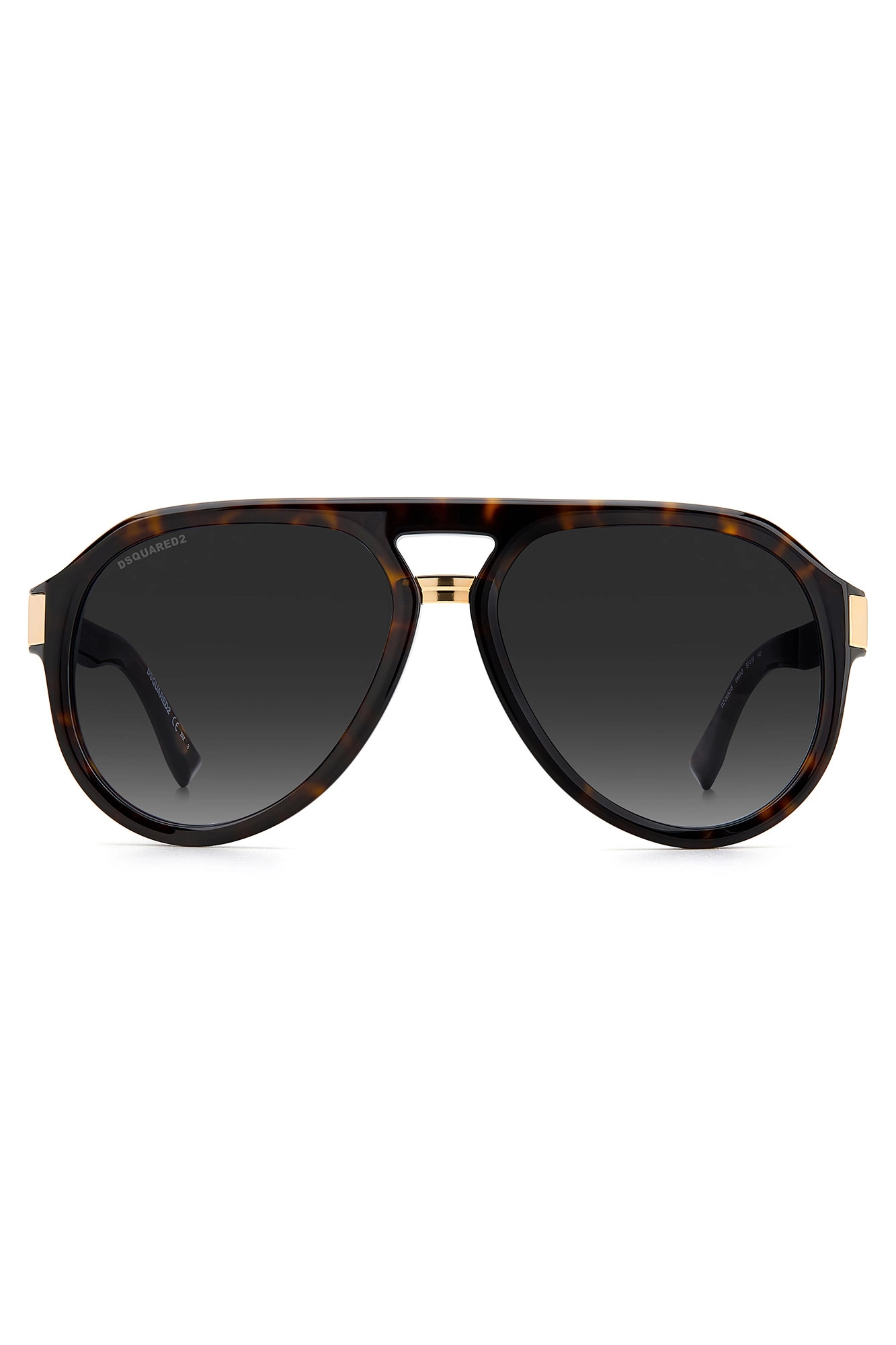Okulary marki Dsquared2 w brązowym kolorze. Na całości motyw zwierzęcy. Wyprofilowane, złoto-brązowe zauszniki z tłoczonym monogramem marki, zwieńczone charakterystycznym motywem liścia klonowego. Sygnowane szkła w ciemnoszarym kolorze.