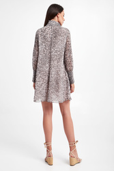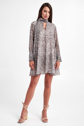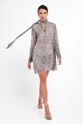 Sukienka marki Patrizia Pepe w kolorze szarym. Fason typu regular o długości mini. Na całości wzór z motywem zwierzęcym z nieregularnie rozmieszczoną nazwą marki. Długie rękawy zakończone szerokimi mankietami, zapinanymi na sygnowane guziki. Dekolt v-neck, ze stójką zapinaną na haftki. Przy stójce dodatkowy materiał, który po owinięciu wokół szyi daje efekt szala. Sukienka posiada podszewkę. Wykonana z delikatnej, półtransparentnej tkaniny, pochodzącej z recyklingu.
