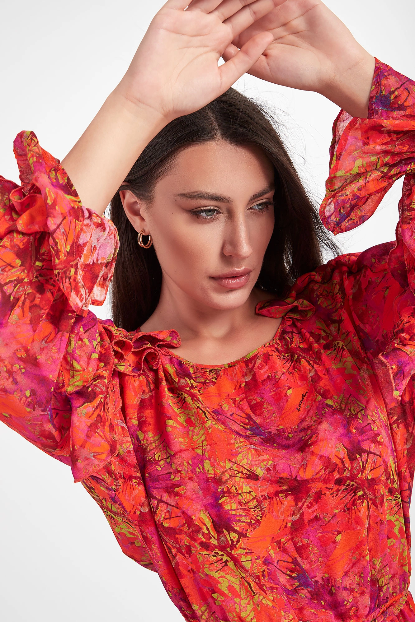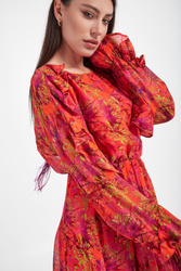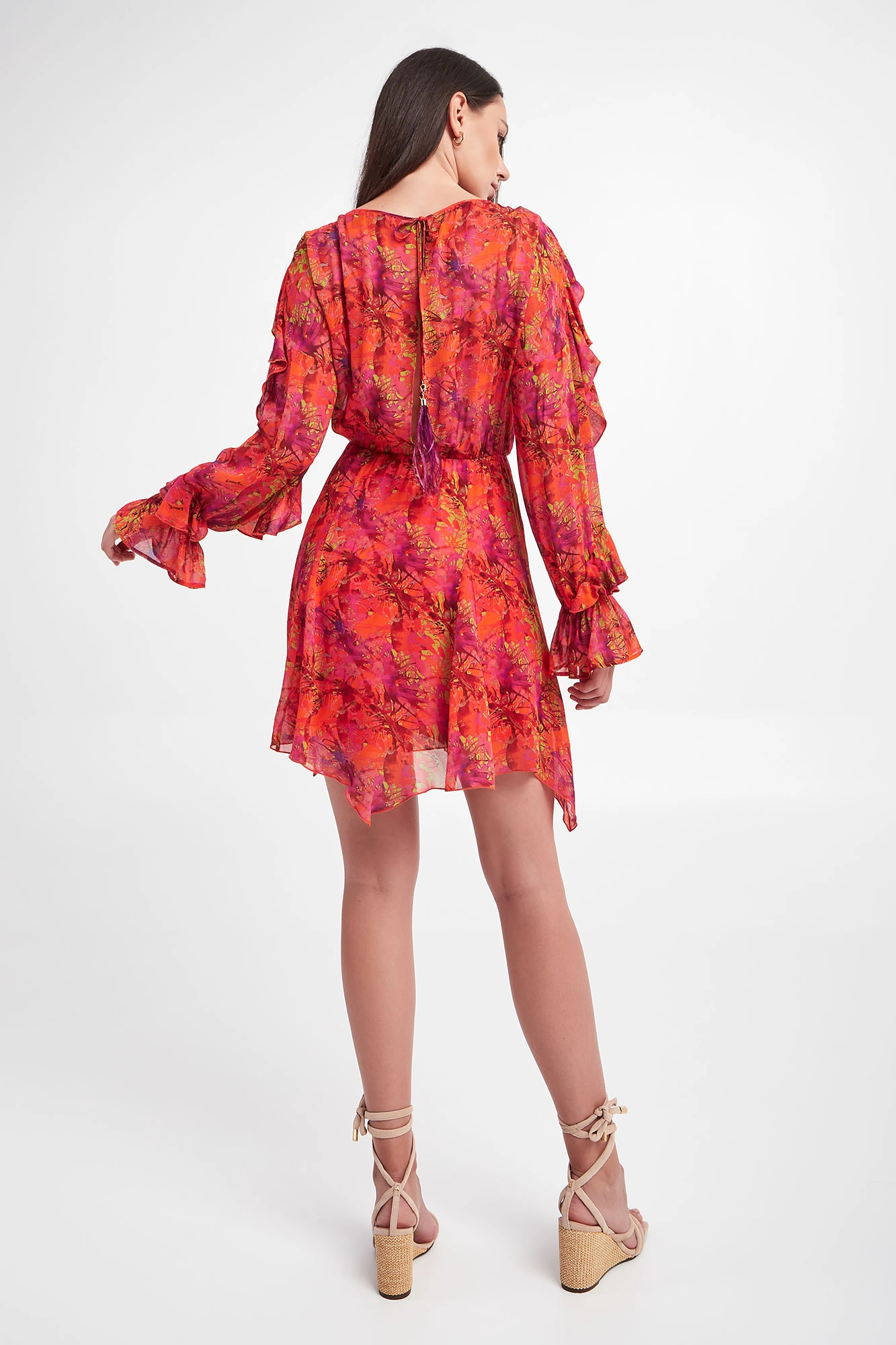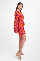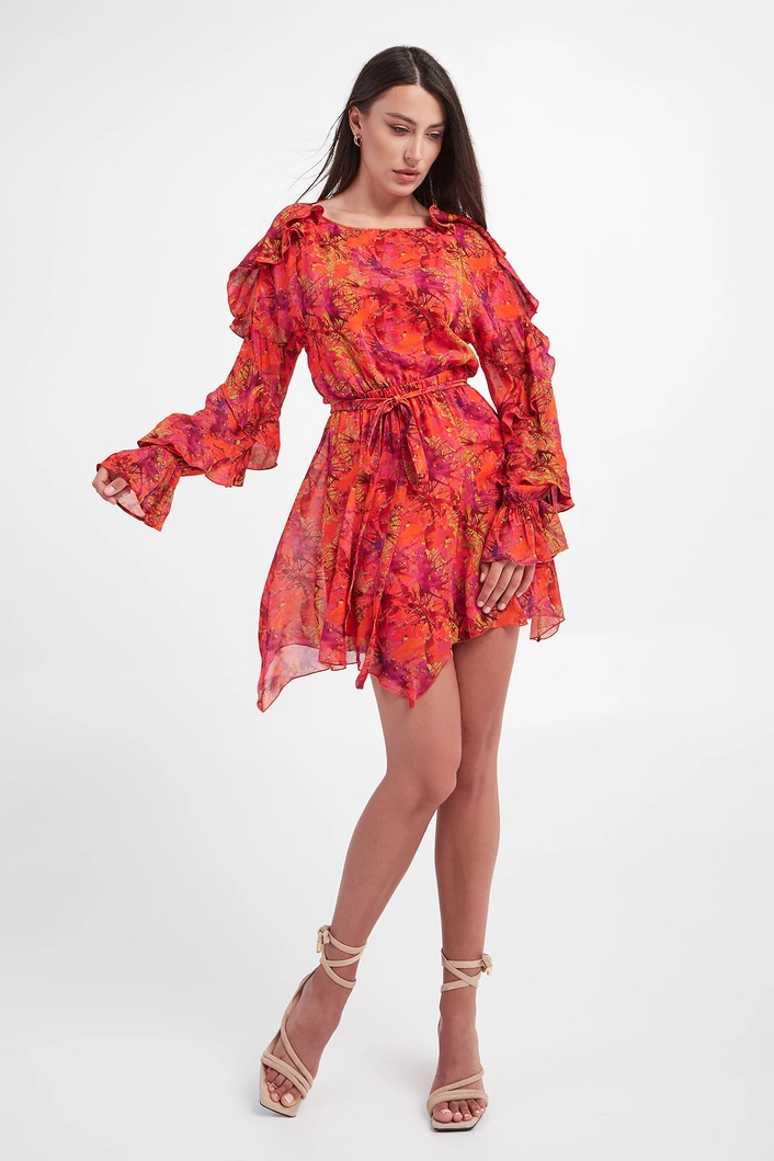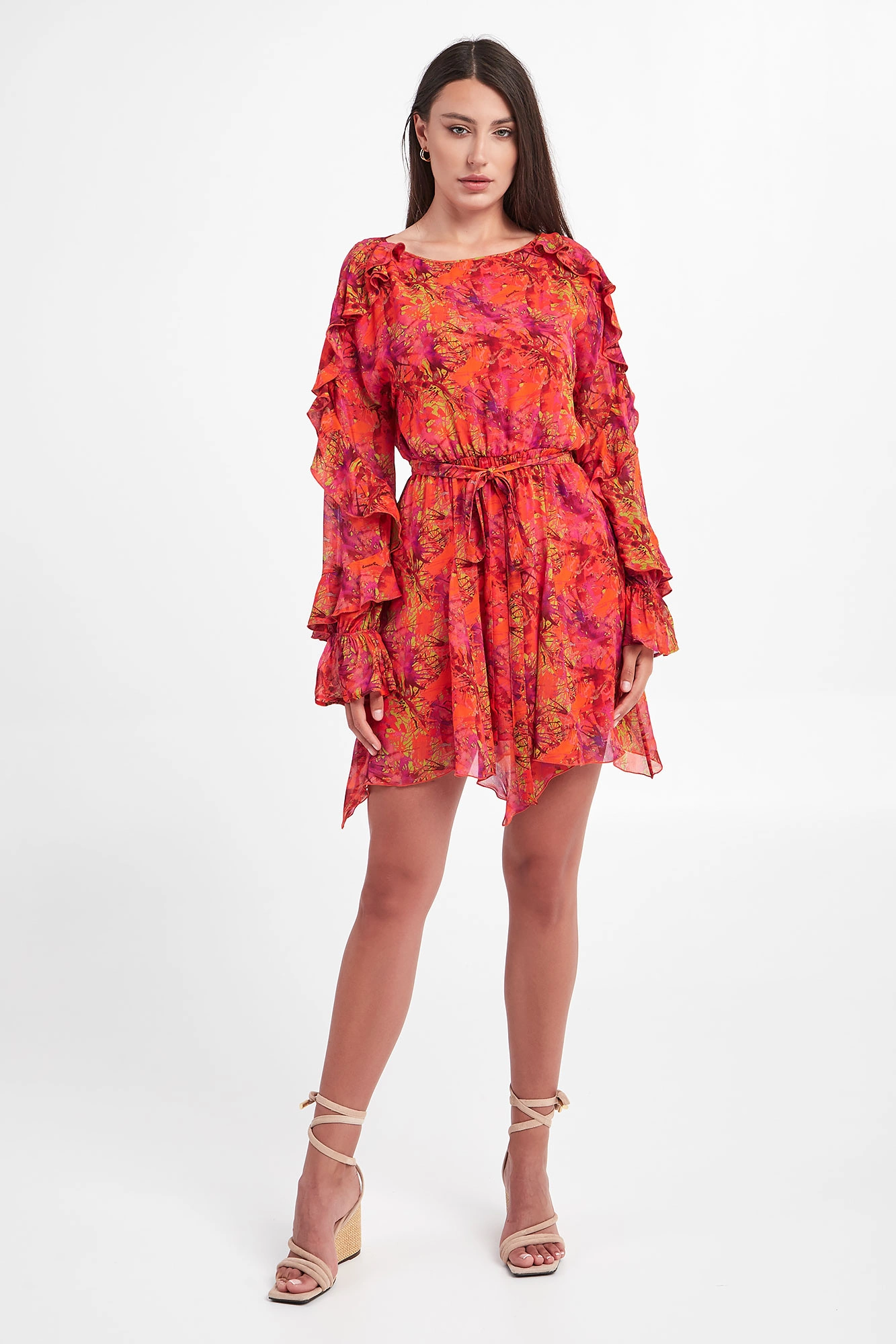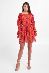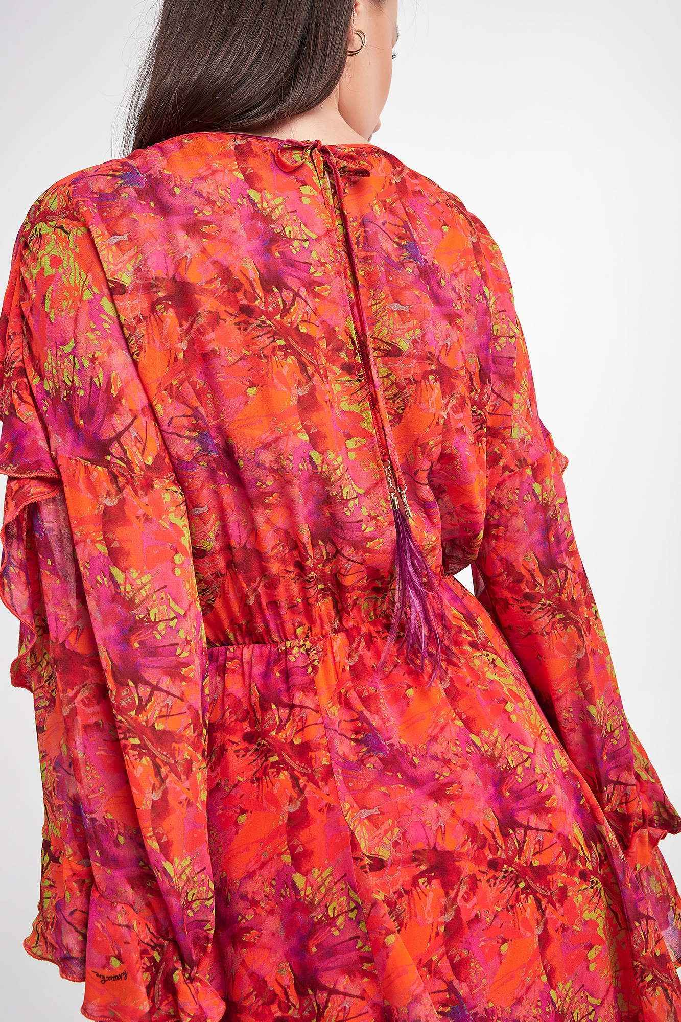 Sukienka marki Patrizia Pepe w pomarańczowym kolorze. Na całości wielokolorowy wzór z nieregularnie rozmieszczoną nazwą marki. Fason regular fit. Długie rękawy z licznymi falbanami. Rozcięcie na plecach zawiązywane na troczki - jeden zakończony złotym owadem, a drugi fioletowymi piórami. Talia odcięta, ze ściągaczem. Dół sukienki z podszewką. W zestawie materiałowy pasek, który można przewiązać w talii. Sukienka wykonana w stu procentach z wiskozy.