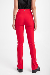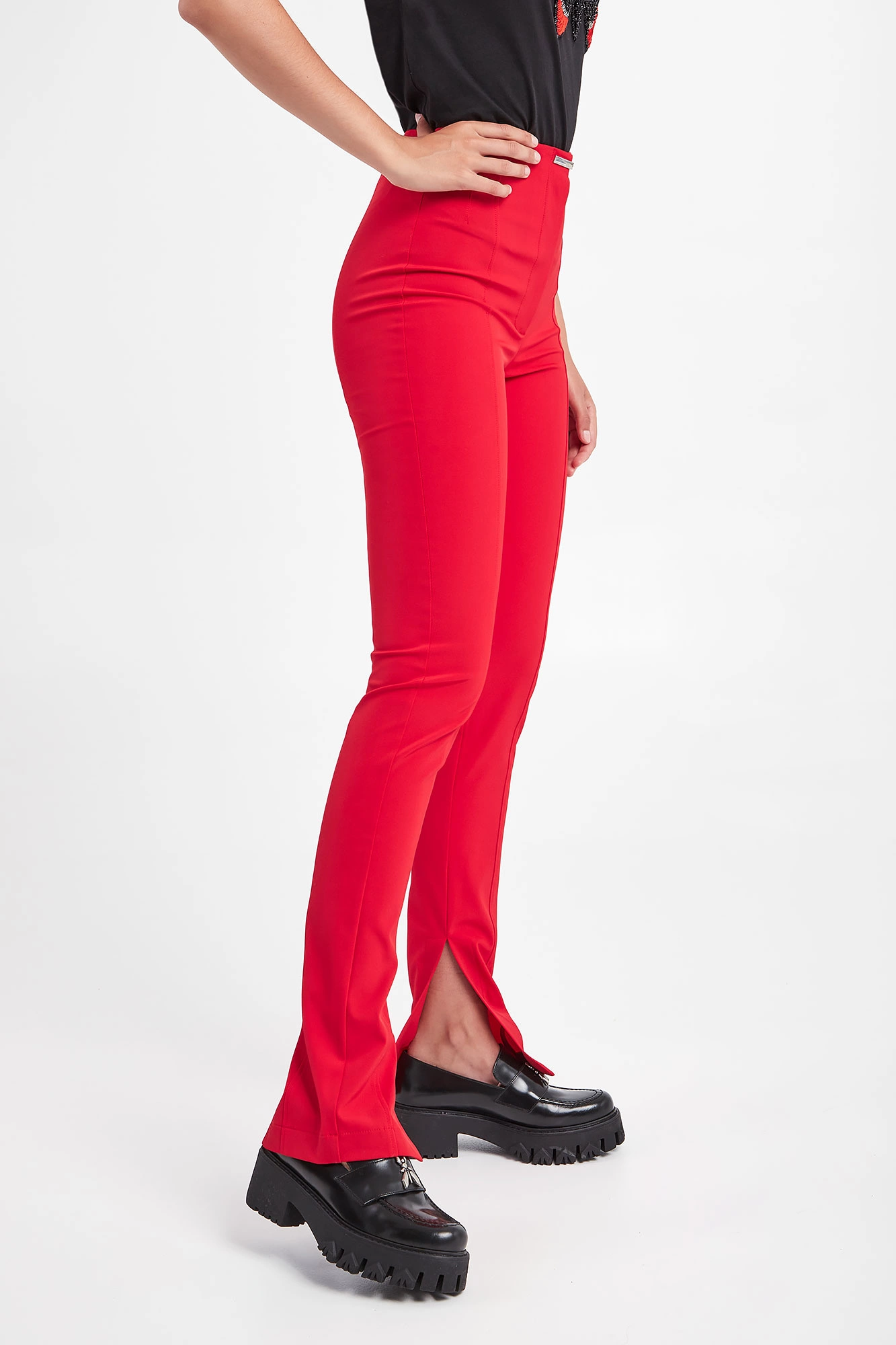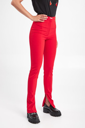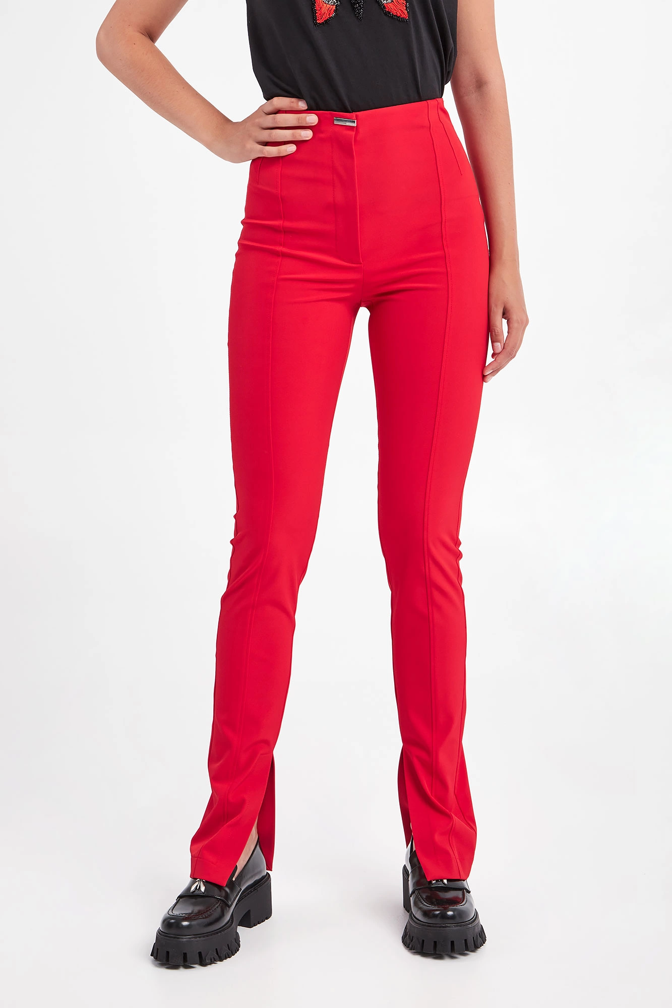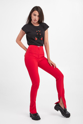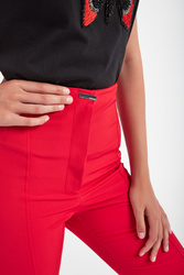 Spodnie marki Patrizia Pepe w czerwonym kolorze. Fason typu slim fit. Zapinane na metalowy, prostokątny, sygnowany zatrzask. Posiadają przeszyty kant. Na dole nogawek rozcięcia od wewnętrznej strony. Z tyłu srebrna, metalowa aplikacja w postaci logo marki. W pasie elastyczny ściągacz od wewnętrznej strony.