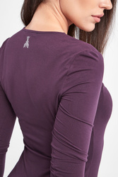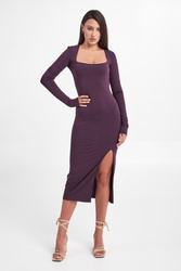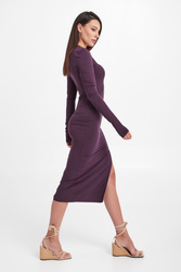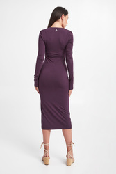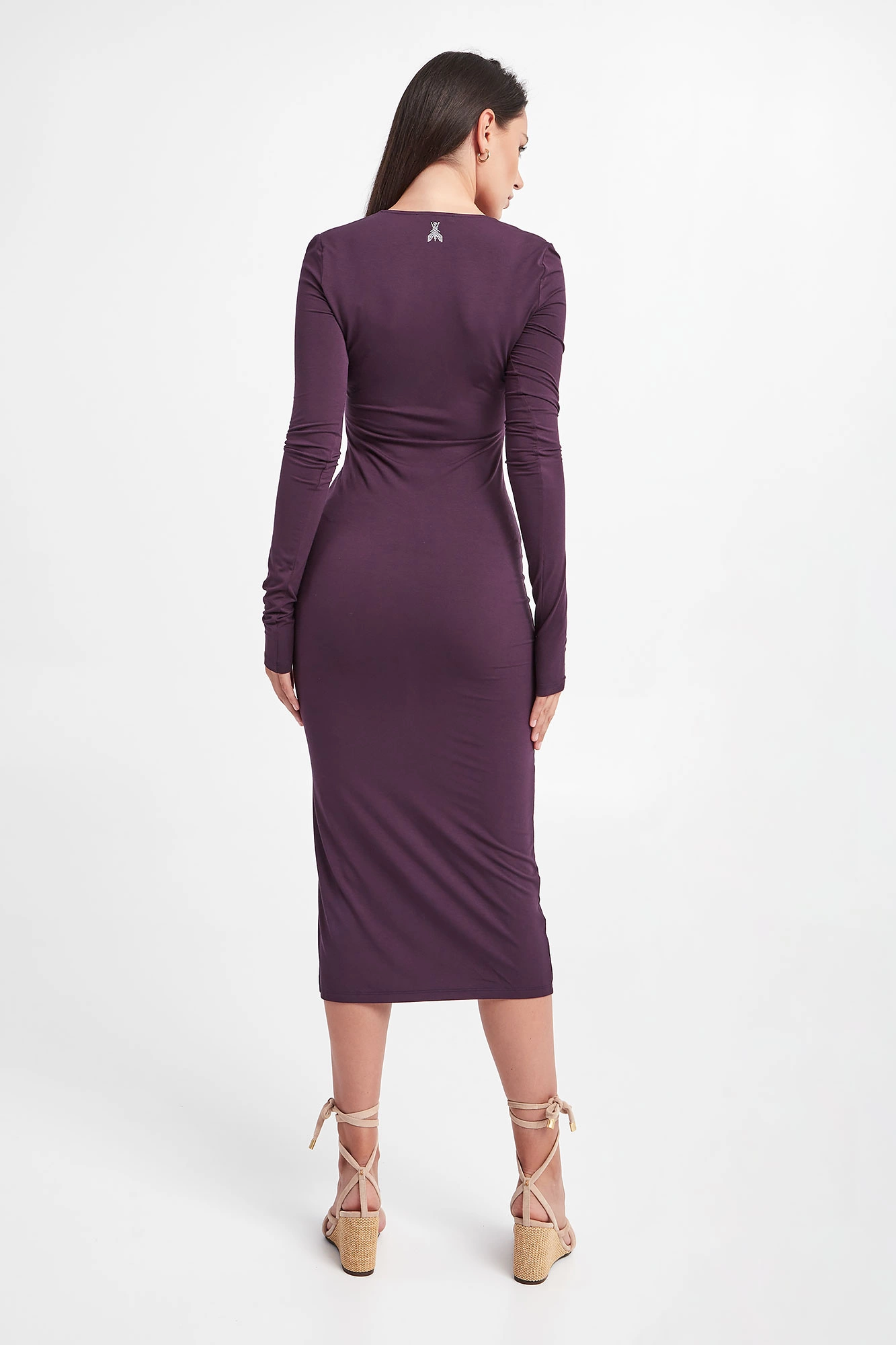 Sukienka marki Patrizia Pepe w kolorze śliwkowym. Fason typu slim, długość midi. Głęboki, okrągły dekolt. U dołu efektowne rozcięcie. Z tyłu, pod linią karku aplikacja z kryształków w postaci owadziego logo marki. Wykonana w większości z wiskozy.