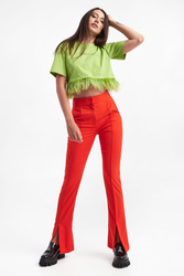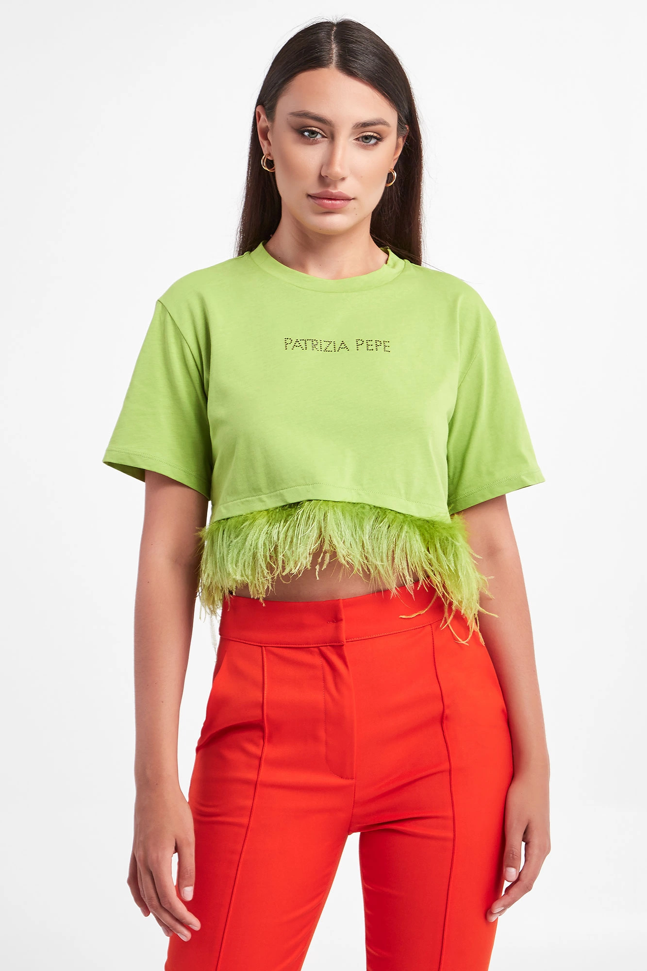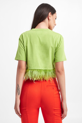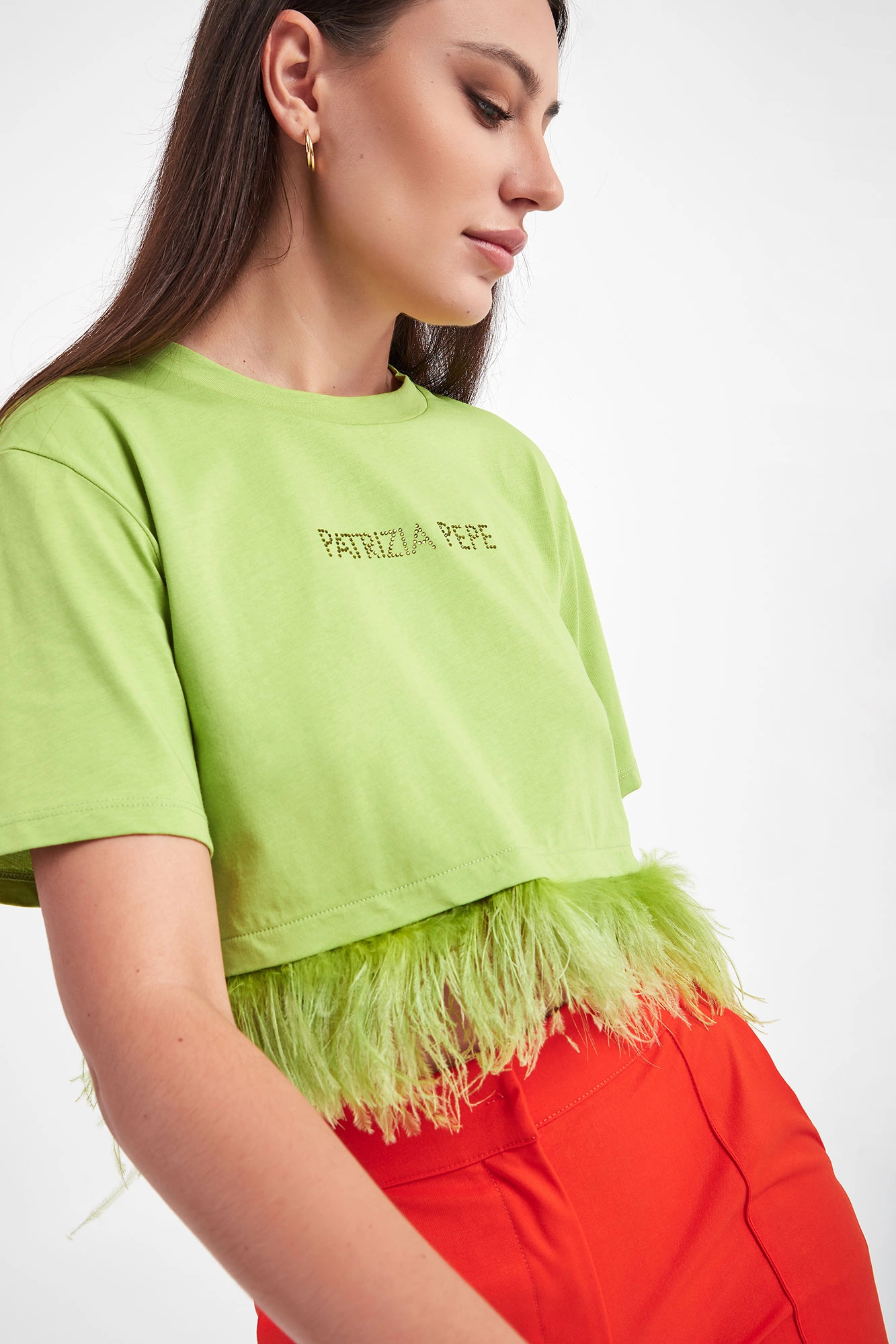 T-shirt marki Patrizia Pepe w kolorze jasnozielonym. Fason typu cropped. Na przodzie aplikacja z kryształków w postaci nazwy marki. Dekolt typu o-neck zakończony elastycznym ściągaczem. Dół wykończony falbaną zielonych piór. T-shirt wykonany ze stuprocentowej bawełny.