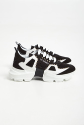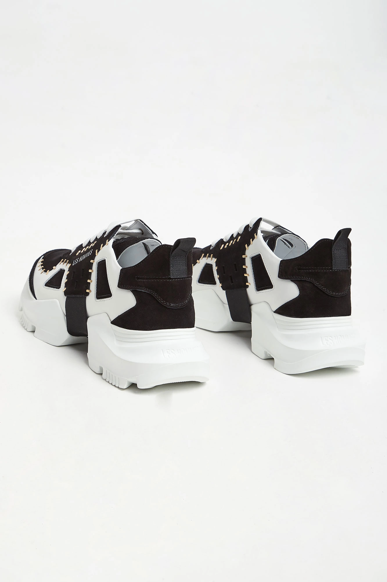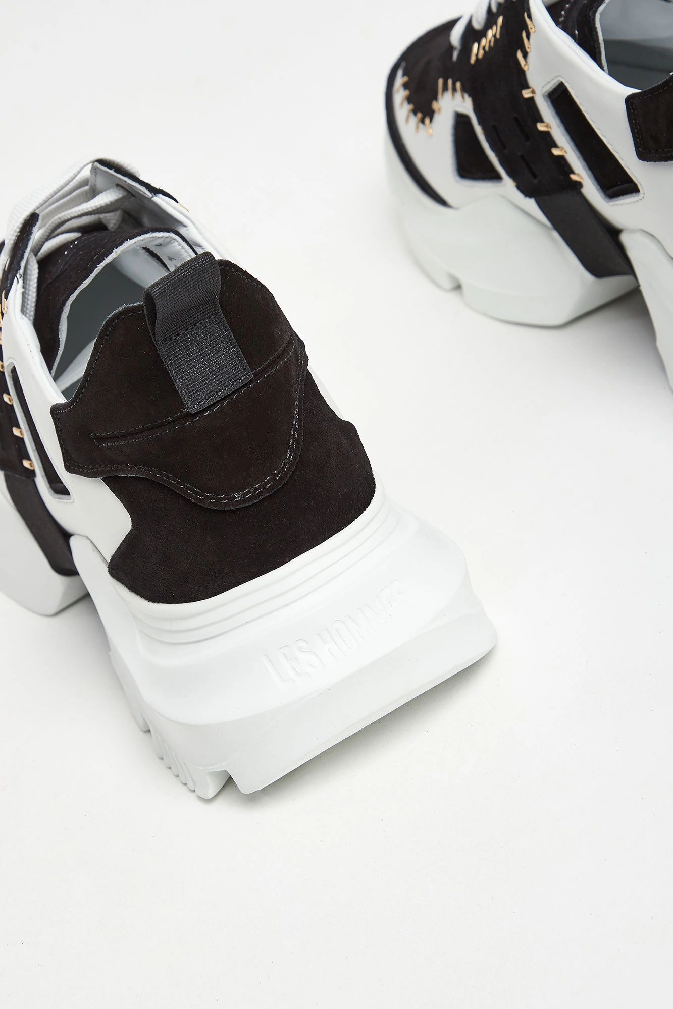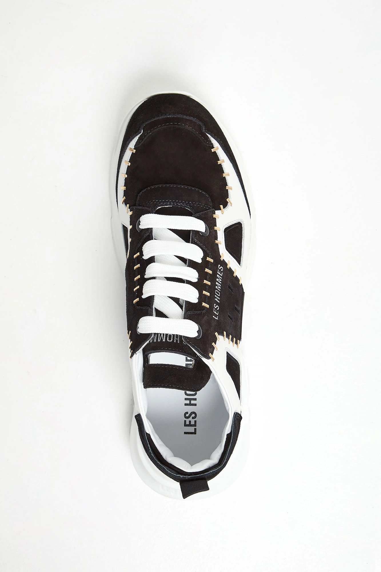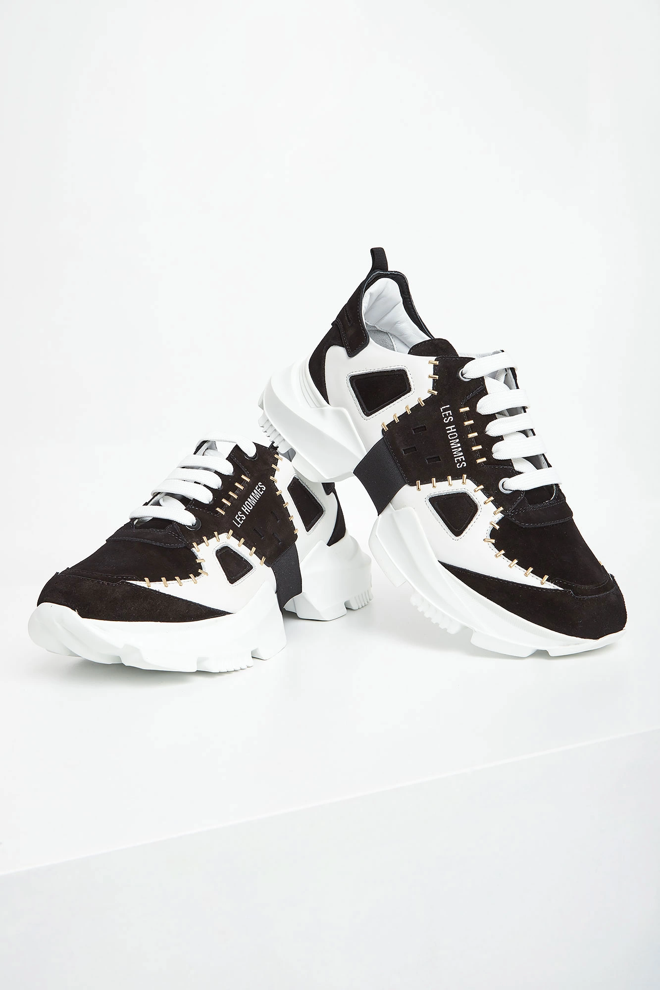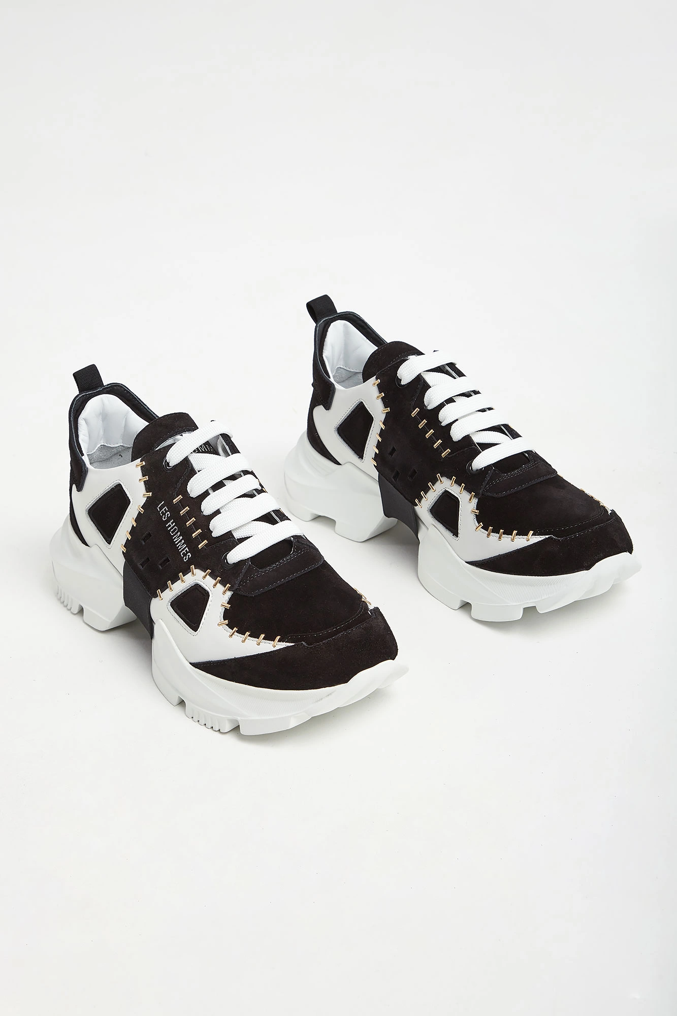 Sneakersy marki Les Hommes w czarnym kolorze. Wykonane ze skóry naturalnej. Na całości zamszowa skóra i gładkie wstawki w białym kolorze. Z przodu ozdobne złote detale. Język z wycięciem. Sznurowane. Okrągły nosek. Elastyczny pas przechodzący przez podeszwę. Z tyłu pętelka ułatwiająca zakładanie. Tłoczona, sygnowana podeszwa w białym kolorze. Biała wyściółka. Wyprodukowane we Włoszech.