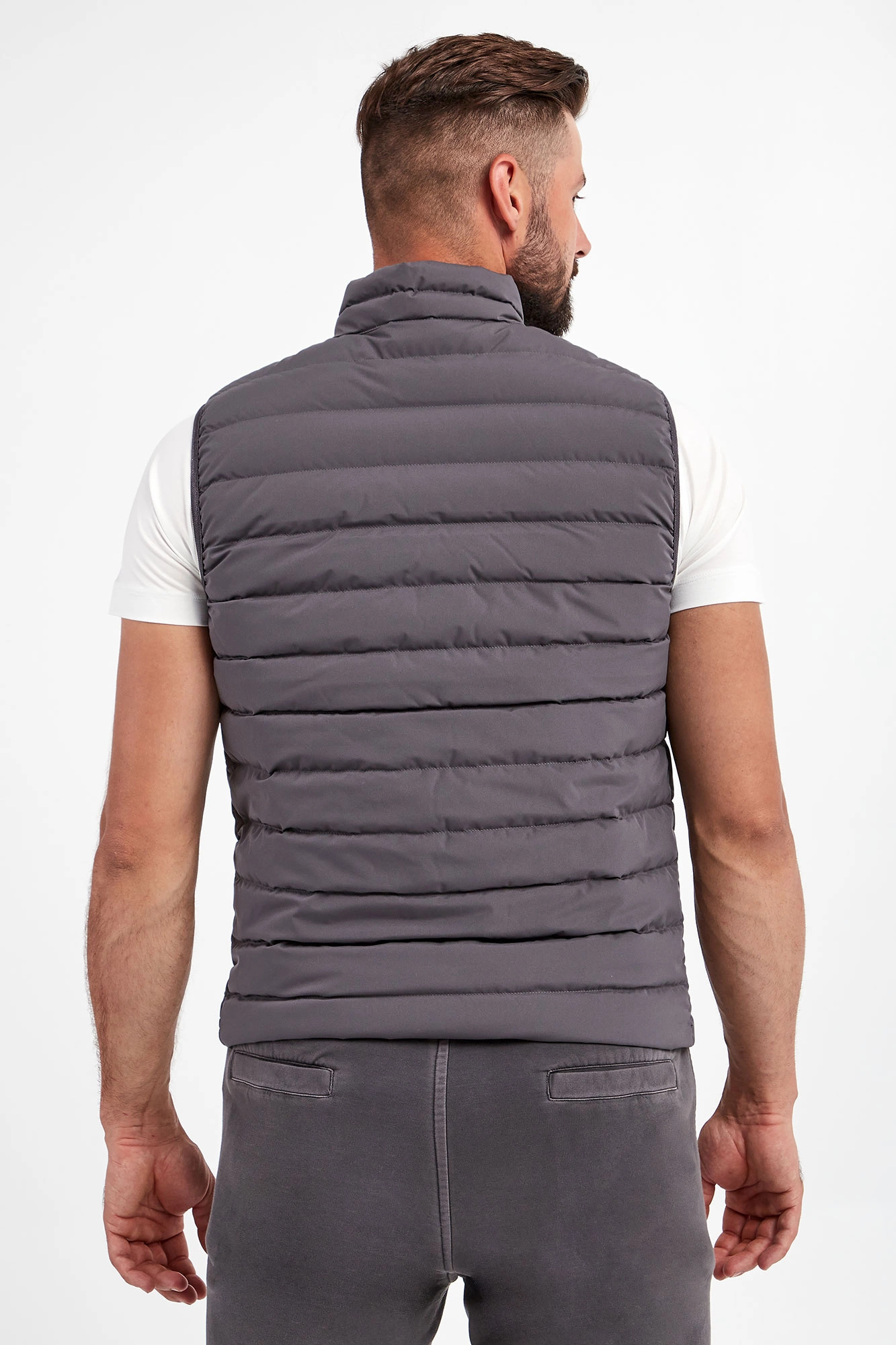Kamizelka marki Emporio Armani w grafitowym kolorze. Na całości pikowana. Fason regular fit. Zapinana za pomocą dwustronnego zamka z logowanymi zawieszkami. Z boku czarna naszywka z logo. Dekolt ze stójką. Dwie boczne zamykane kieszenie. Wewnątrz dodatkowe kieszenie.
