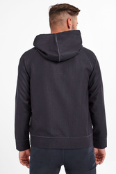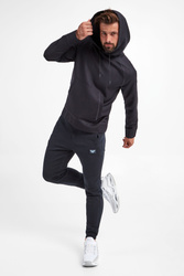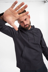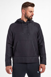 Bluza z kapturem marki Emporio Armani w granatowym kolorze. Fason regular fit. Rękawy typu raglan. Widoczne, dekoracyjne przeszycia. Kaptur regulowany za pomocą troczków. Długie, proste rękawy oraz dół wykończone ściągaczami. Z przodu duża kieszeń typu kangurka. W większości wykonana z lnu.