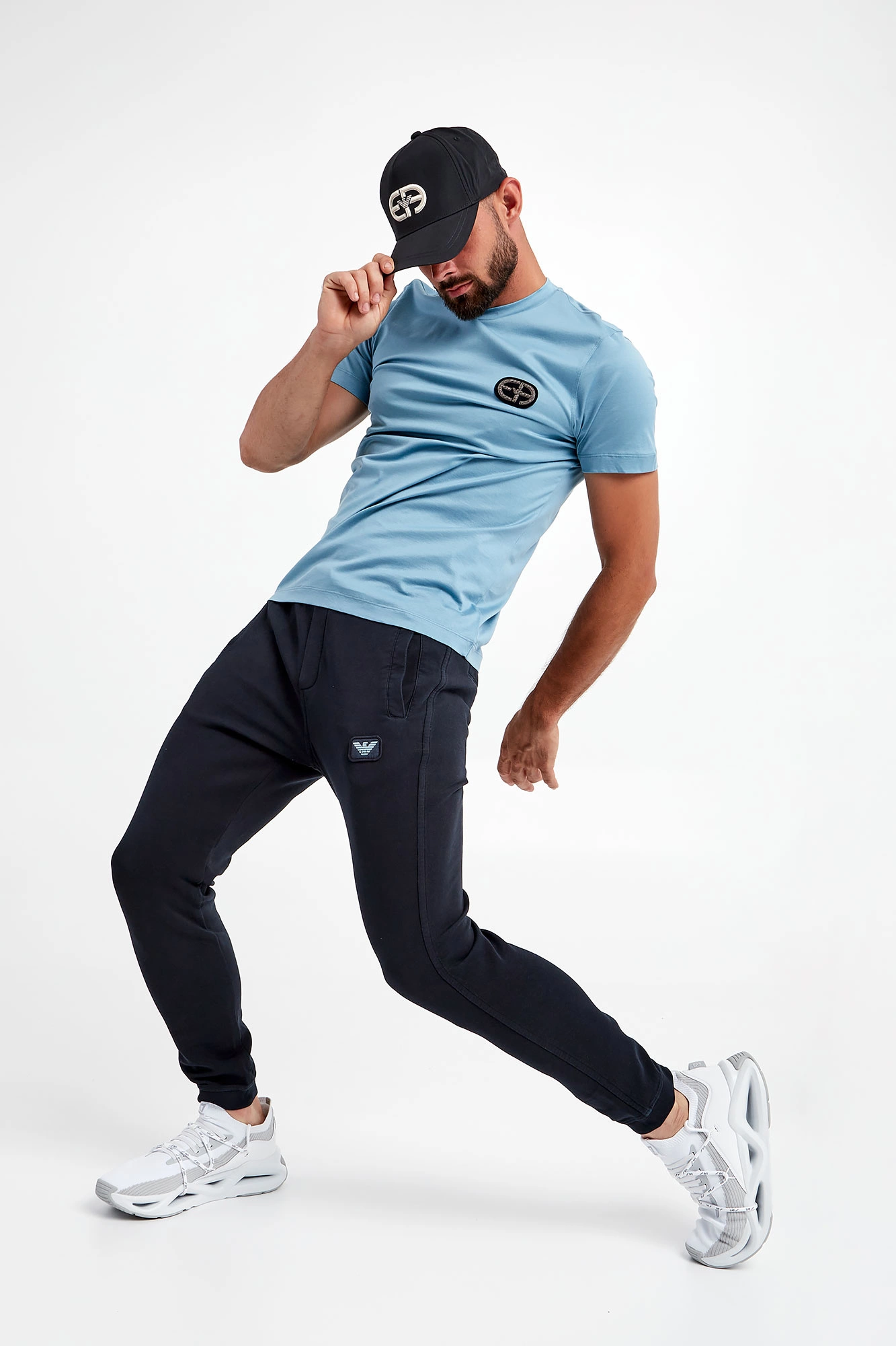 T-shirt marki Emporio Armani w błękitnym kolorze. Fason typu slim. Dekolt typu o-neck wykończony elastycznym ściągaczem. Krótkie rękawy i dół wykończone lamówką. Z przodu aplikacja z logo marki w czarno-szarym kolorze. Wykonany z miękkiej, przyjemnej w dotyku mieszanki lyocellu i bawełny.