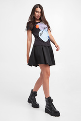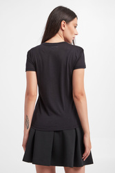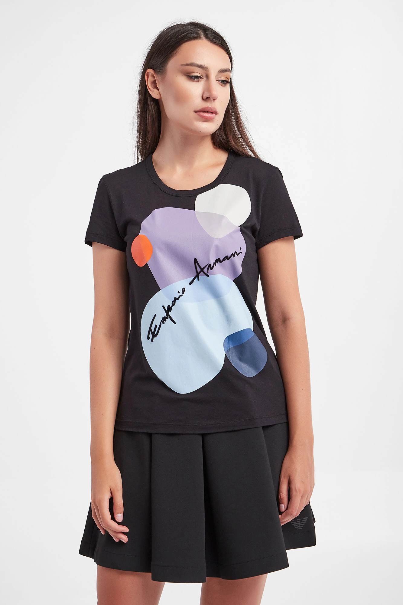 T-shirt marki Emporio Armani w czarnym kolorze. Z przodu duży kolorowy nadruk i haft z nazwą marki. Fason typu slim fit. Dekolt typu o-neck zakończony lamówką. Krótkie rękawy wykończone przeszyciem. Wykonany z mieszanki modalu i bawełny.