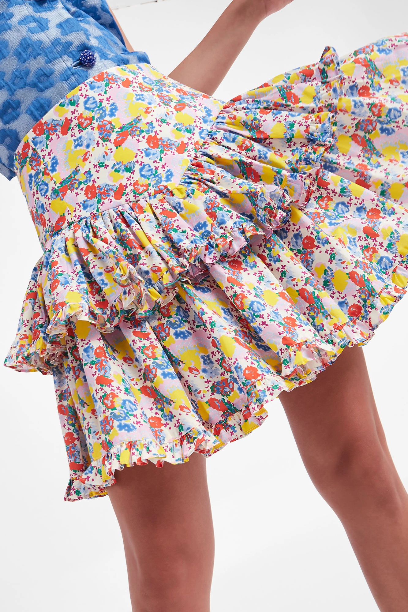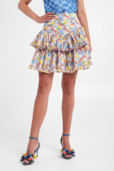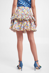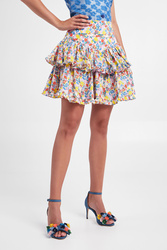 Spódnica z falbanami marki Custommade. Na całości wielokolorowy wzór z motywem kwiatów. Rozkloszowana o długości mini. Zapinana po boku za pomocą zamka błyskawicznego. Dół wykończony dwuwarstwową falbaną. Wykonana z popelinowej, bawełny organicznej.